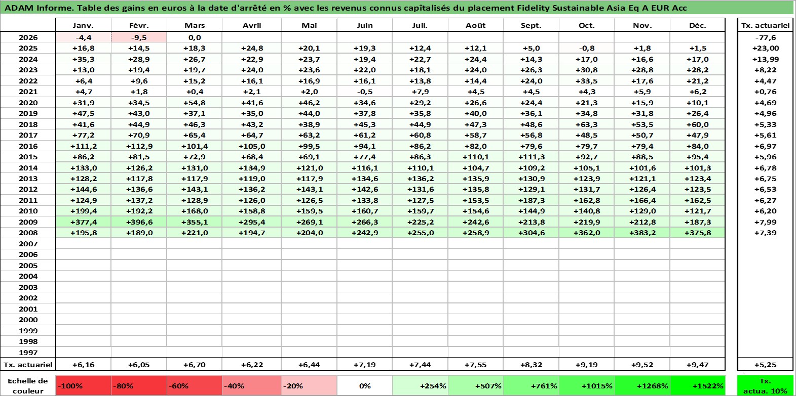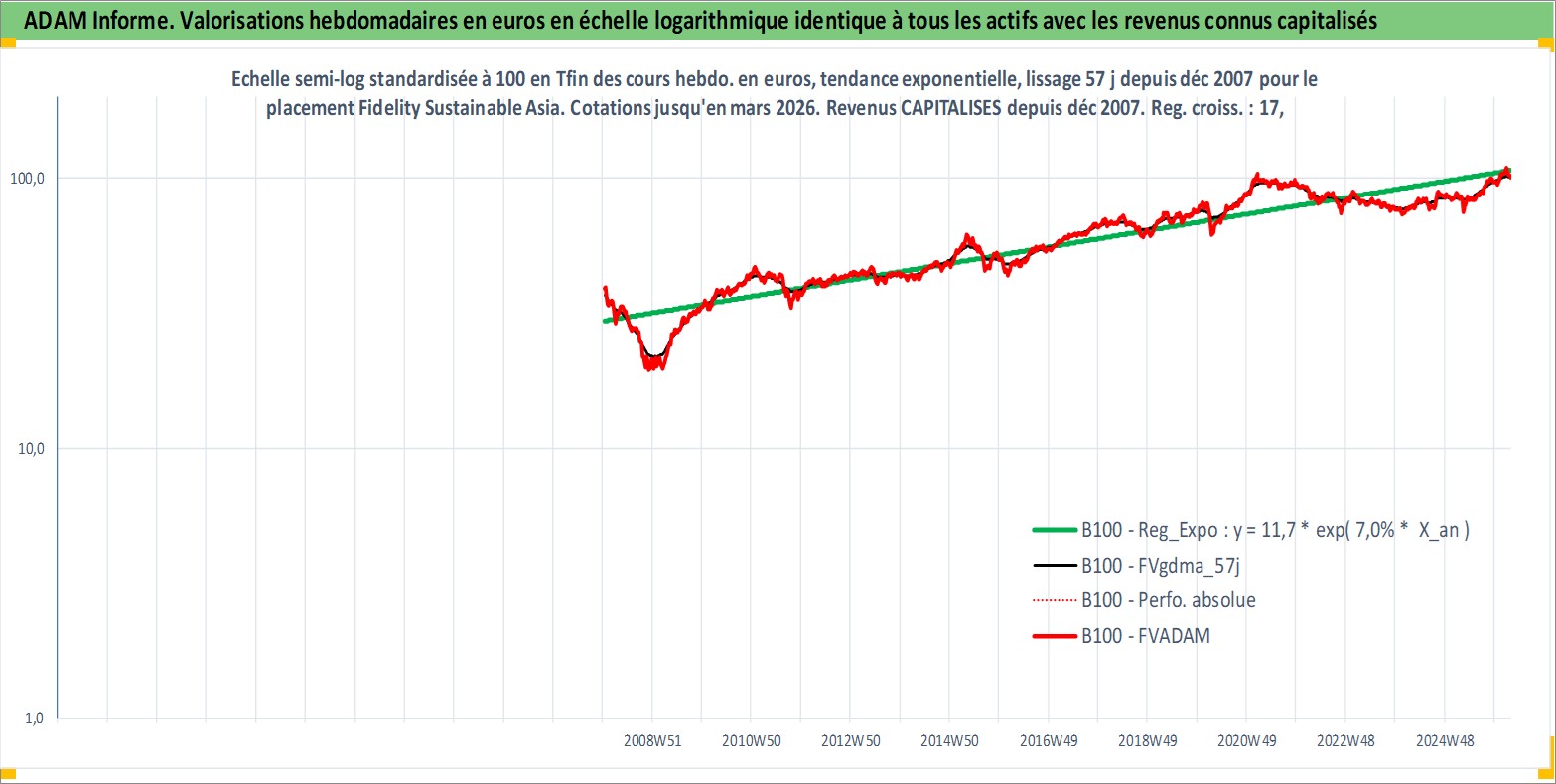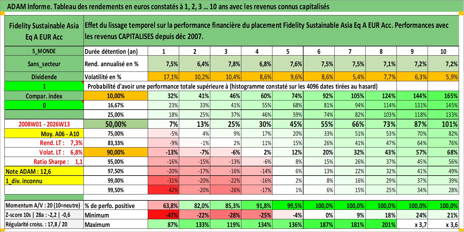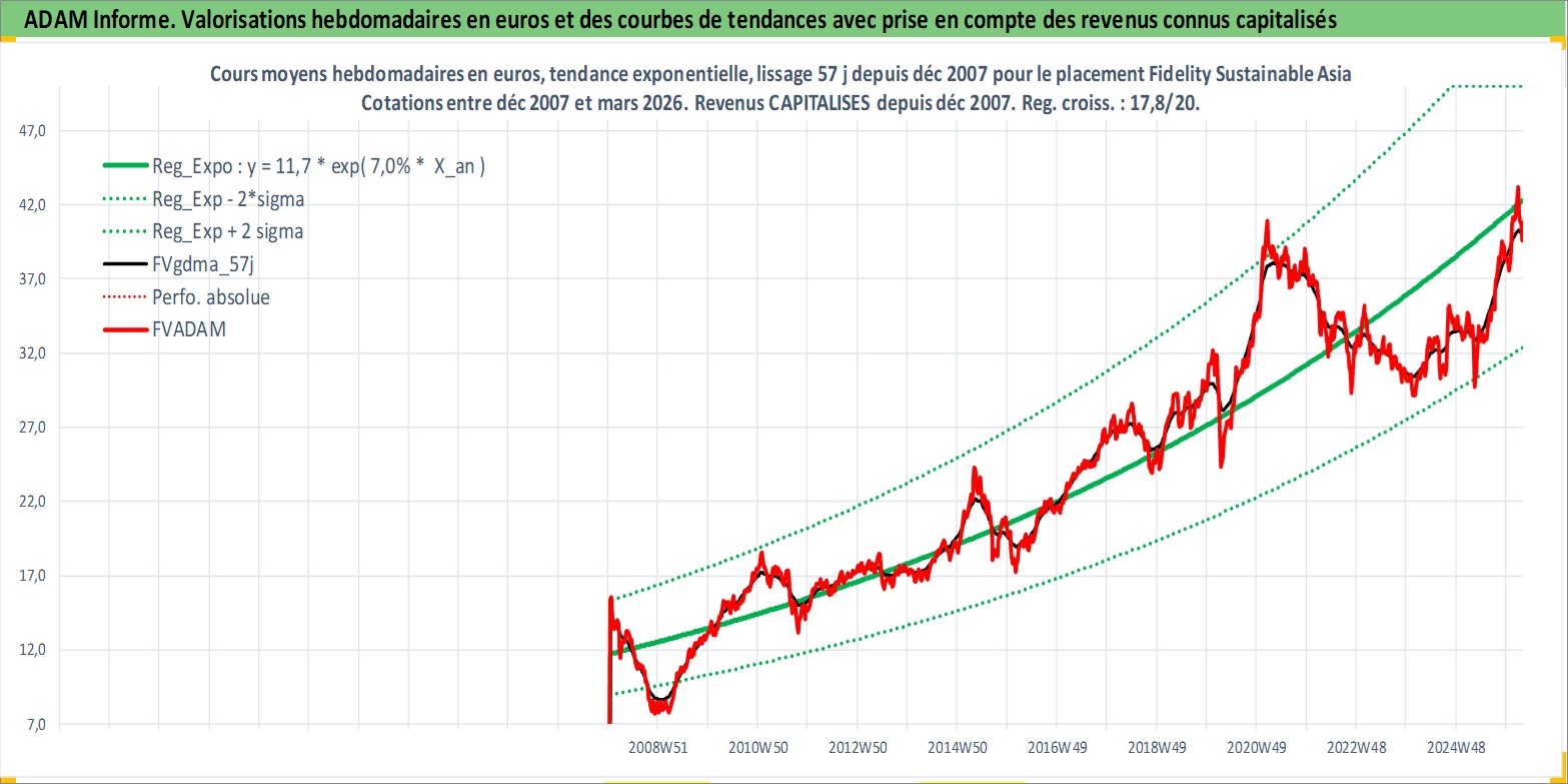 Site dédié aux investisseursPage dédiée sur site financeAnalyse des valorisations hebdomadaires du fonds Fidelity Sustainable Asia Eq A EUR Acc. Cet actif est cote en EUR. Les valorisations couvrent les semaines 2008W01 a 2026W13. Les revenus de cet actif financier sont pris en compte depuis la semaine 2008W01. La note globale ESG de cet actif est estimee a 3.0 (apres rebasage entre 0 et 20).