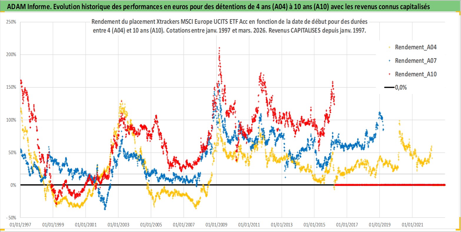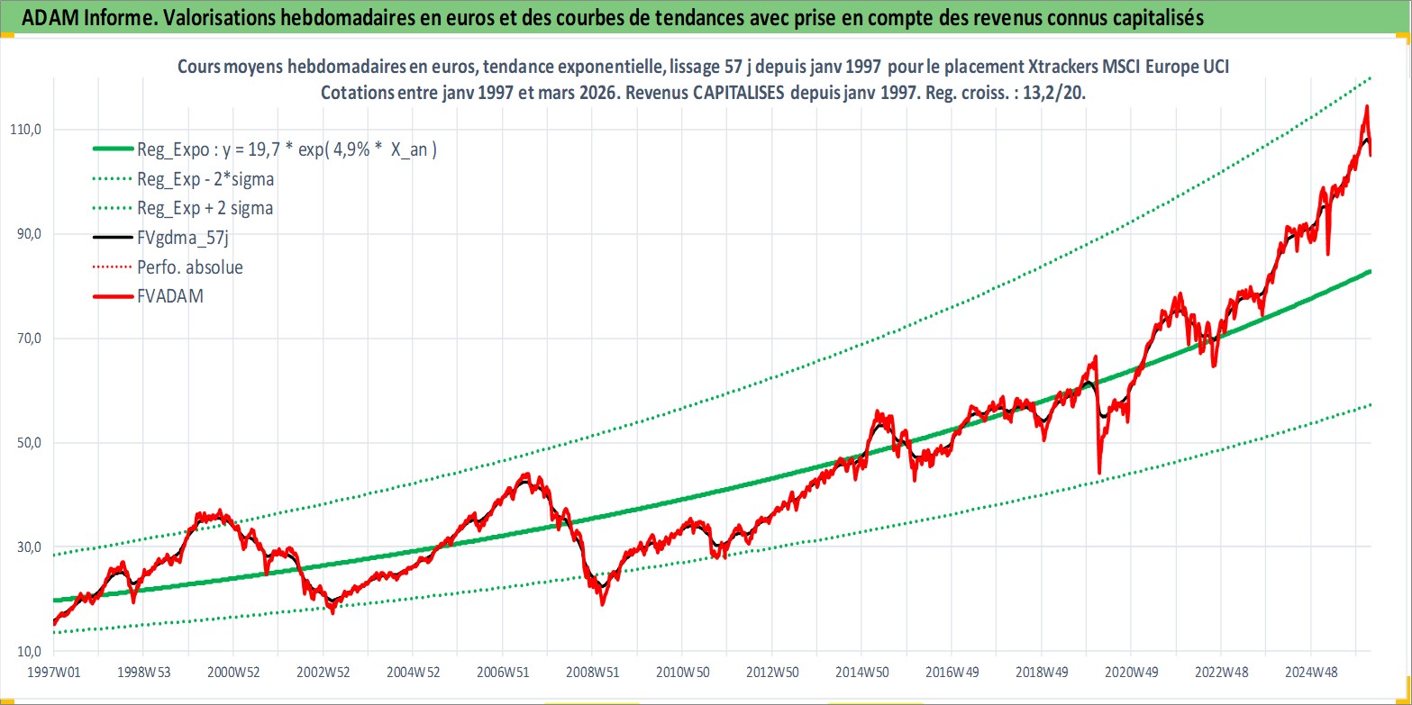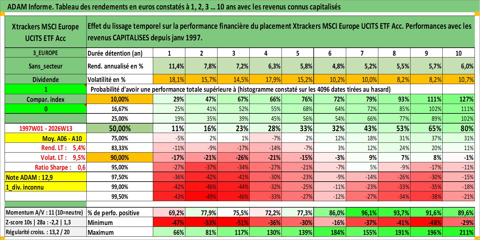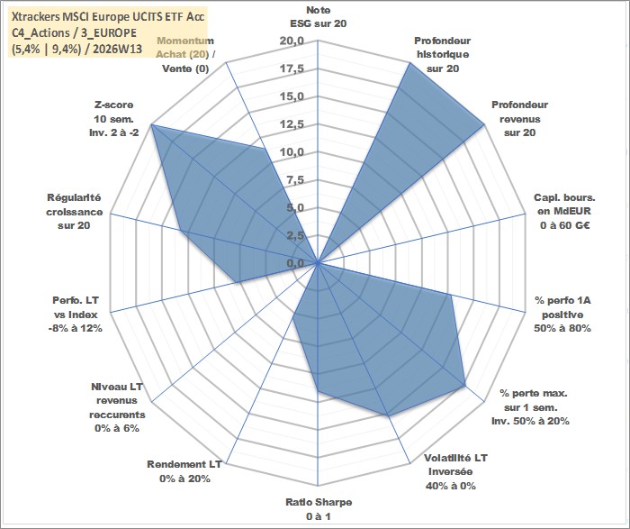 Site dédié aux investisseursPage dédiée sur site financeAnalyse des valorisations hebdomadaires du fonds Xtrackers MSCI Europe UCITS ETF Acc. Cet actif est cote en USD. Les valorisations sont en contrevaleur EURO et couvrent les semaines 1997W01 a 2026W13. Les revenus de cet actif financier sont pris en compte depuis la semaine 1997W01. La note ESG de cet actif n'est pas connue.