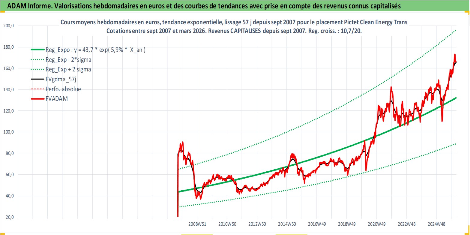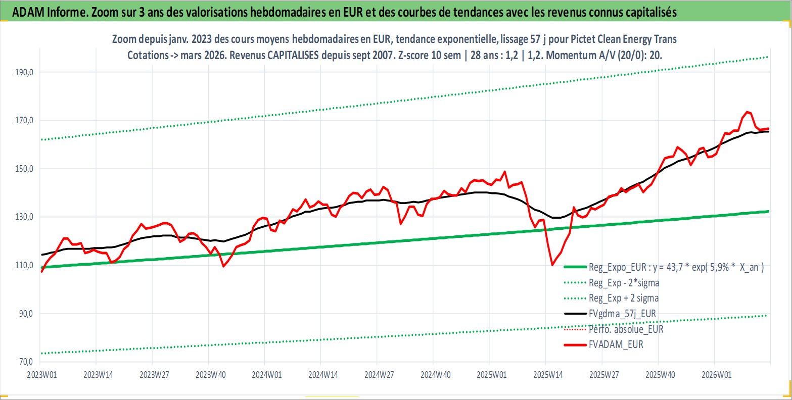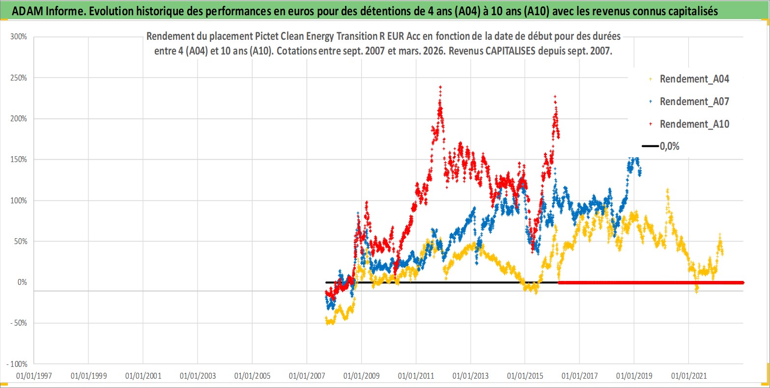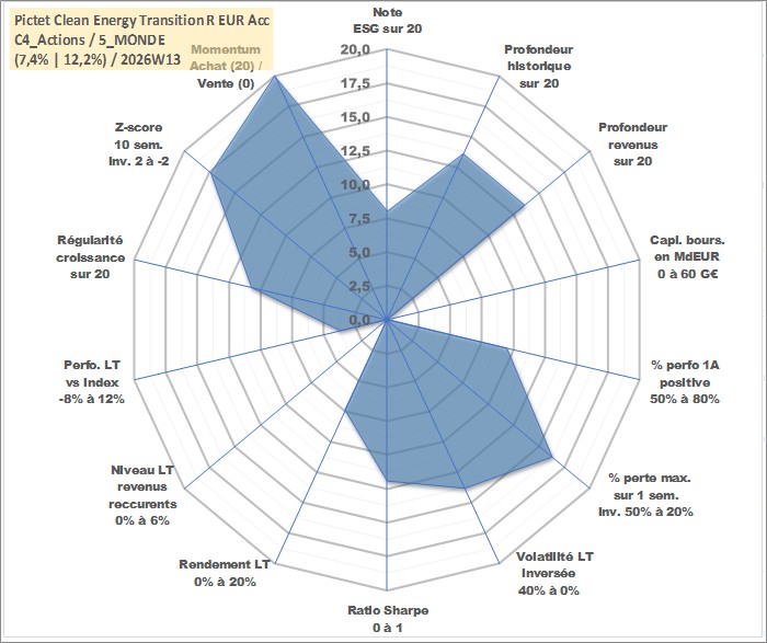 Site dédié aux investisseursPage dédiée sur site financeAnalyse des valorisations hebdomadaires du fonds Pictet Clean Energy Transition R EUR Acc. Cet actif est cote en EUR. Les valorisations couvrent les semaines 2007W36 a 2026W13. Les revenus de cet actif financier sont pris en compte depuis la semaine 2007W36. La note globale ESG de cet actif est estimee a 8.0 (apres rebasage entre 0 et 20).