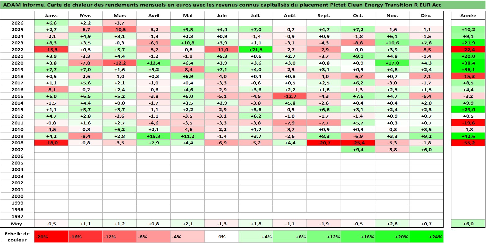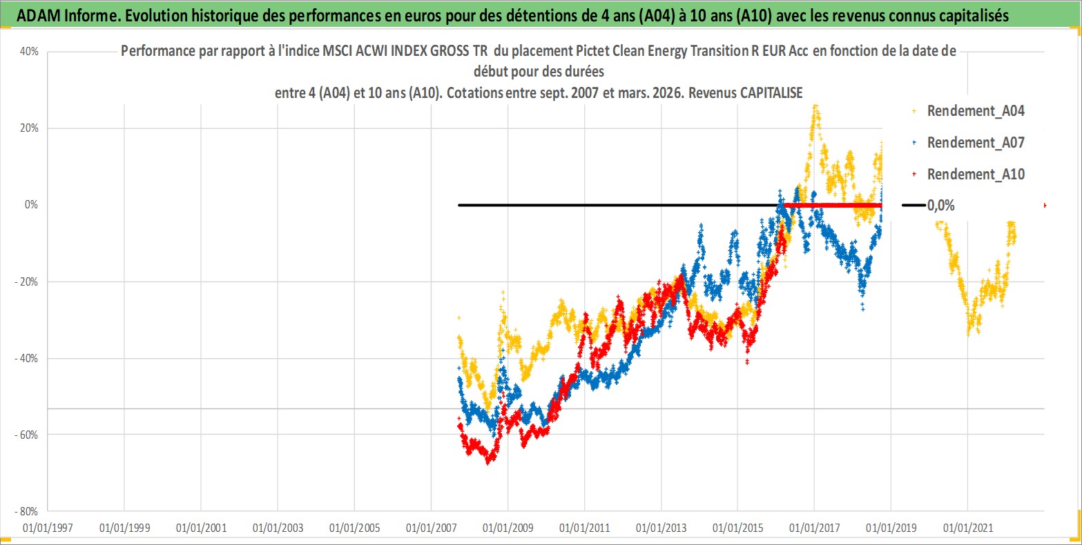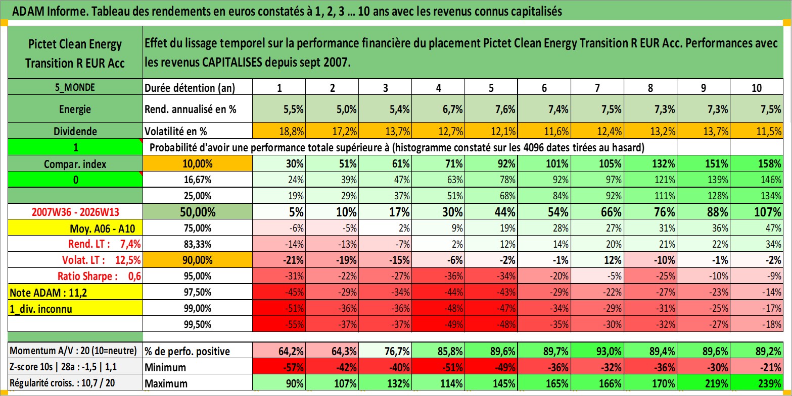 Site dédié aux investisseursPage dédiée sur site financeAnalyse des valorisations hebdomadaires du fonds Pictet Clean Energy Transition R EUR Acc. Cet actif est cote en EUR. Les valorisations couvrent les semaines 2007W36 a 2026W13. Les revenus de cet actif financier sont pris en compte depuis la semaine 2007W36. La note globale ESG de cet actif est estimee a 8.0 (apres rebasage entre 0 et 20).