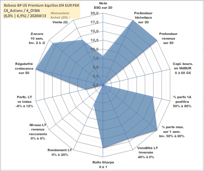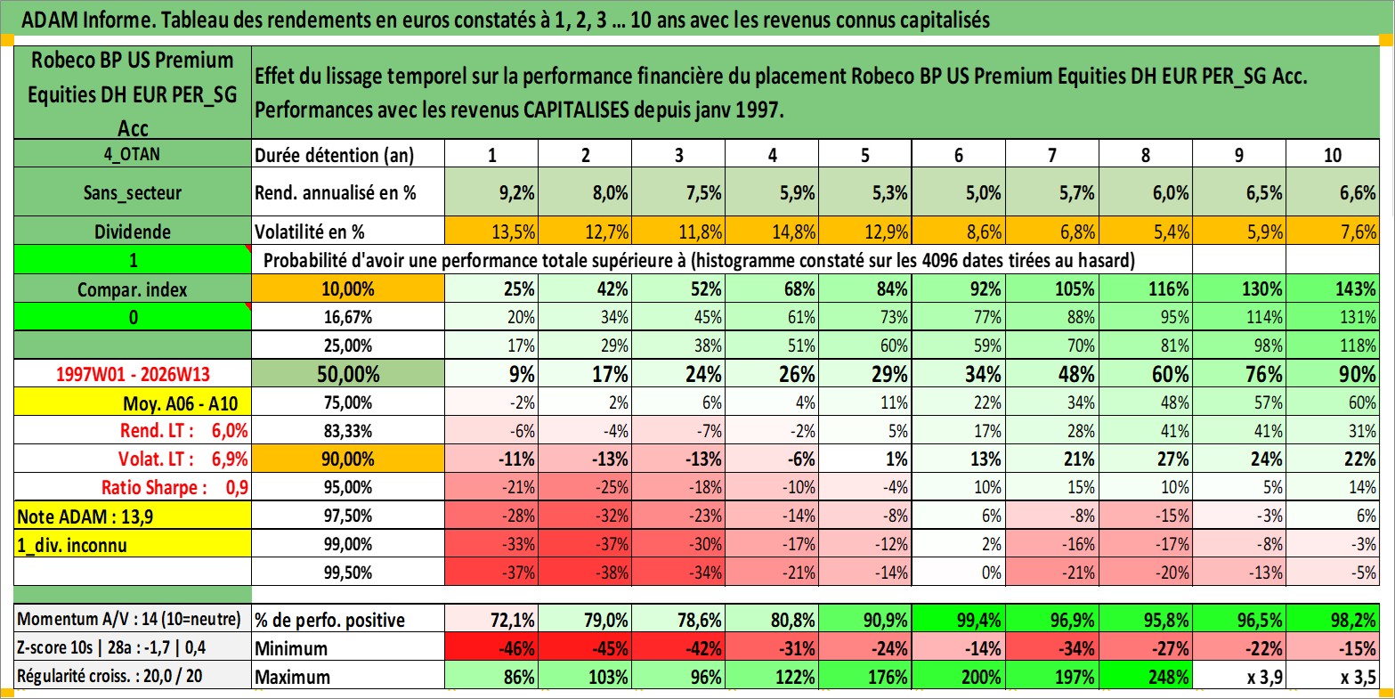 Site dédié aux investisseursPage dédiée sur site financeAnalyse des valorisations hebdomadaires du fonds Robeco BP US Premium Equities DH EUR PER_SG Acc. Cet actif est cote en EUR. Les valorisations couvrent les semaines 1997W01 a 2026W13. Les revenus de cet actif financier sont pris en compte depuis la semaine 1997W01. La note globale ESG de cet actif est estimee a 8.0 (apres rebasage entre 0 et 20).