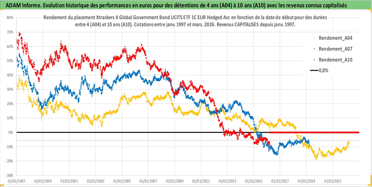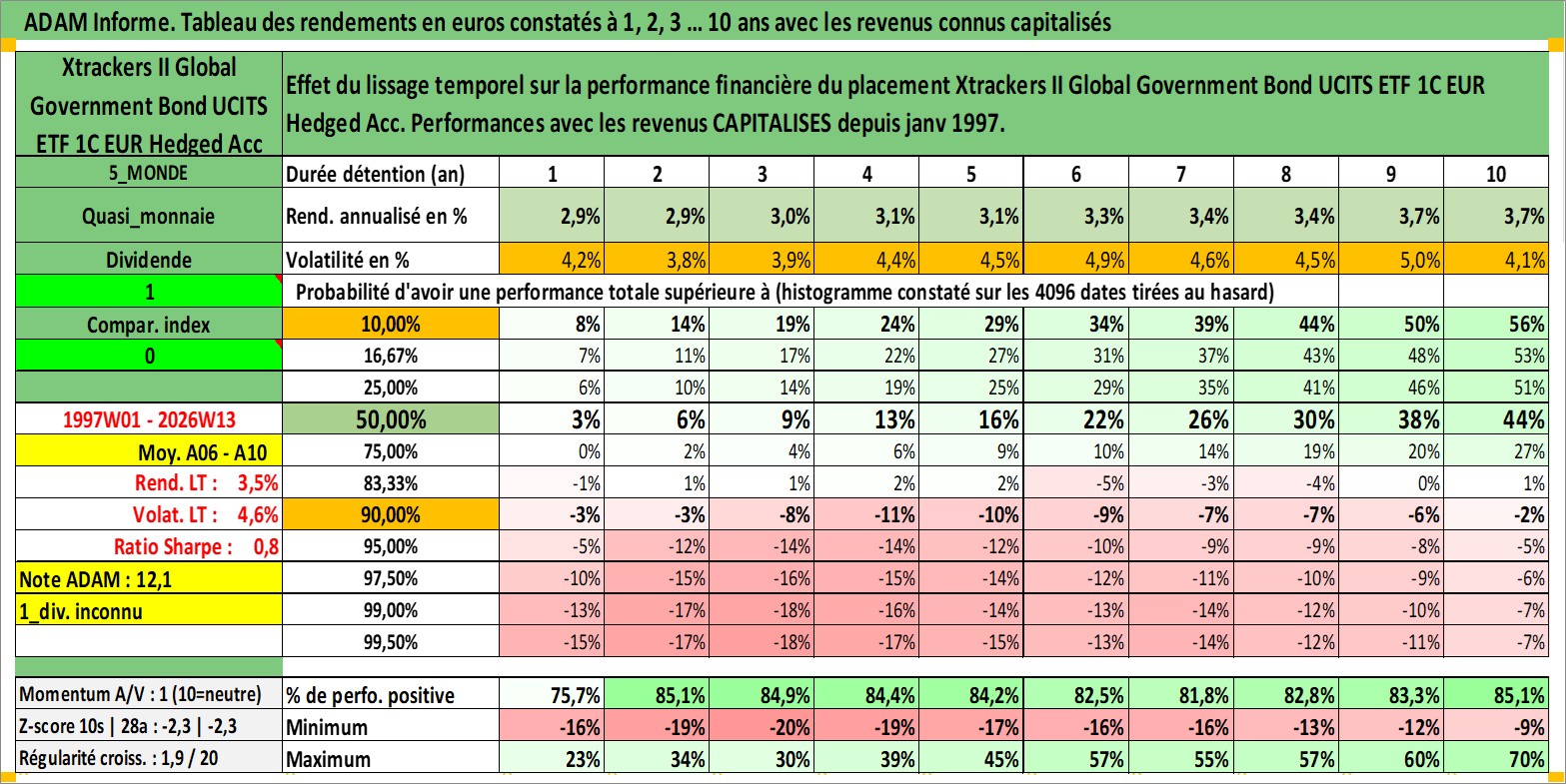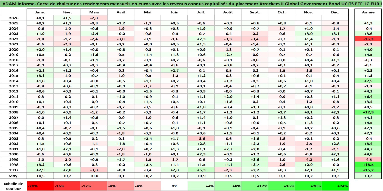 Site dédié aux investisseursPage dédiée sur site financeAnalyse des valorisations hebdomadaires du fonds Xtrackers II Global Government Bond UCITS ETF 1C EUR Hedged Acc. Cet actif est cote en EUR. Les valorisations couvrent les semaines 1997W01 a 2026W13. Les revenus de cet actif financier sont pris en compte depuis la semaine 1997W01. La note ESG de cet actif n'est pas connue.