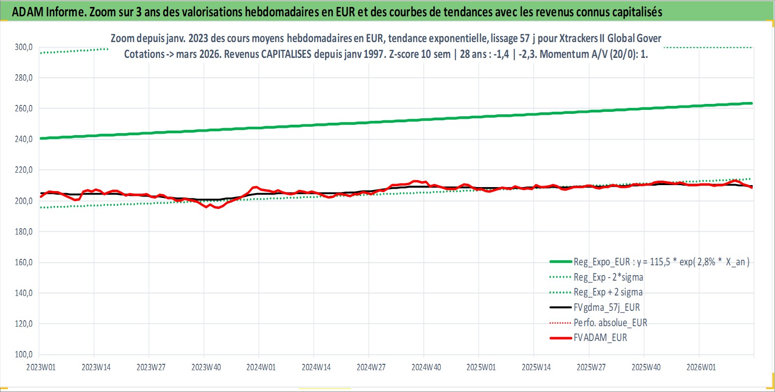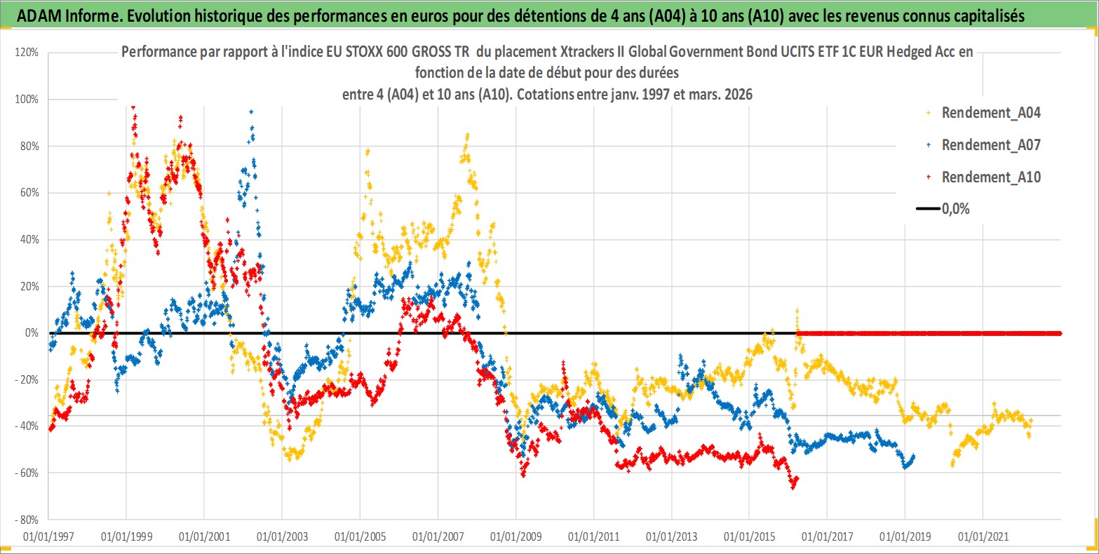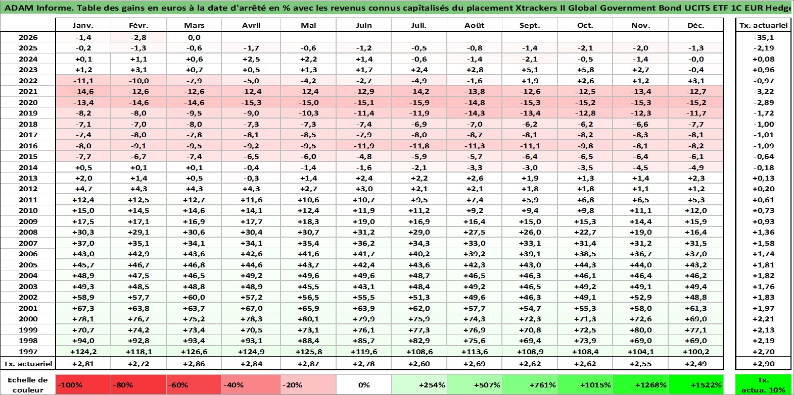 Site dédié aux investisseursPage dédiée sur site financeAnalyse des valorisations hebdomadaires du fonds Xtrackers II Global Government Bond UCITS ETF 1C EUR Hedged Acc. Cet actif est cote en EUR. Les valorisations couvrent les semaines 1997W01 a 2026W13. Les revenus de cet actif financier sont pris en compte depuis la semaine 1997W01. La note ESG de cet actif n'est pas connue.