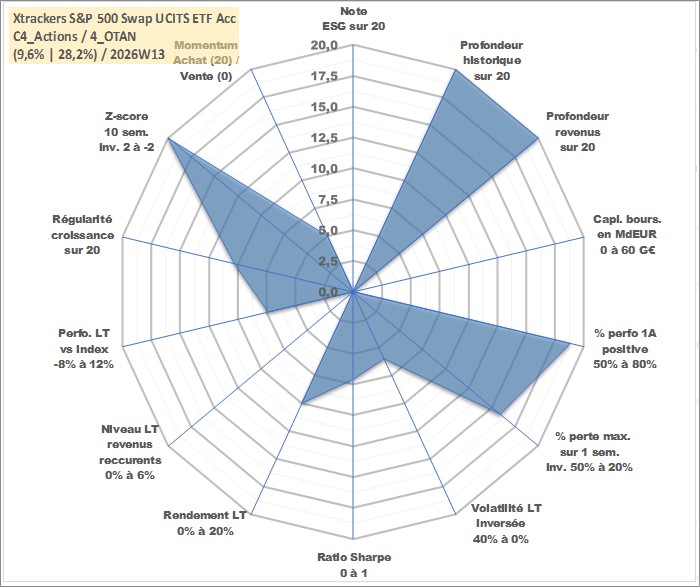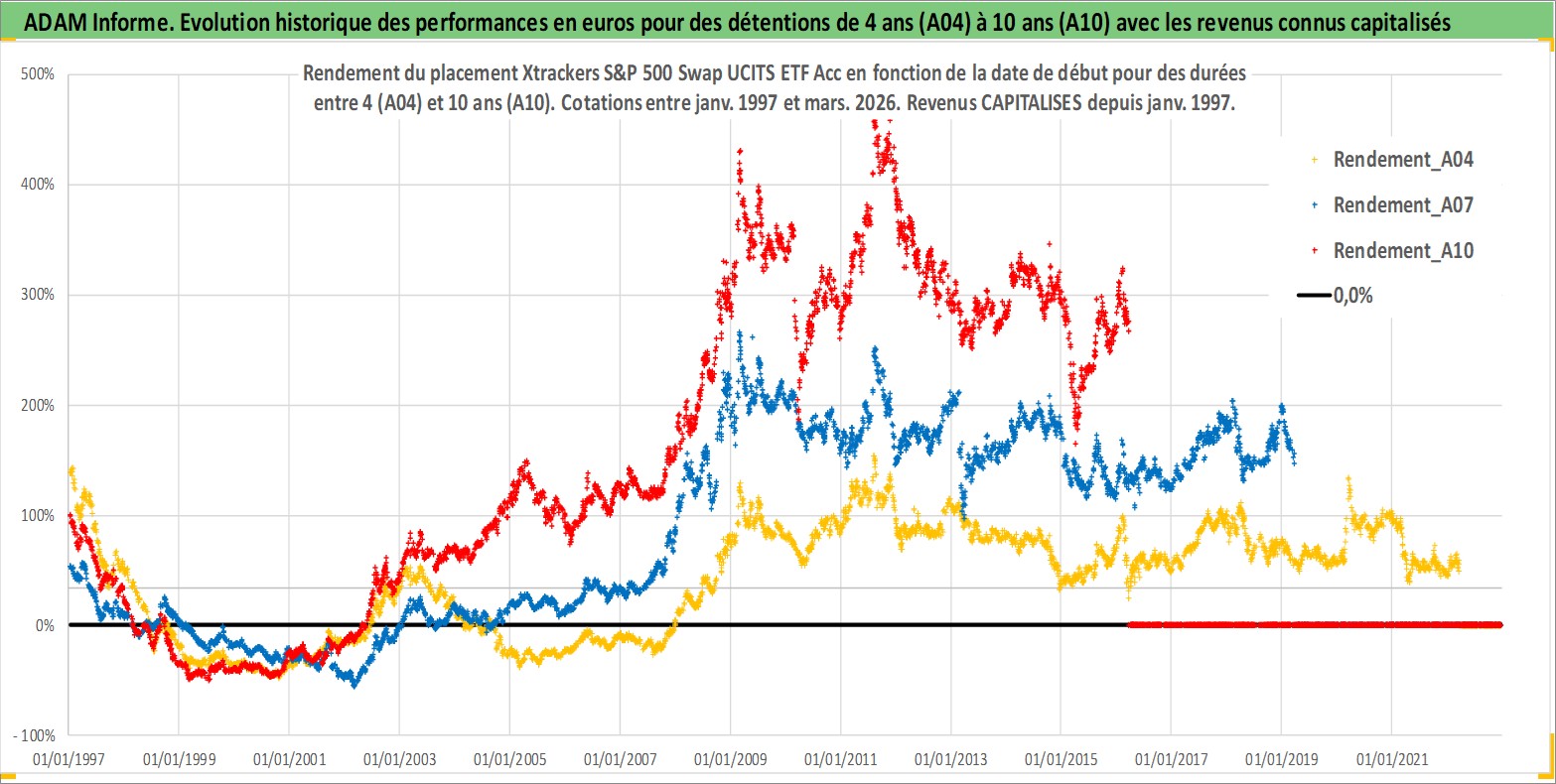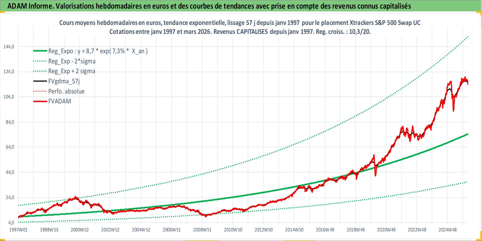 Site dédié aux investisseursPage dédiée sur site financeAnalyse des valorisations hebdomadaires du fonds Xtrackers S&P 500 Swap UCITS ETF Acc. Cet actif est cote en USD. Les valorisations sont en contrevaleur EURO et couvrent les semaines 1997W01 a 2026W13. Les revenus de cet actif financier sont pris en compte depuis la semaine 1997W01. La note ESG de cet actif n'est pas connue.