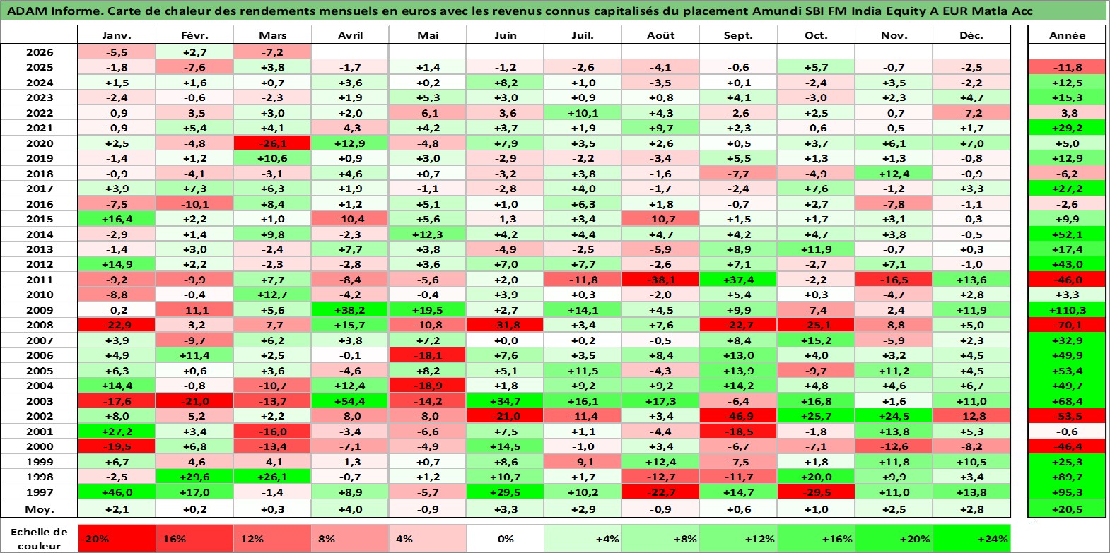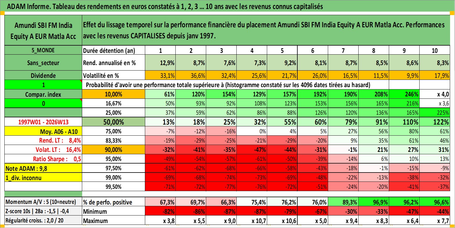 Site dédié aux investisseursPage dédiée sur site financeAnalyse des valorisations hebdomadaires du fonds Amundi SBI FM India Equity A EUR Matla Acc. Cet actif est cote en EUR. Les valorisations couvrent les semaines 1997W01 a 2026W13. Les revenus de cet actif financier sont pris en compte depuis la semaine 1997W01. La note globale ESG de cet actif est estimee a 7.0 (apres rebasage entre 0 et 20).