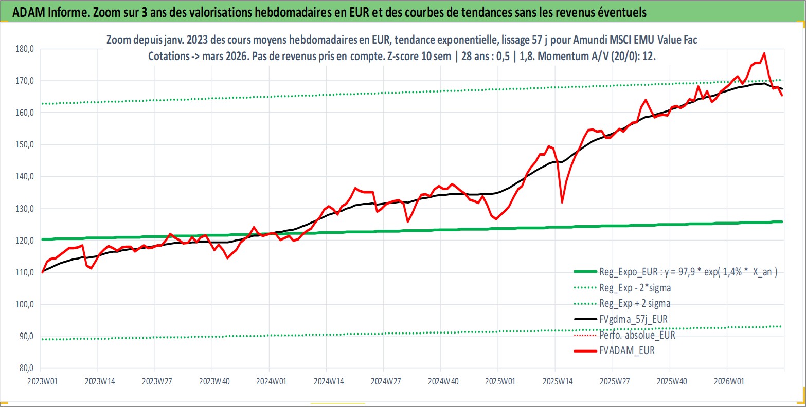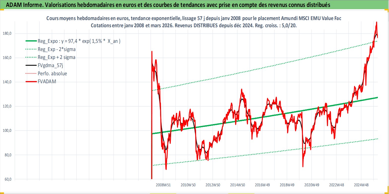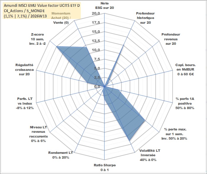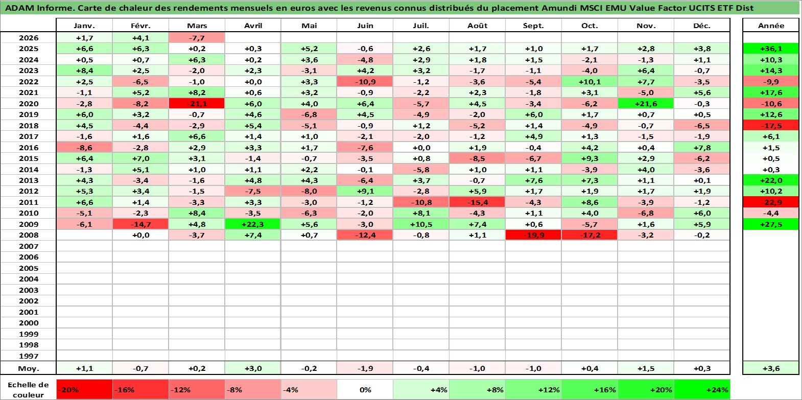 Site dédié aux investisseursPage dédiée sur site financeAnalyse des valorisations hebdomadaires du fonds Amundi MSCI EMU Value Factor UCITS ETF Dist. Cet actif est cote en EUR. Les valorisations couvrent les semaines 2008W03 a 2026W13. Les revenus de cet actif financier sont pris en compte depuis la semaine 2024W50. La note ESG de cet actif n'est pas connue.