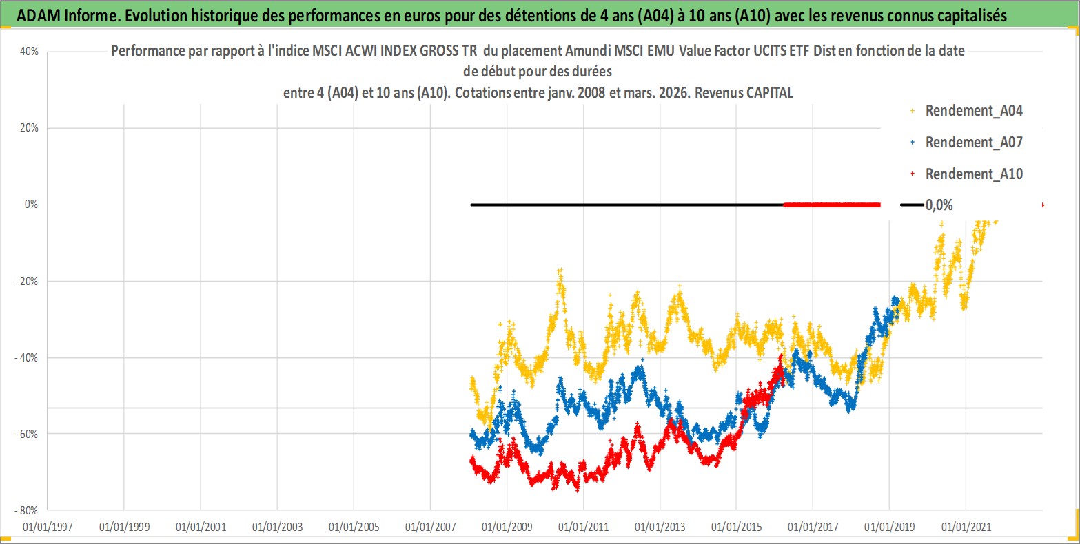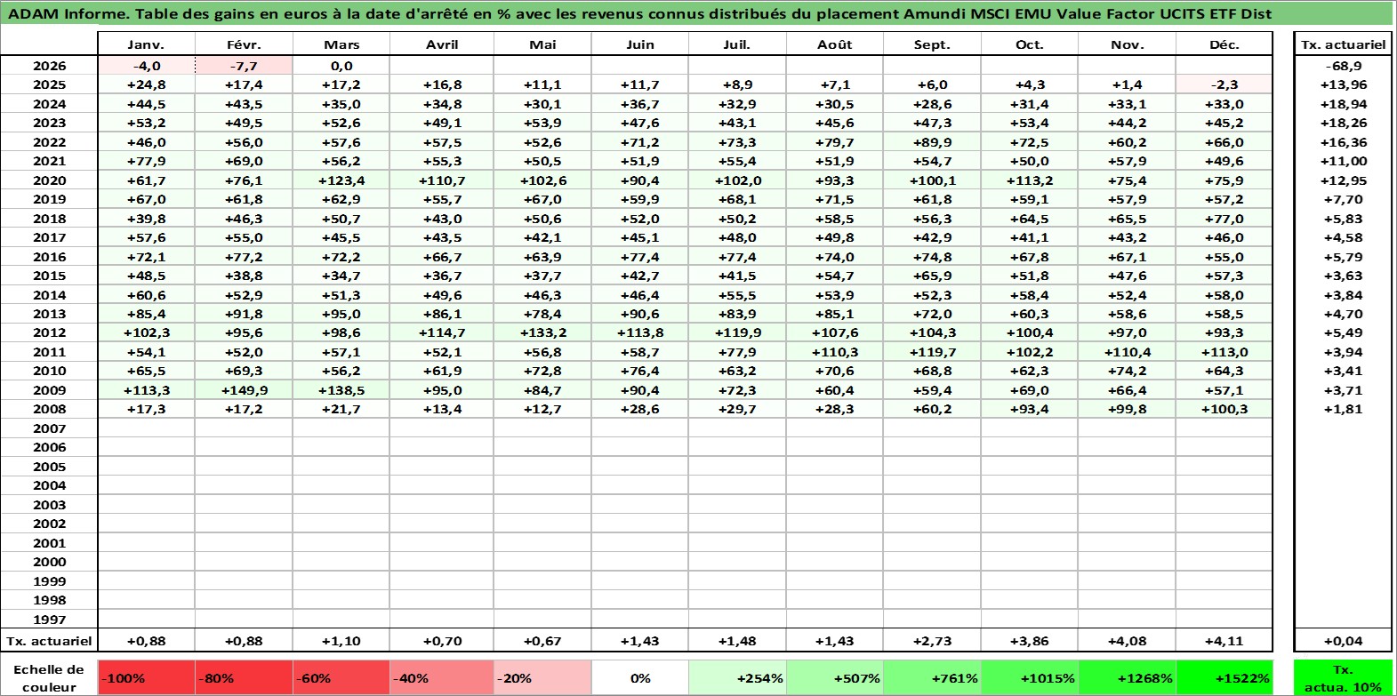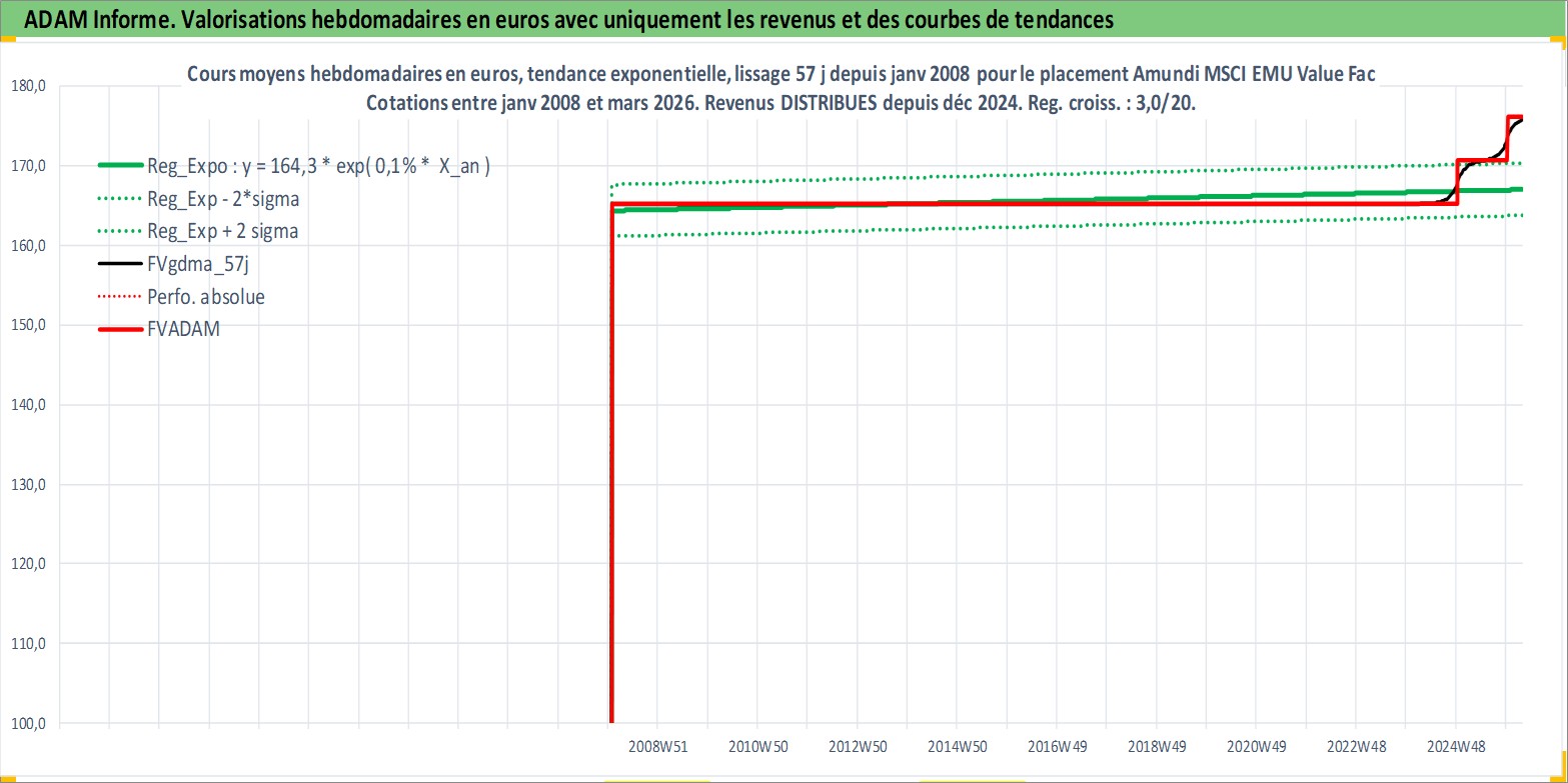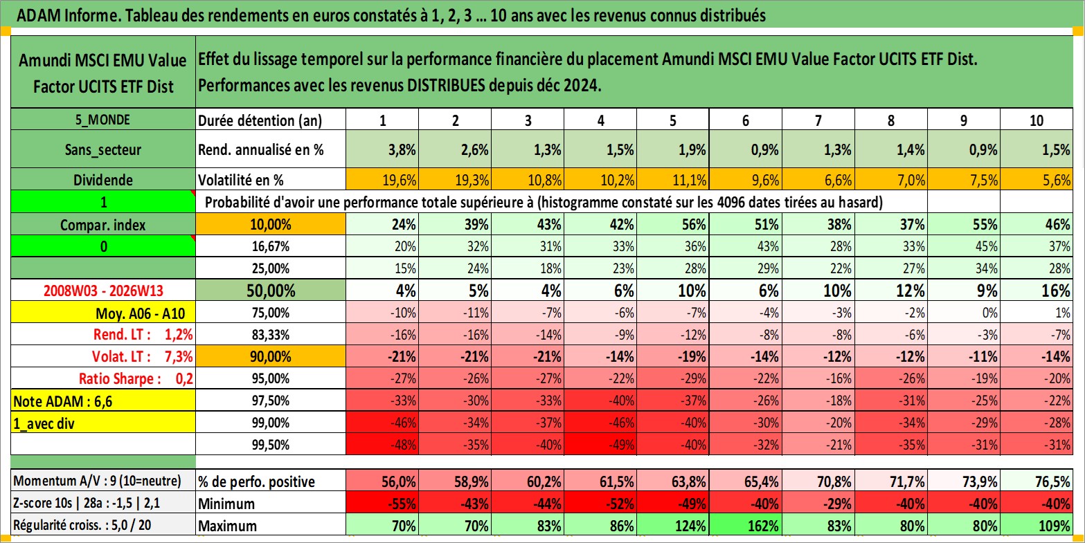 Site dédié aux investisseursPage dédiée sur site financeAnalyse des valorisations hebdomadaires du fonds Amundi MSCI EMU Value Factor UCITS ETF Dist. Cet actif est cote en EUR. Les valorisations couvrent les semaines 2008W03 a 2026W13. Les revenus de cet actif financier sont pris en compte depuis la semaine 2024W50. La note ESG de cet actif n'est pas connue.