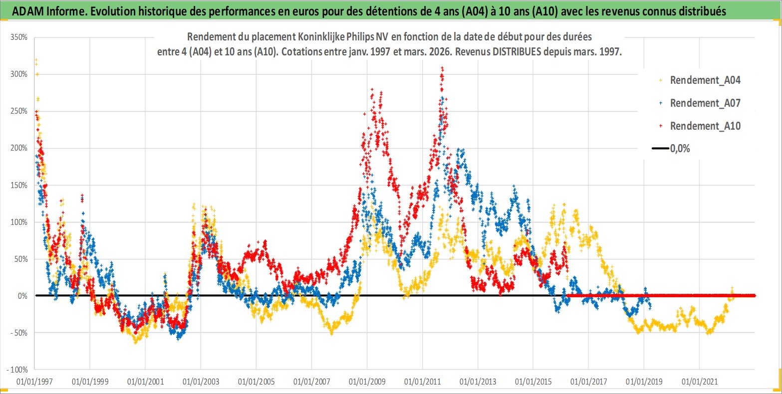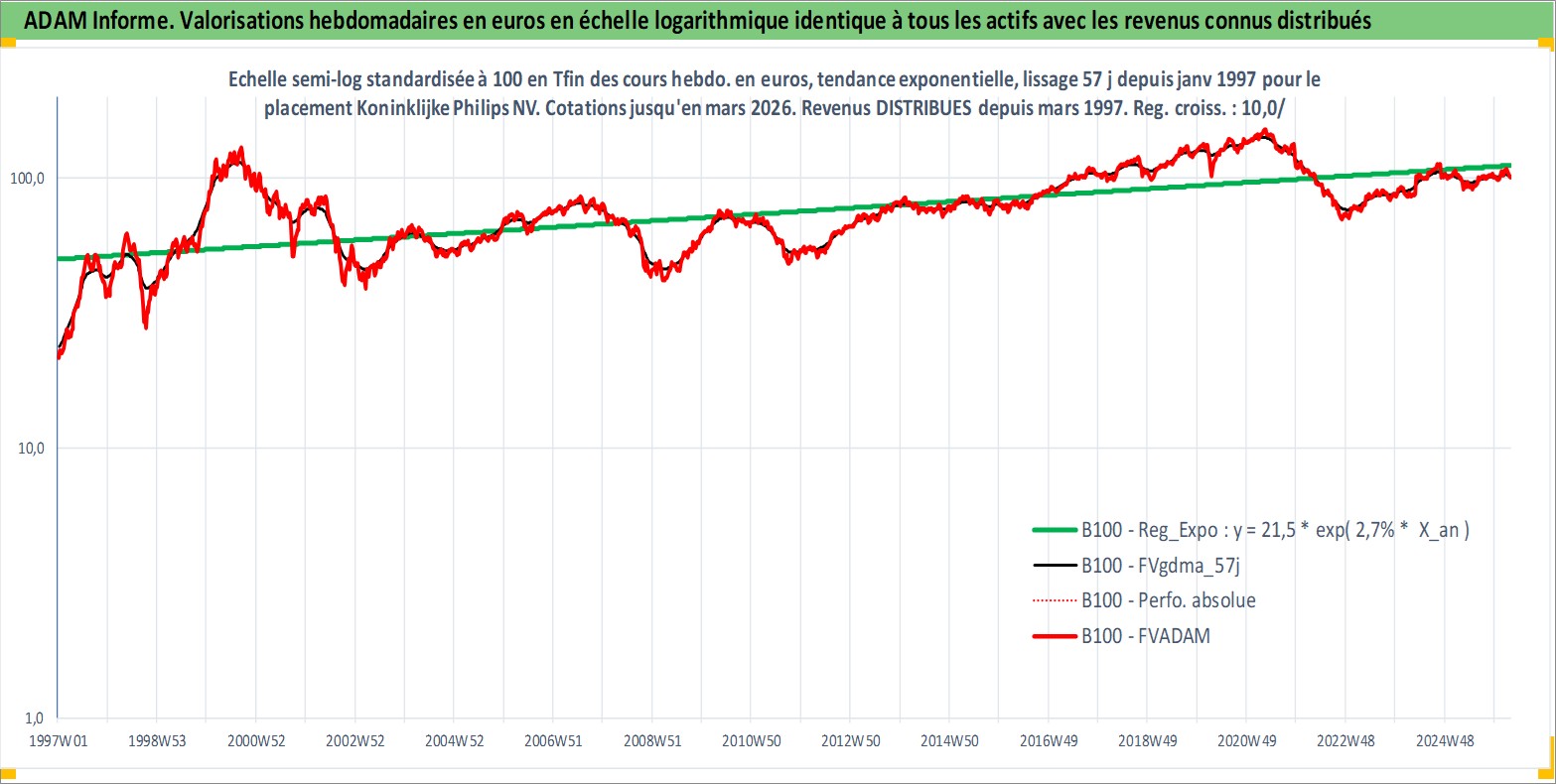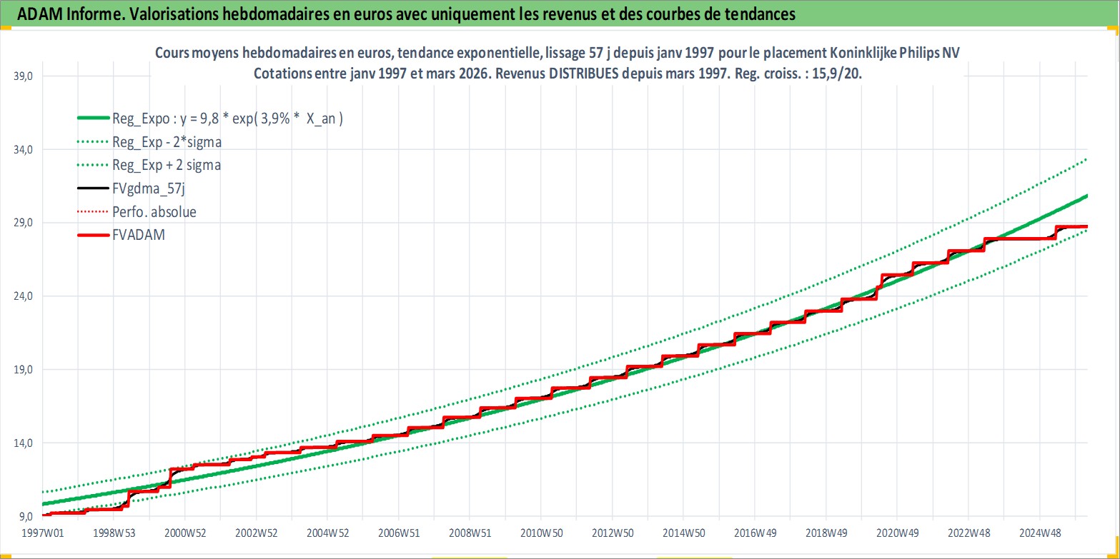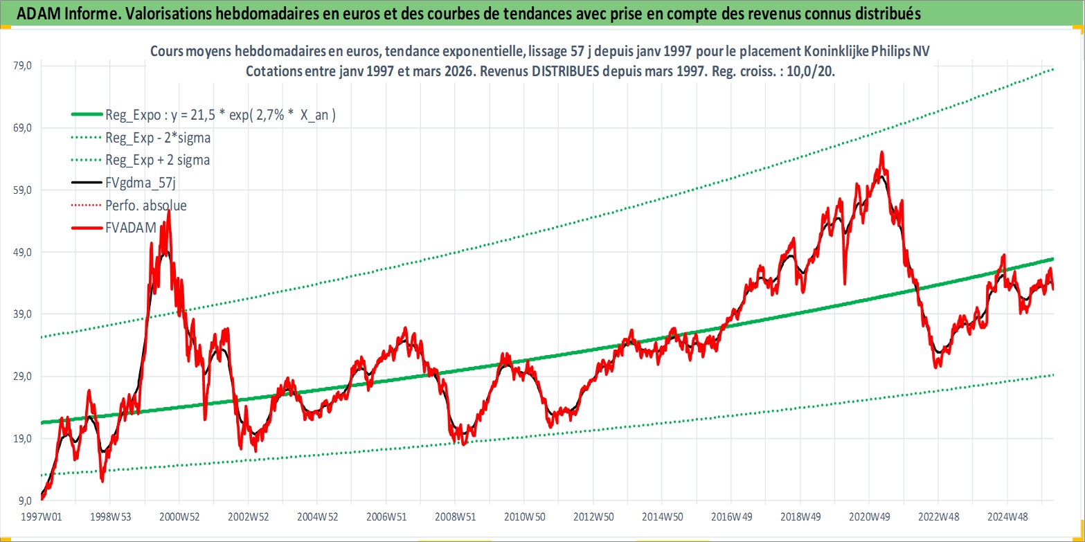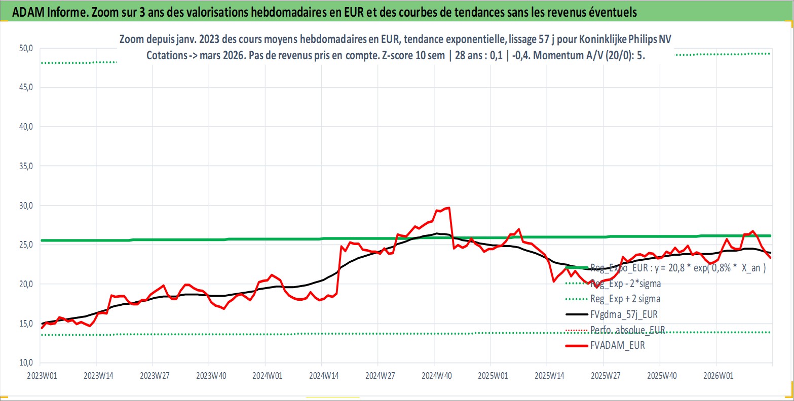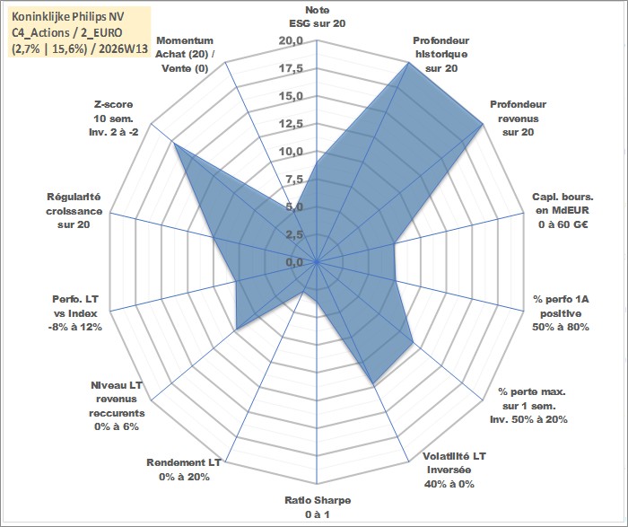 Site dédié aux investisseursPage dédiée sur site financeAnalyse des valorisations hebdomadaires de l'action Koninklijke Philips NV. Cet actif est cote en EUR. Les valorisations couvrent les semaines 1997W01 a 2026W13. Les revenus de cet actif financier sont pris en compte depuis la semaine 1997W13. La note globale ESG de cet actif est estimee a 9.0 (apres rebasage entre 0 et 20).