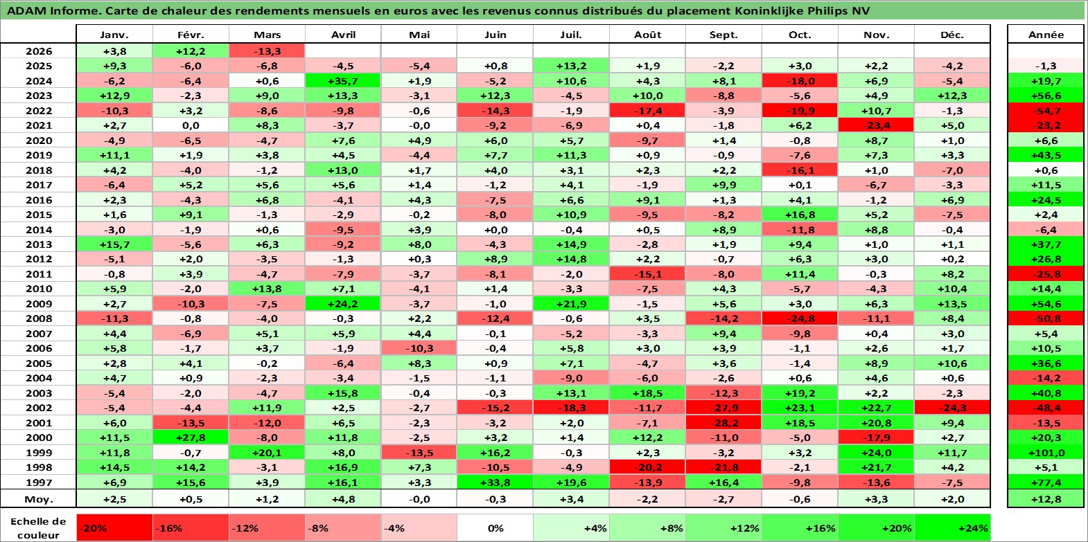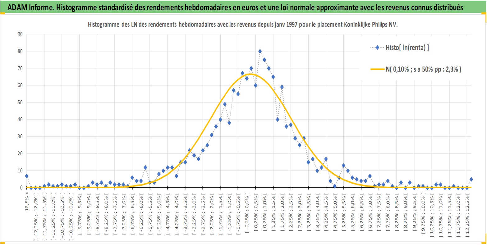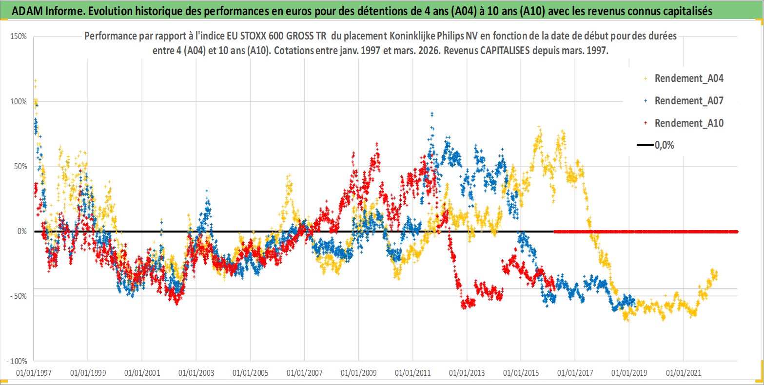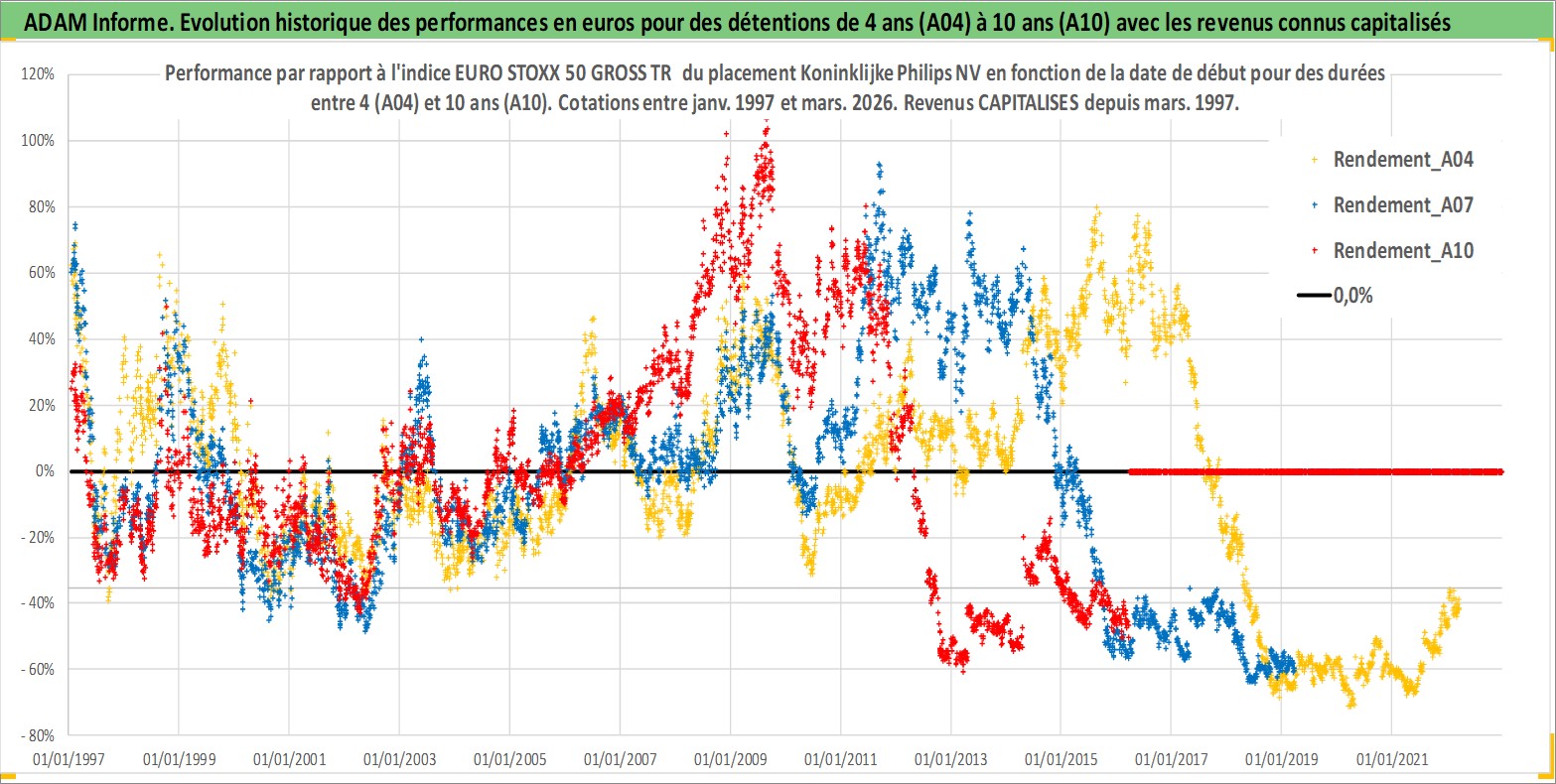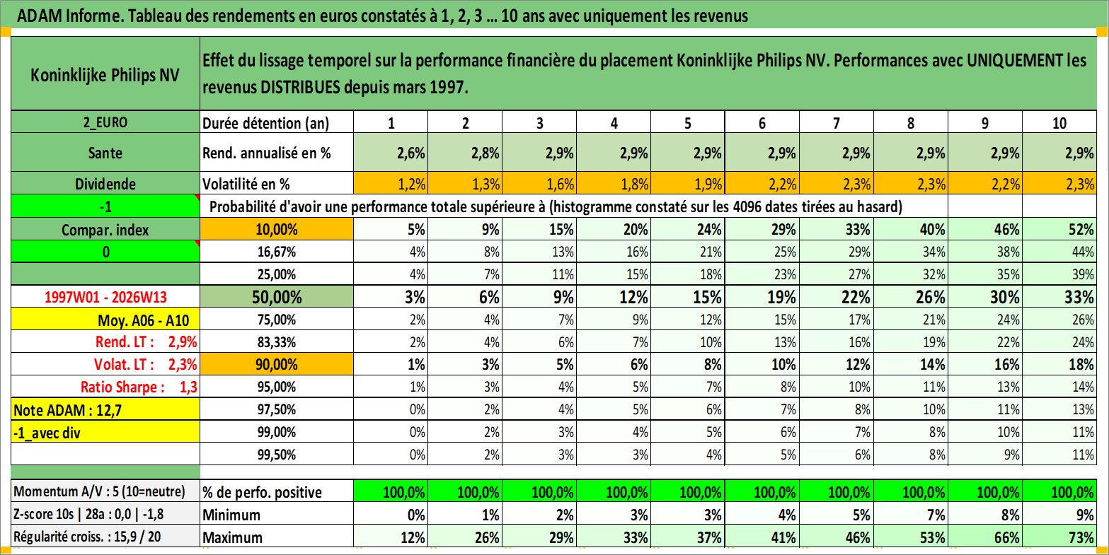 Site dédié aux investisseursPage dédiée sur site financeAnalyse des valorisations hebdomadaires de l'action Koninklijke Philips NV. Cet actif est cote en EUR. Les valorisations couvrent les semaines 1997W01 a 2026W13. Les revenus de cet actif financier sont pris en compte depuis la semaine 1997W13. La note globale ESG de cet actif est estimee a 9.0 (apres rebasage entre 0 et 20).