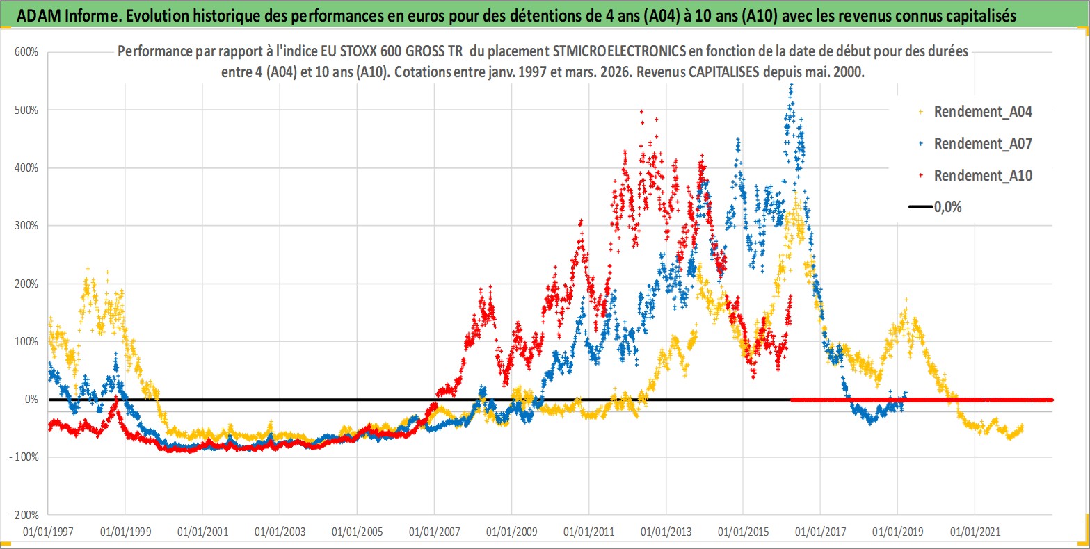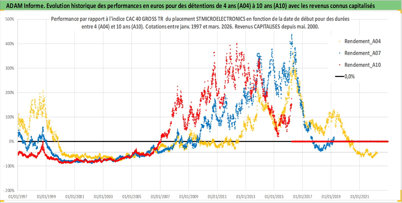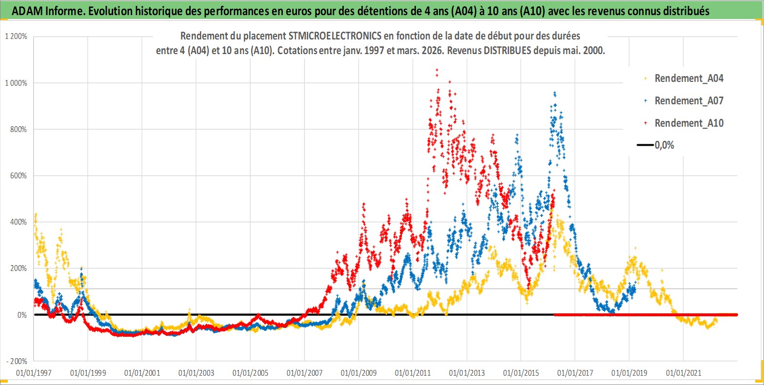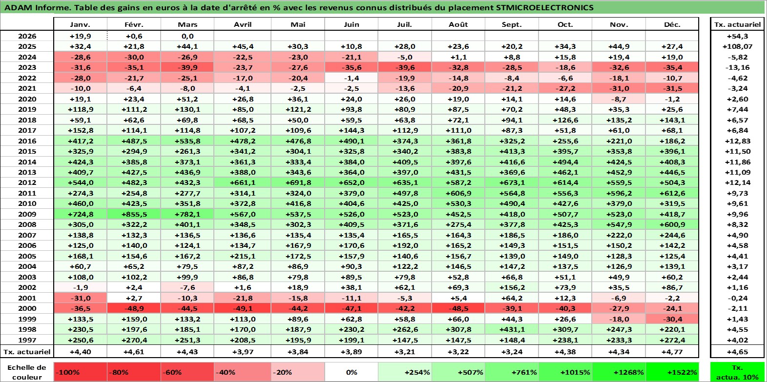 Site dédié aux investisseursPage dédiée sur site financeAnalyse des valorisations hebdomadaires de l'action STMICROELECTRONICS. Cet actif est cote en EUR. Les valorisations couvrent les semaines 1997W01 a 2026W13. Les revenus de cet actif financier sont pris en compte depuis la semaine 2000W18. La note ESG de cet actif n'est pas connue.