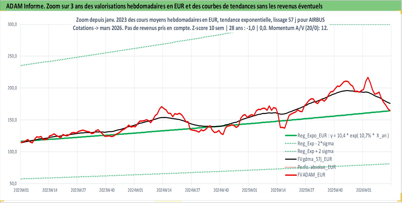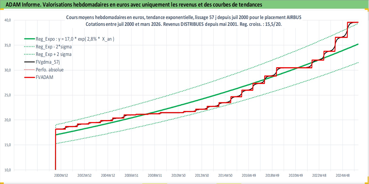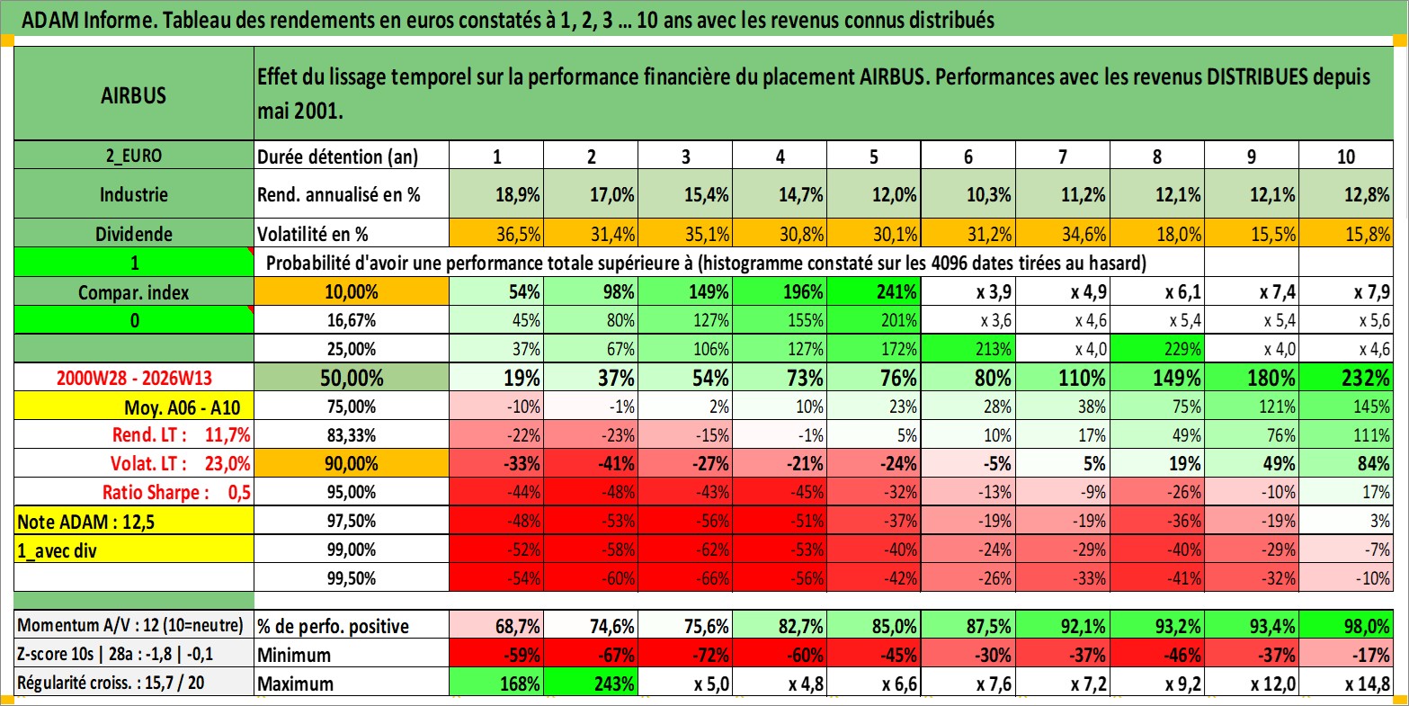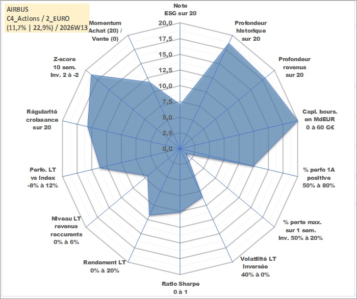 Site dédié aux investisseursPage dédiée sur site financeAnalyse des valorisations hebdomadaires de l'action AIRBUS. Cet actif est cote en EUR. Les valorisations couvrent les semaines 2000W28 a 2026W13. Les revenus de cet actif financier sont pris en compte depuis la semaine 2001W20. La note globale ESG de cet actif est estimee a 7.0 (apres rebasage entre 0 et 20).