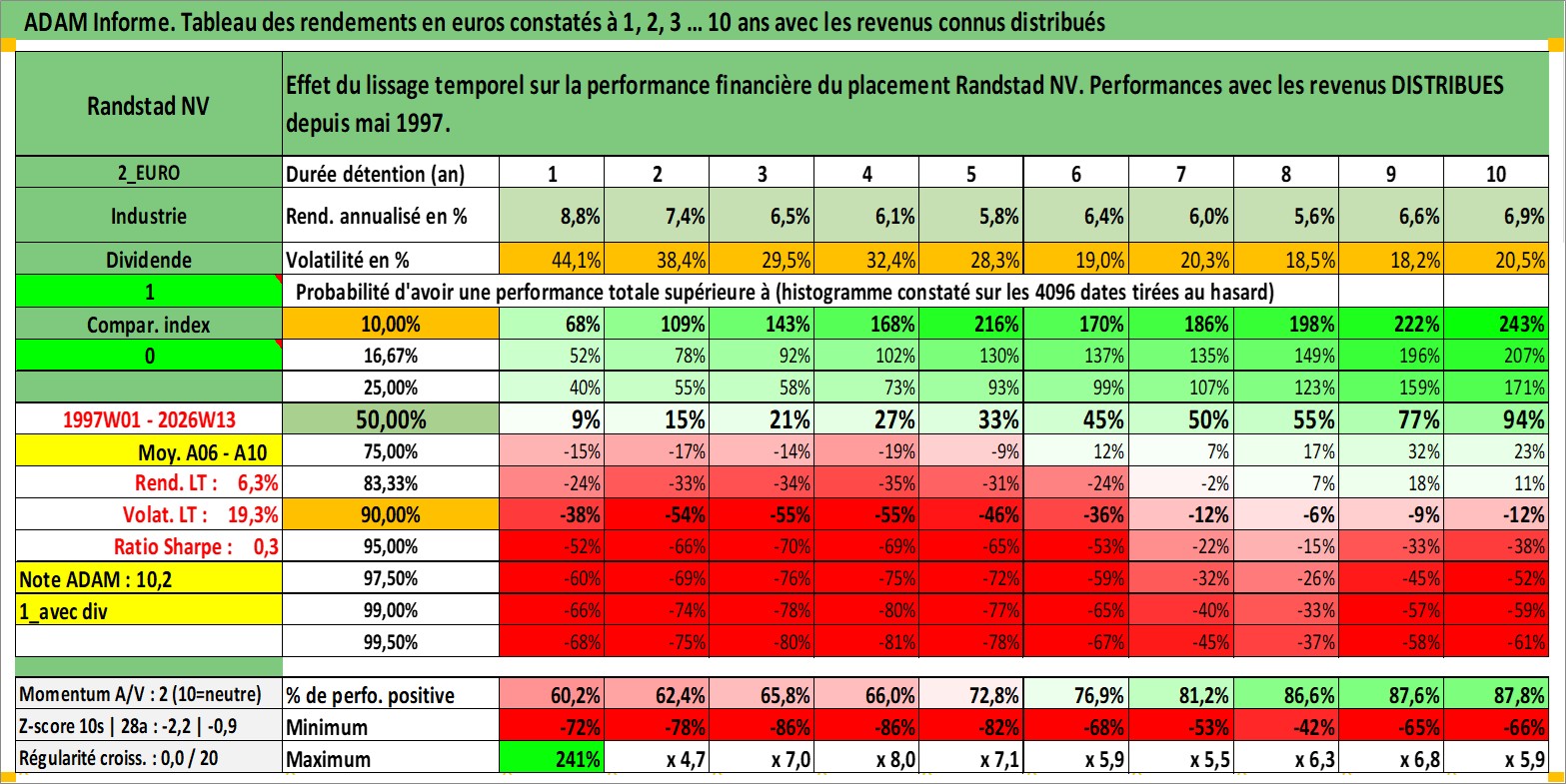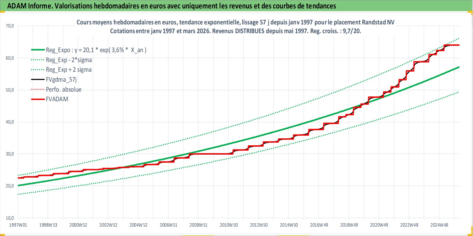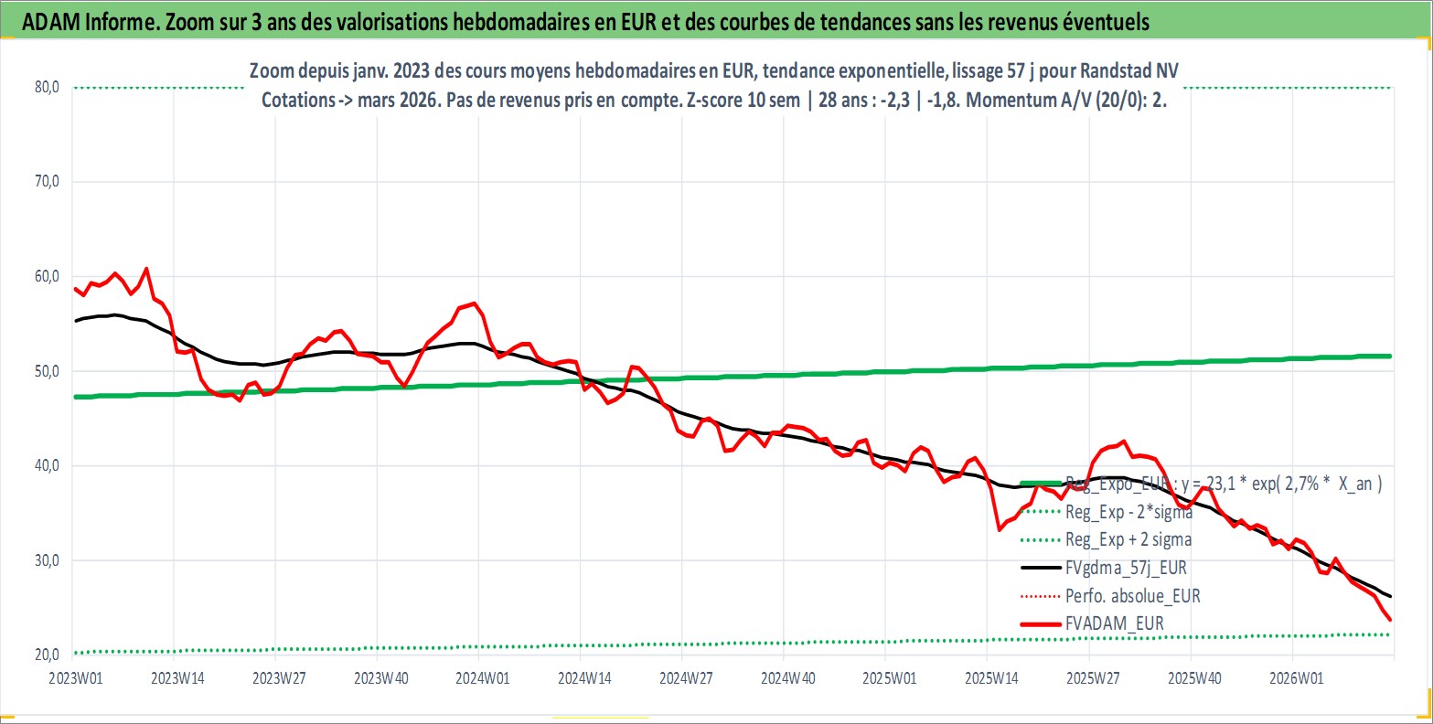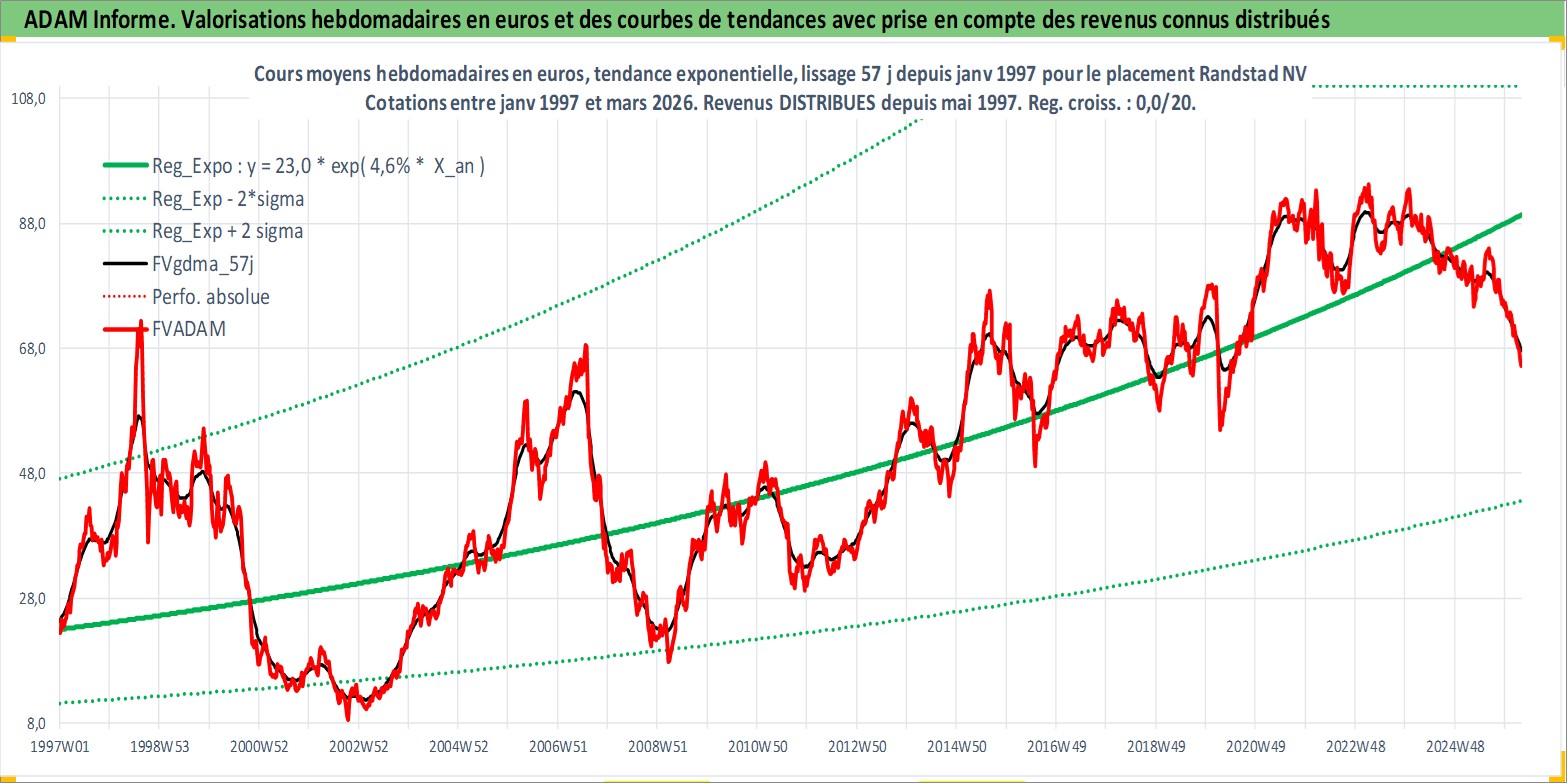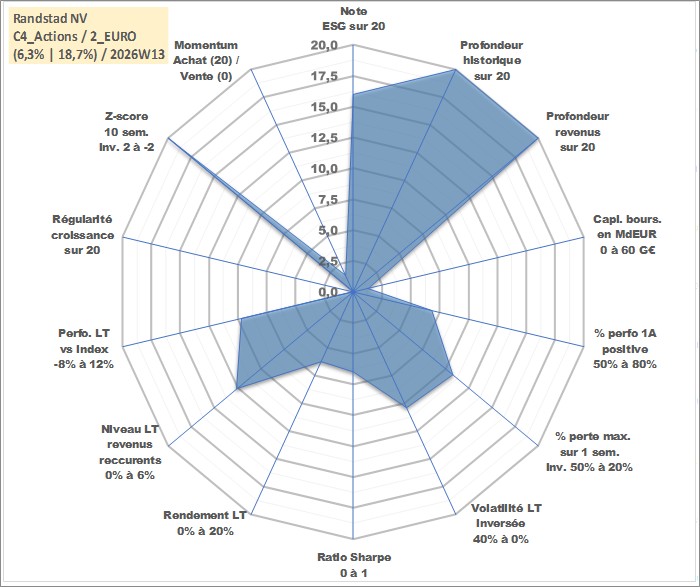 Site dédié aux investisseursPage dédiée sur site financeAnalyse des valorisations hebdomadaires de l'action Randstad NV. Cet actif est cote en EUR. Les valorisations couvrent les semaines 1997W01 a 2026W13. Les revenus de cet actif financier sont pris en compte depuis la semaine 1997W21. La note globale ESG de cet actif est estimee a 16.0 (apres rebasage entre 0 et 20).