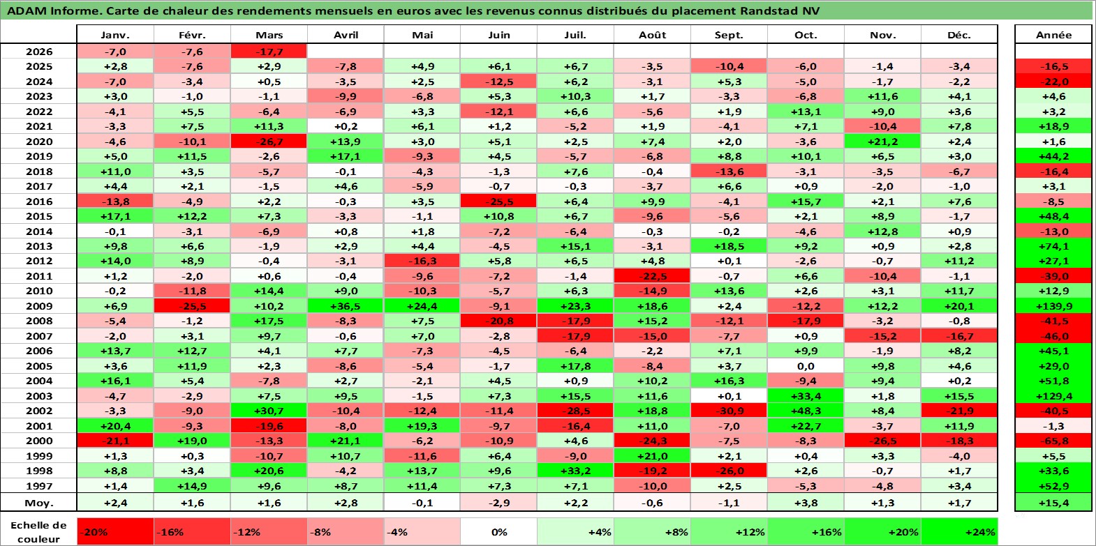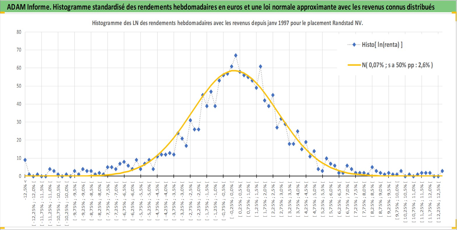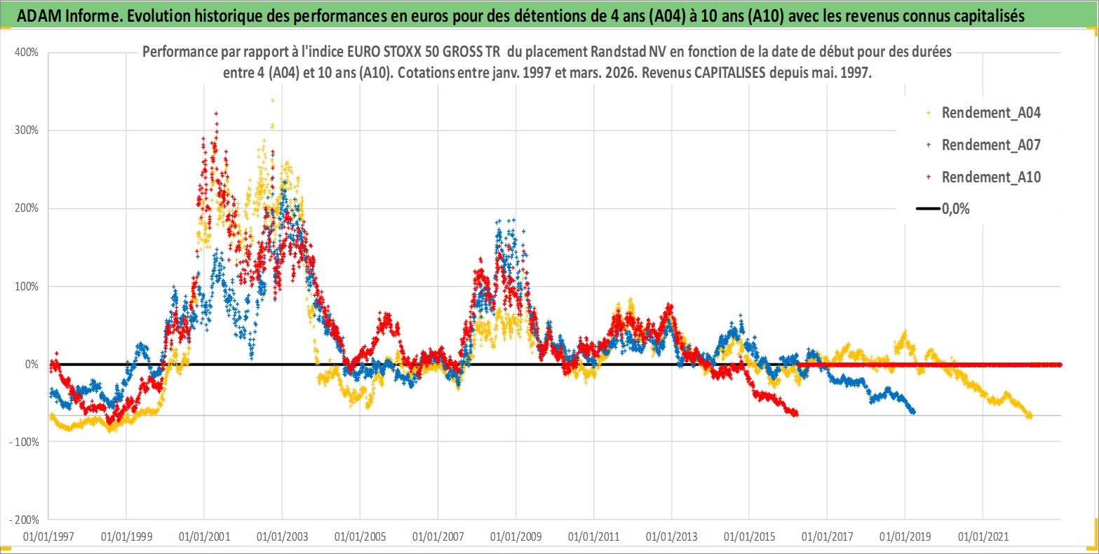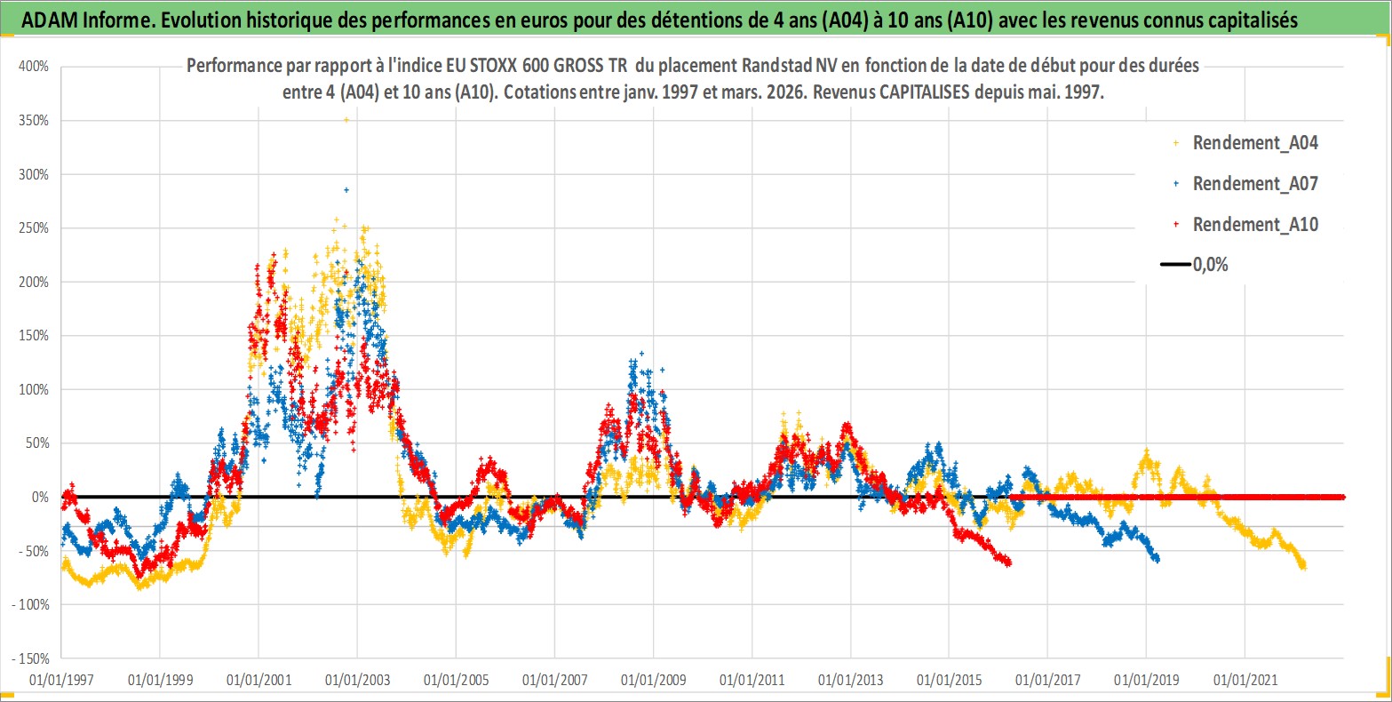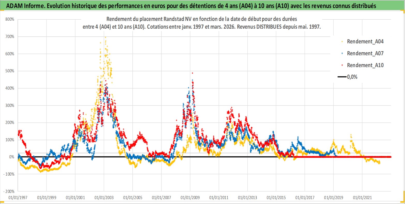 Site dédié aux investisseursPage dédiée sur site financeAnalyse des valorisations hebdomadaires de l'action Randstad NV. Cet actif est cote en EUR. Les valorisations couvrent les semaines 1997W01 a 2026W13. Les revenus de cet actif financier sont pris en compte depuis la semaine 1997W21. La note globale ESG de cet actif est estimee a 16.0 (apres rebasage entre 0 et 20).