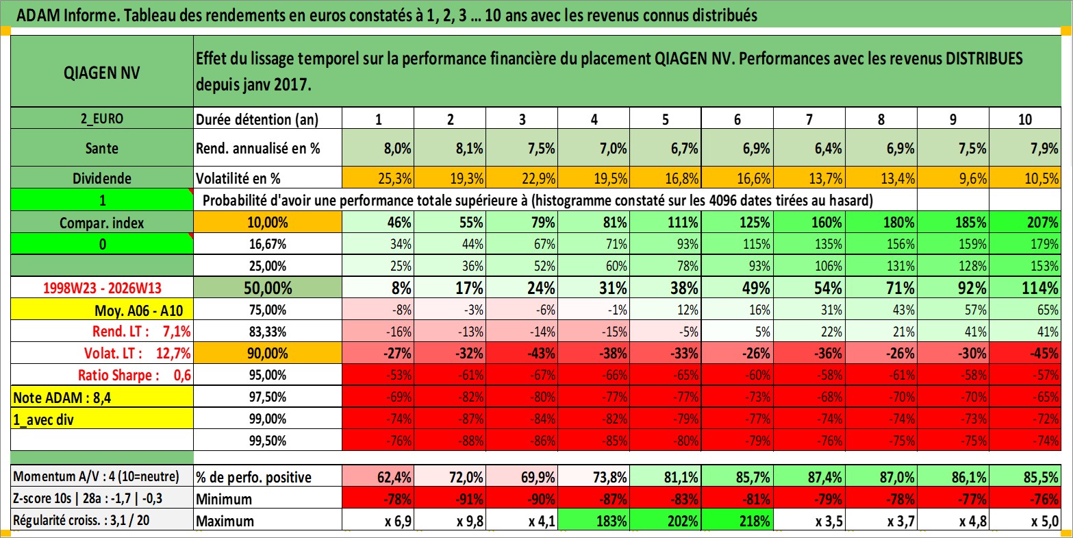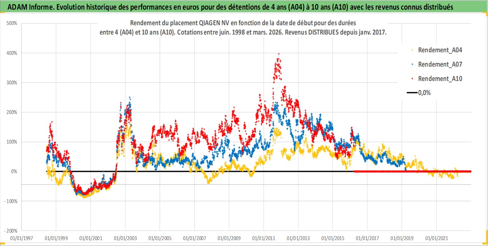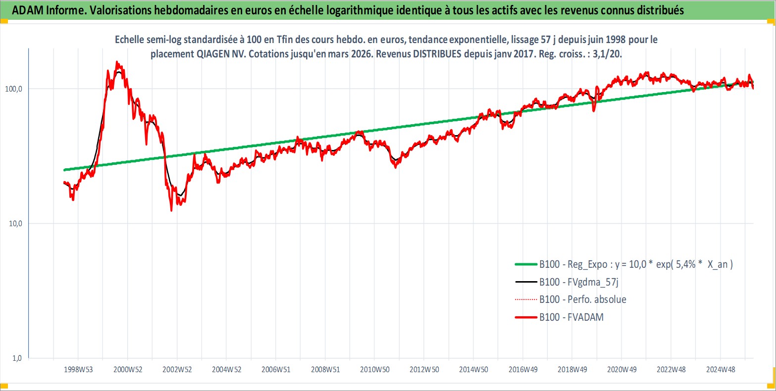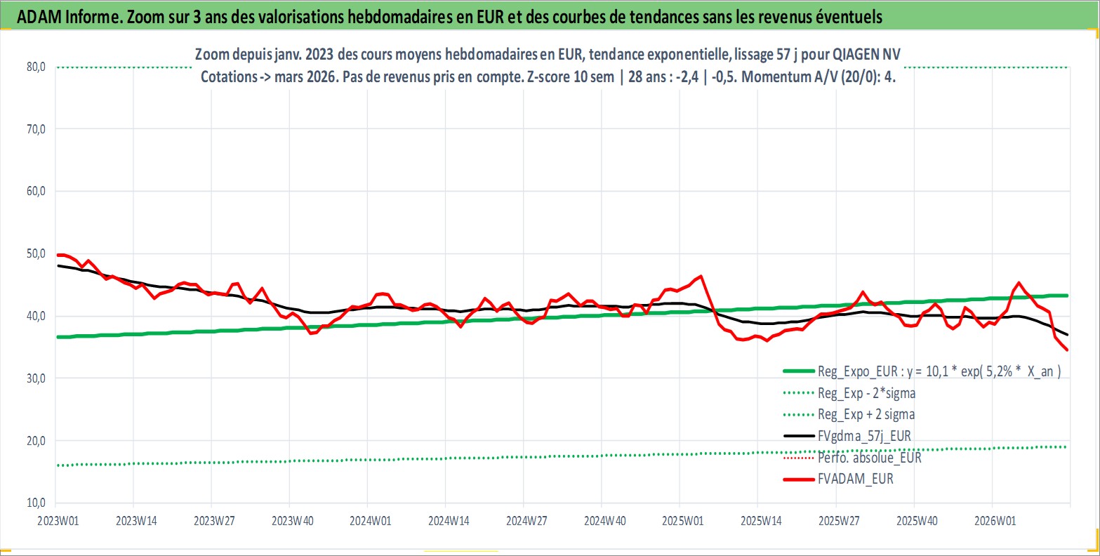 Site dédié aux investisseursPage dédiée sur site financeAnalyse des valorisations hebdomadaires de l'action QIAGEN NV. Cet actif est cote en EUR. Les valorisations couvrent les semaines 1998W23 a 2026W13. Les revenus de cet actif financier sont pris en compte depuis la semaine 2017W04. La note globale ESG de cet actif est estimee a 13.0 (apres rebasage entre 0 et 20).