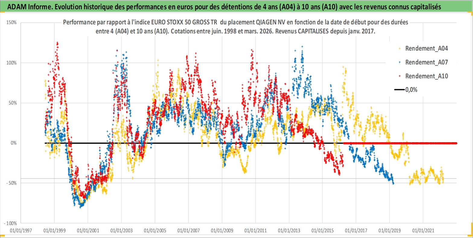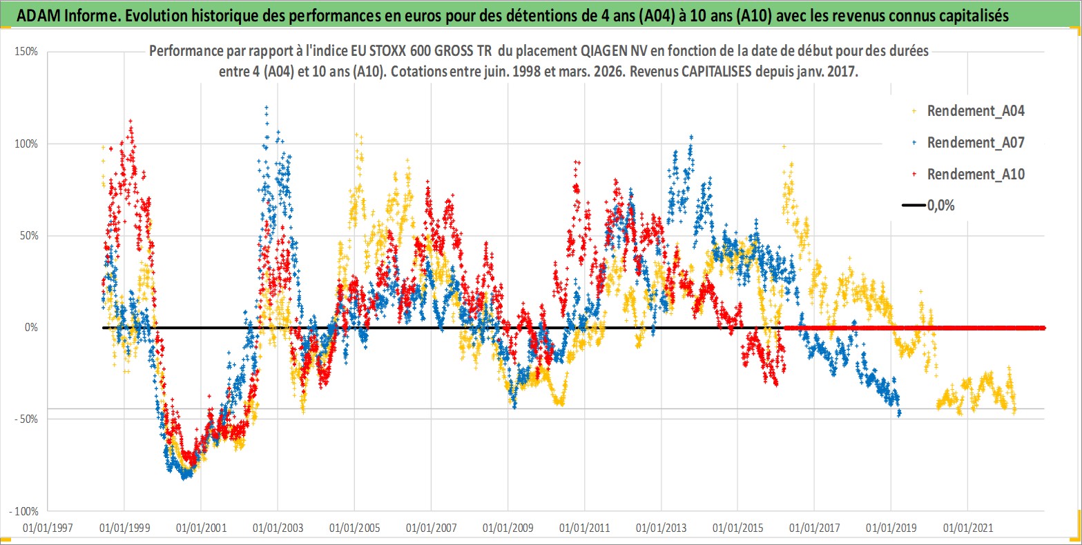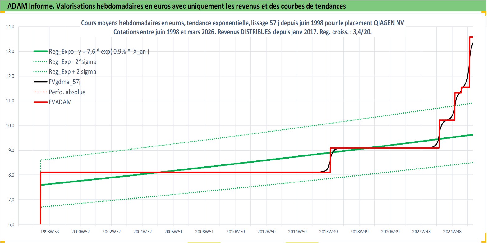 Site dédié aux investisseursPage dédiée sur site financeAnalyse des valorisations hebdomadaires de l'action QIAGEN NV. Cet actif est cote en EUR. Les valorisations couvrent les semaines 1998W23 a 2026W13. Les revenus de cet actif financier sont pris en compte depuis la semaine 2017W04. La note globale ESG de cet actif est estimee a 13.0 (apres rebasage entre 0 et 20).