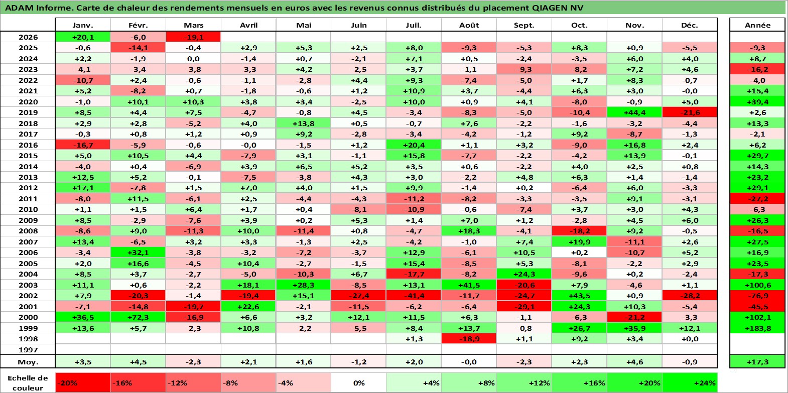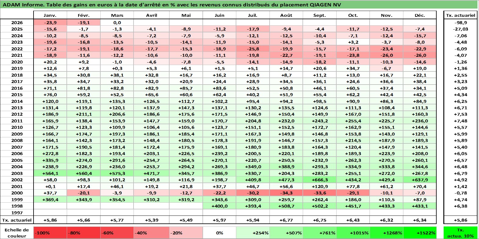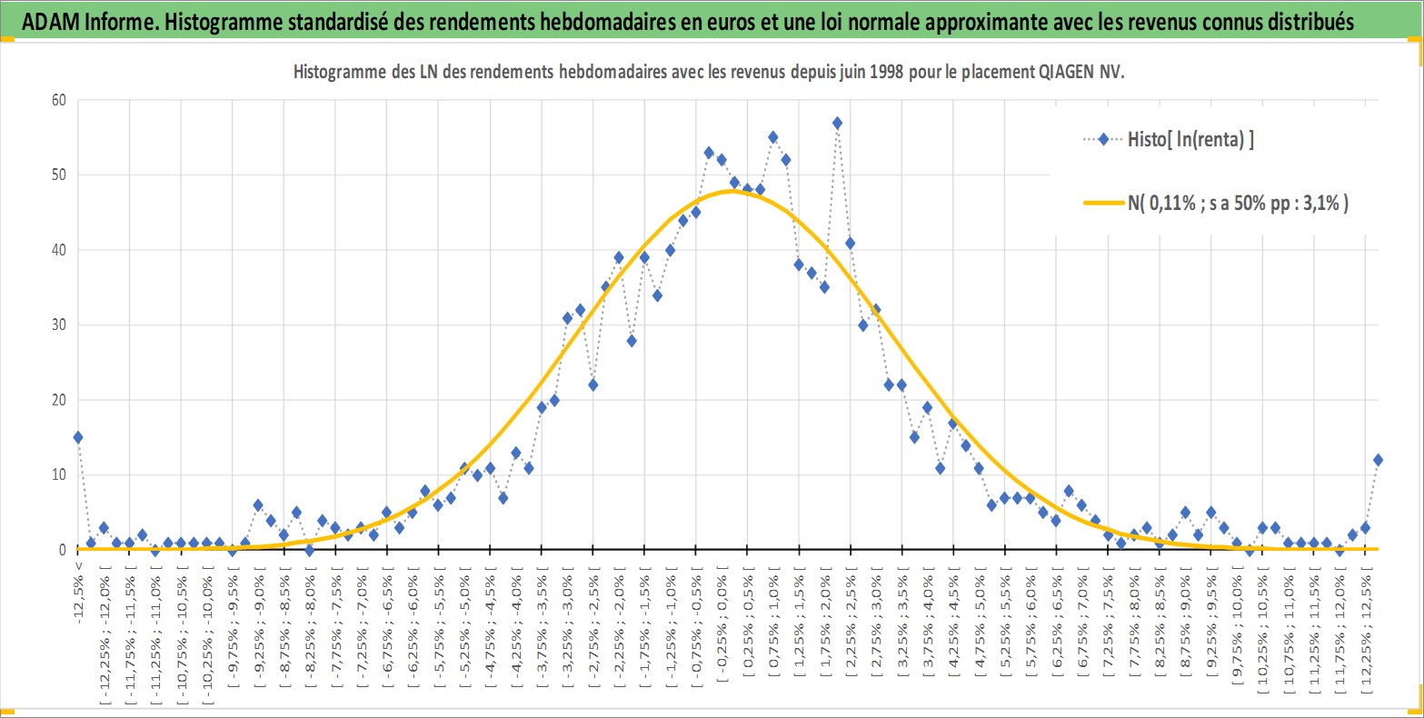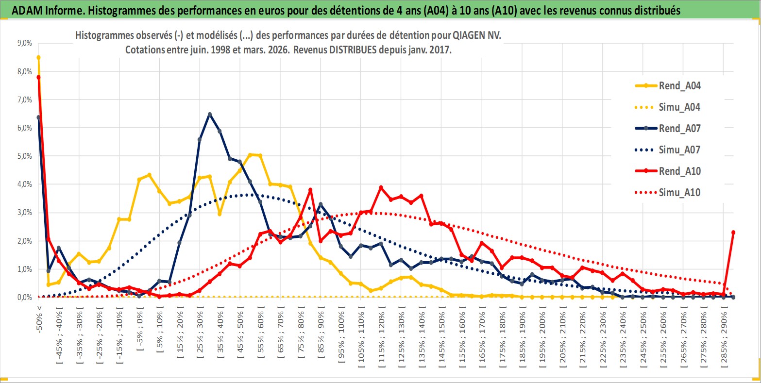Site dédié aux investisseursPage dédiée sur site financeAnalyse des valorisations hebdomadaires de l'action QIAGEN NV. Cet actif est cote en EUR. Les valorisations couvrent les semaines 1998W23 a 2026W13. Les revenus de cet actif financier sont pris en compte depuis la semaine 2017W04. La note globale ESG de cet actif est estimee a 13.0 (apres rebasage entre 0 et 20).