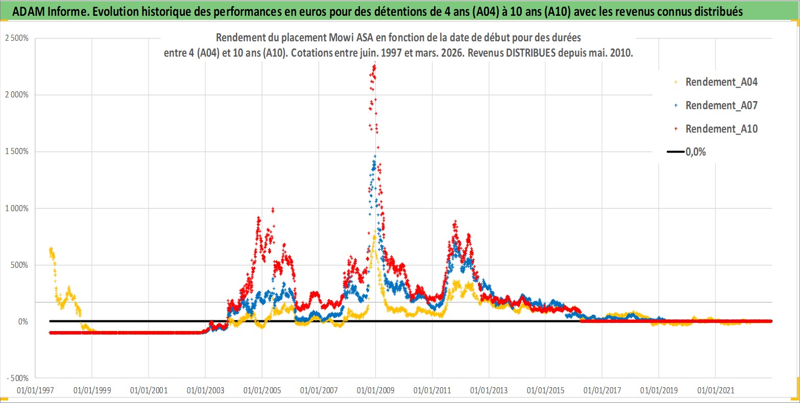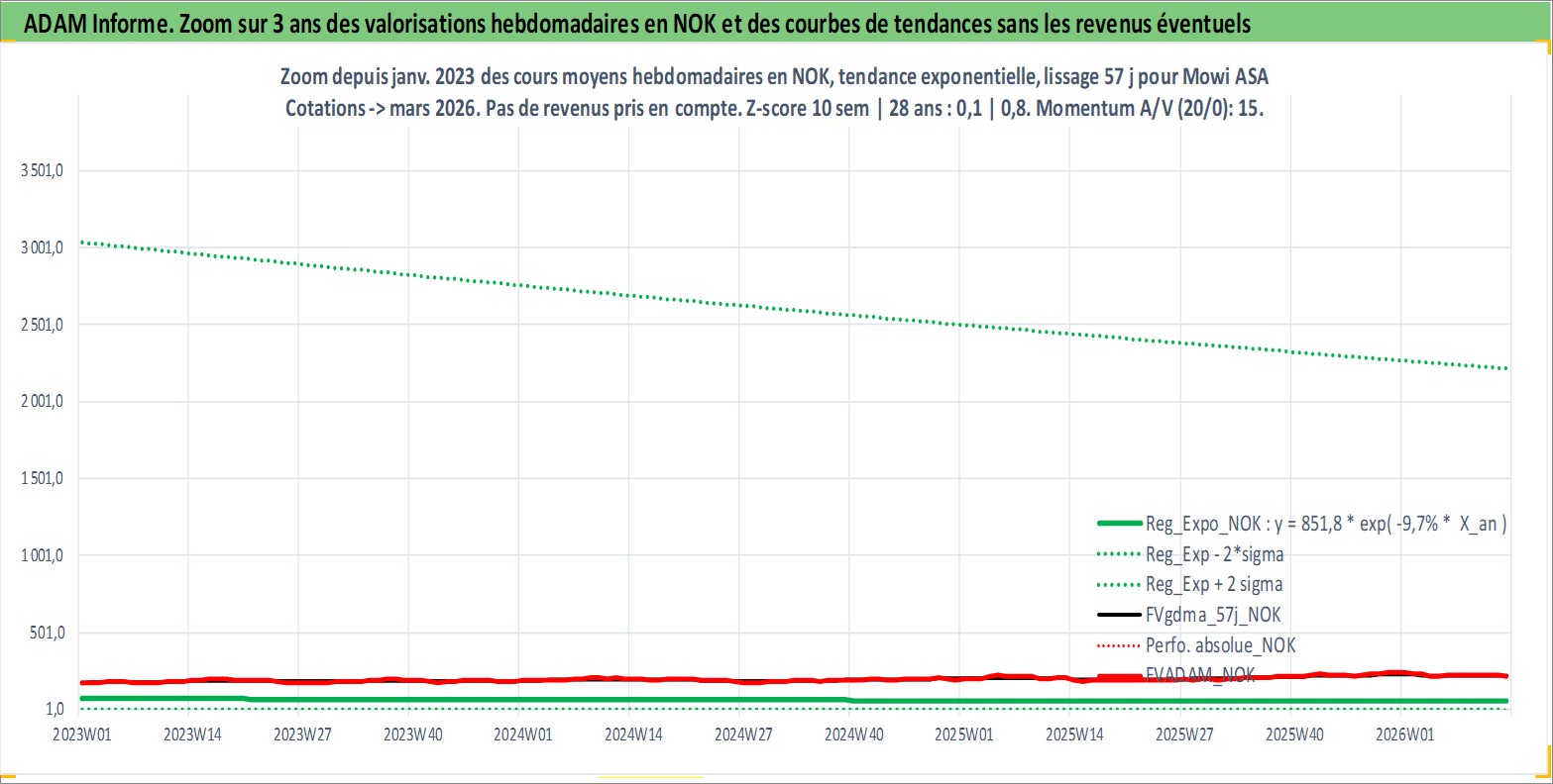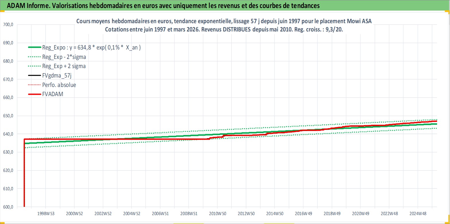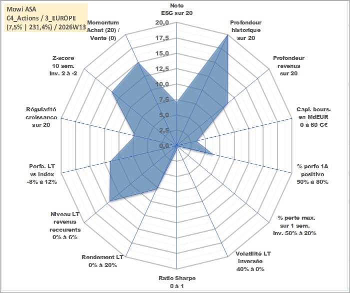 Site dédié aux investisseursPage dédiée sur site financeAnalyse des valorisations hebdomadaires de l'action Mowi ASA. Cet actif est cote en NOK. Les valorisations sont en contrevaleur EURO et couvrent les semaines 1997W27 a 2026W13. Les revenus de cet actif financier sont pris en compte depuis la semaine 2010W21. La note globale ESG de cet actif est estimee a 7.0 (apres rebasage entre 0 et 20).
