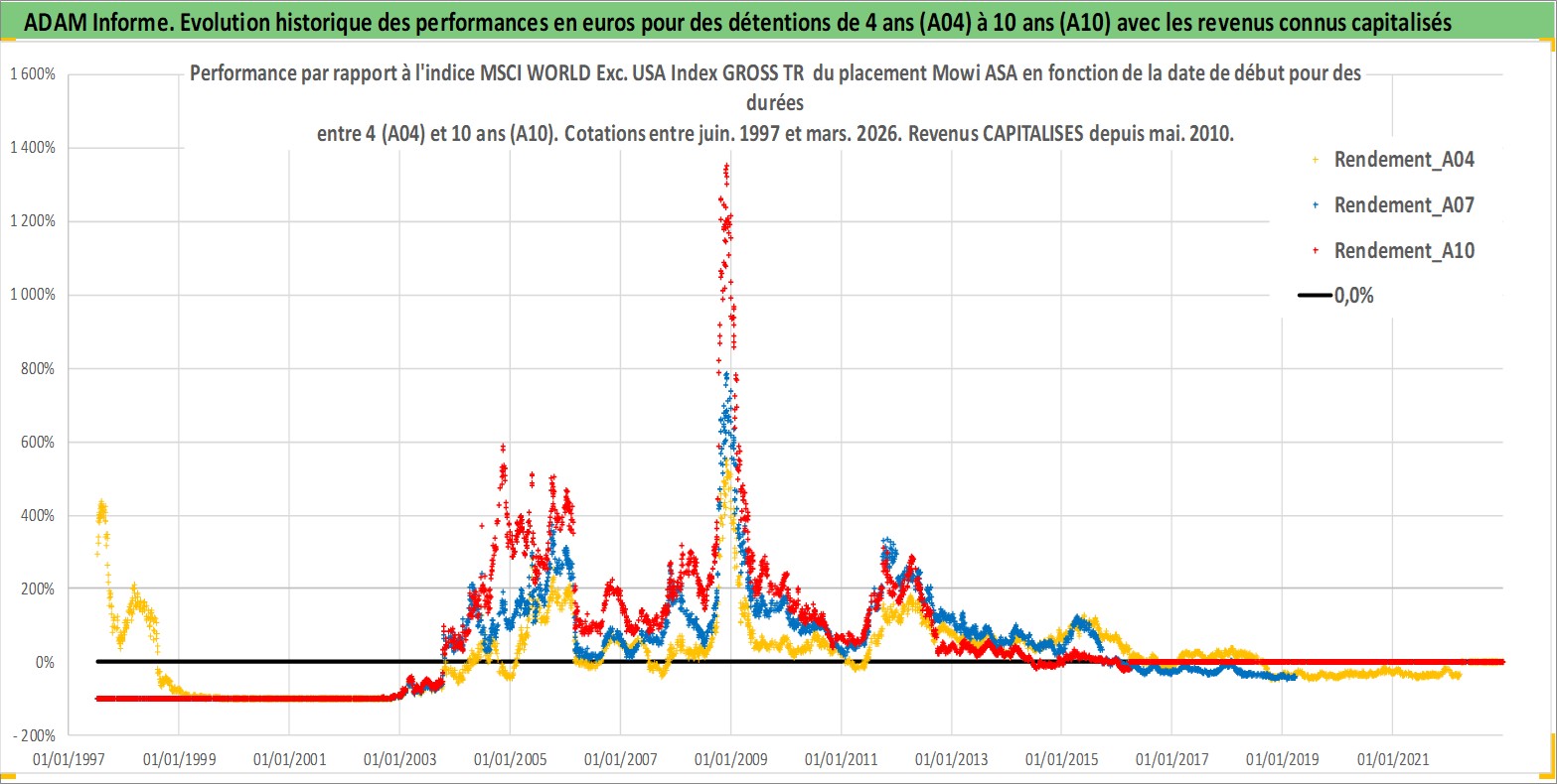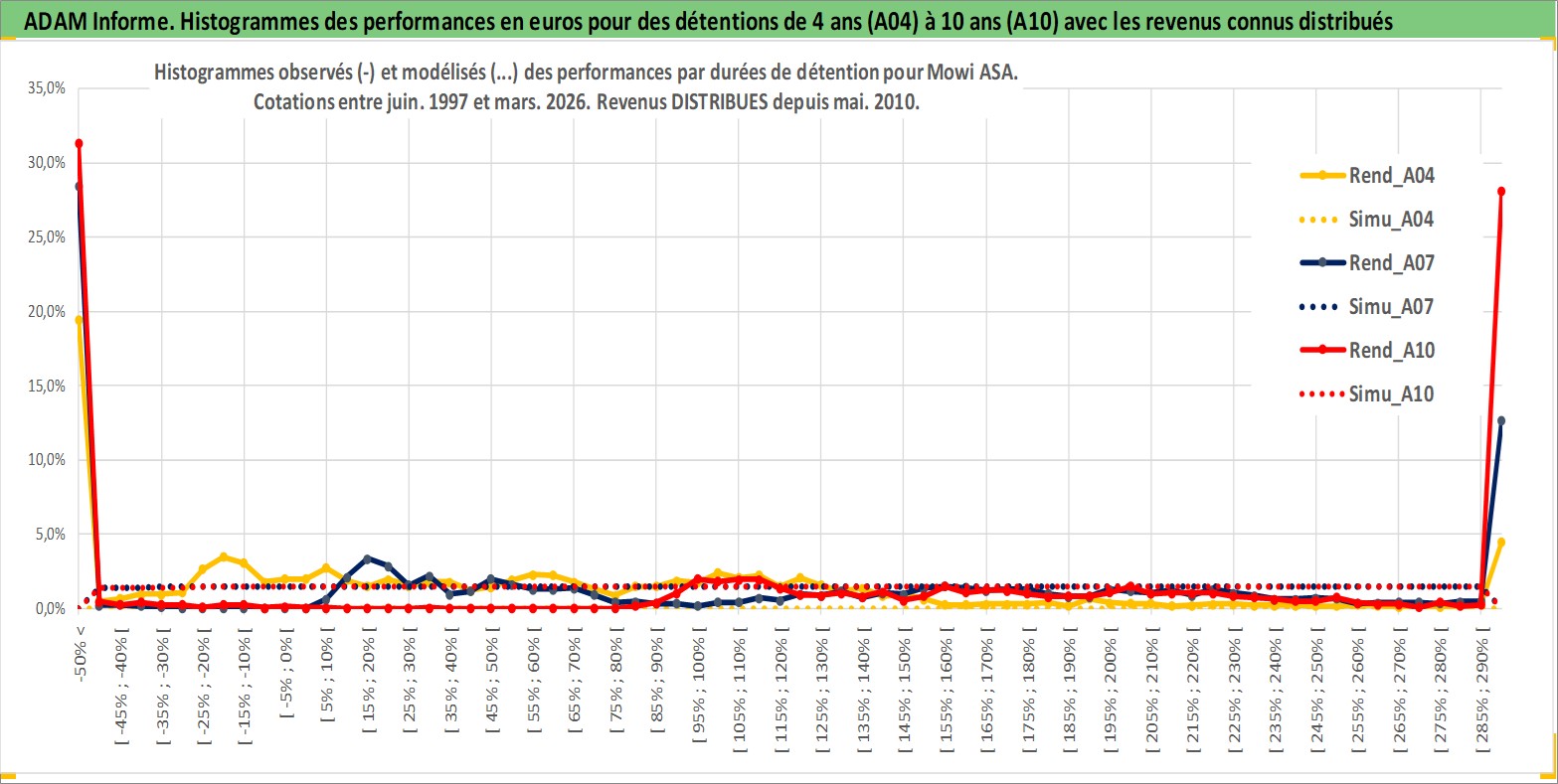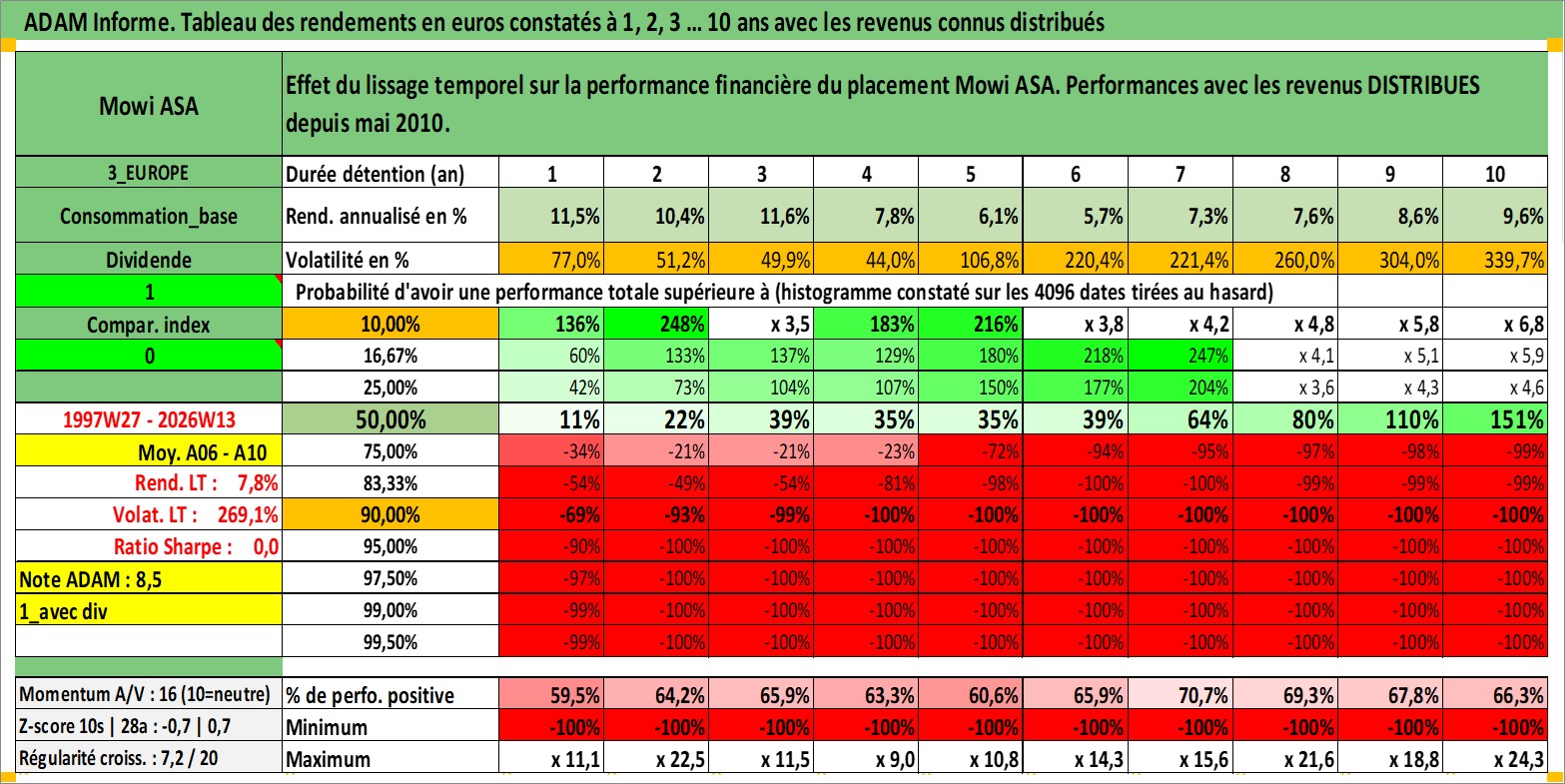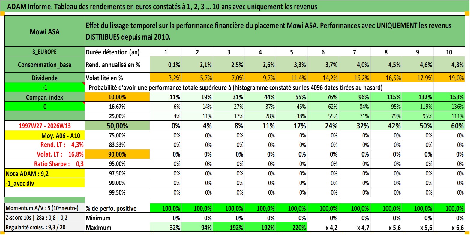 Site dédié aux investisseursPage dédiée sur site financeAnalyse des valorisations hebdomadaires de l'action Mowi ASA. Cet actif est cote en NOK. Les valorisations sont en contrevaleur EURO et couvrent les semaines 1997W27 a 2026W13. Les revenus de cet actif financier sont pris en compte depuis la semaine 2010W21. La note globale ESG de cet actif est estimee a 7.0 (apres rebasage entre 0 et 20).