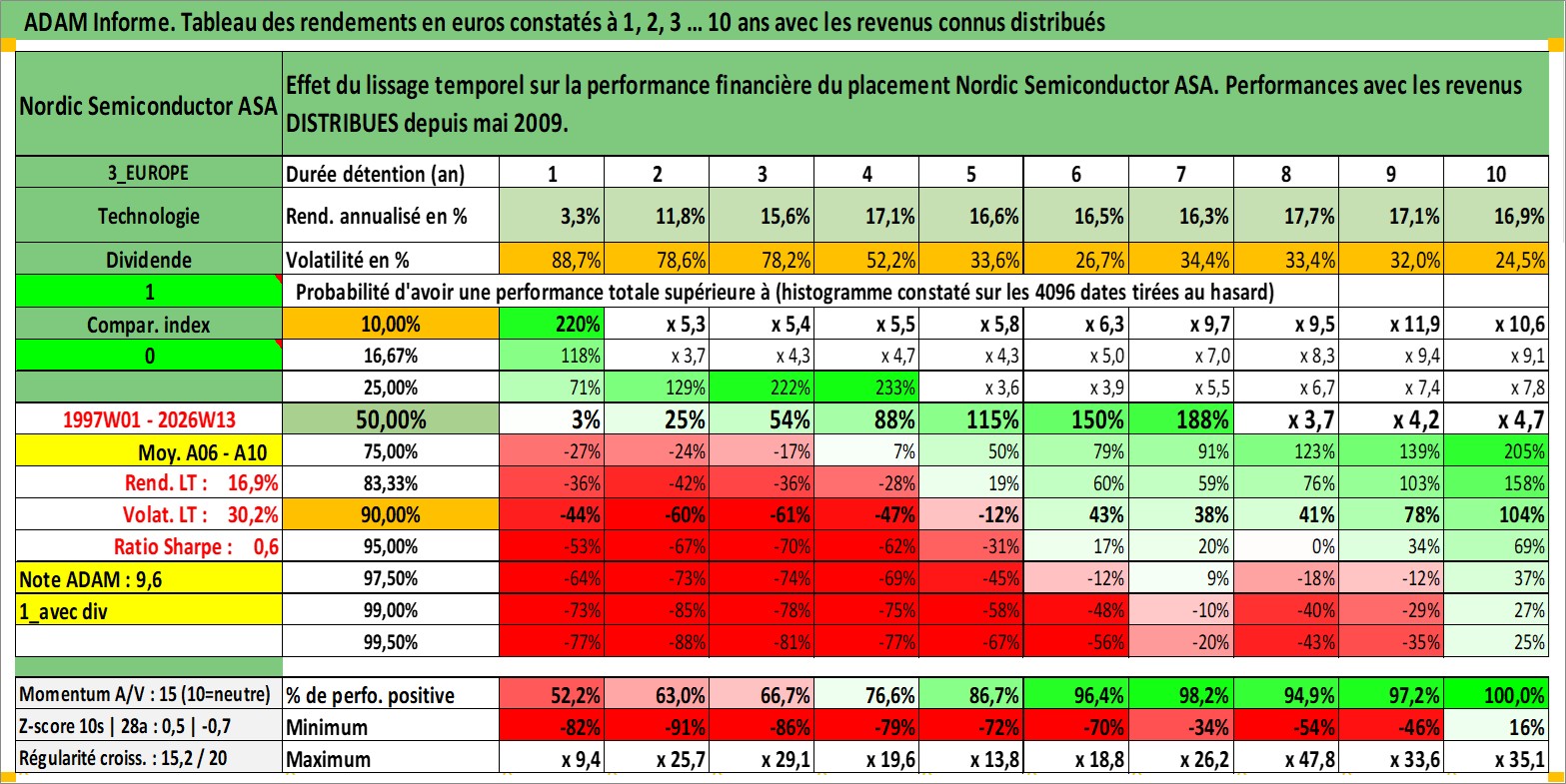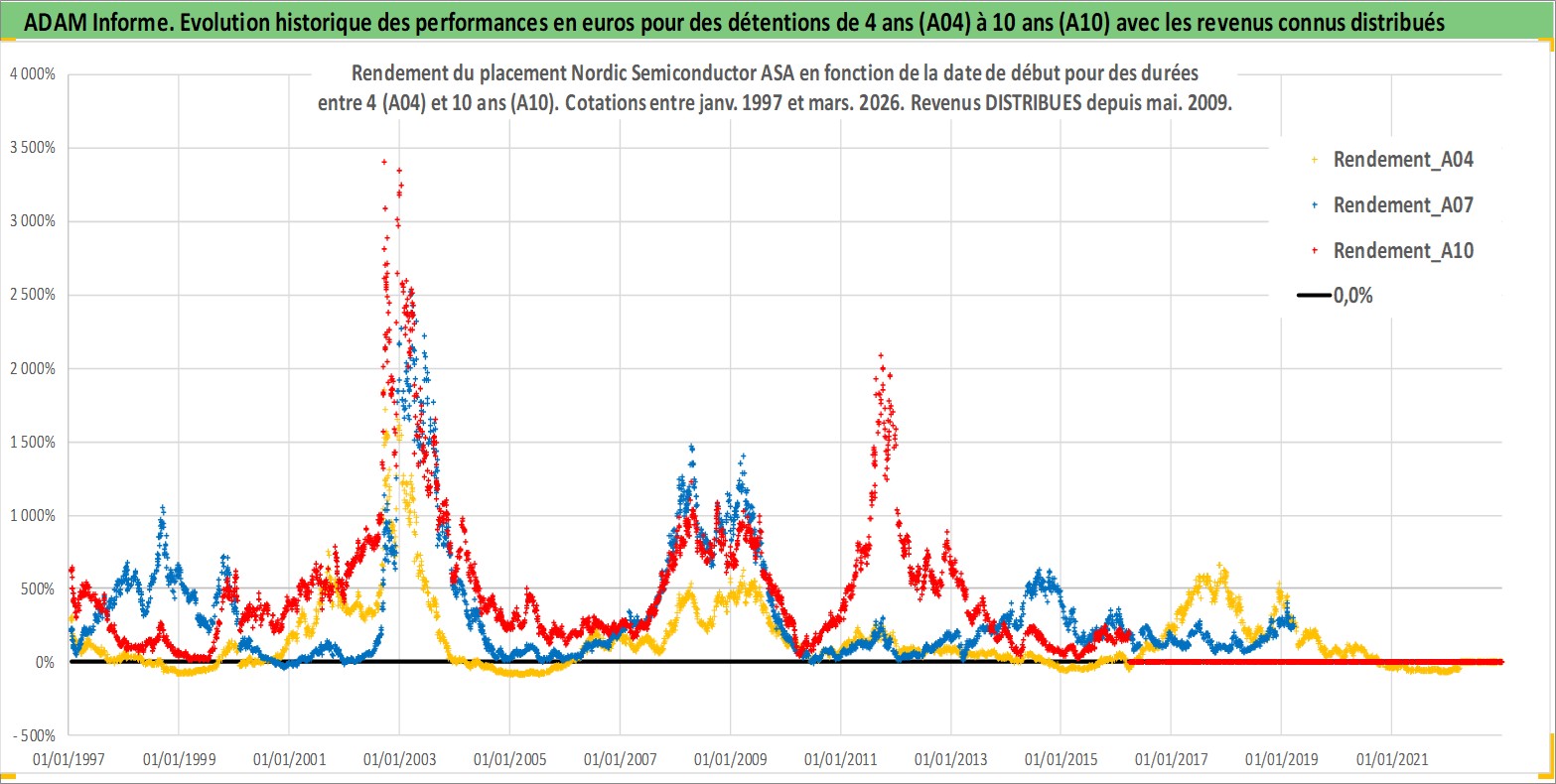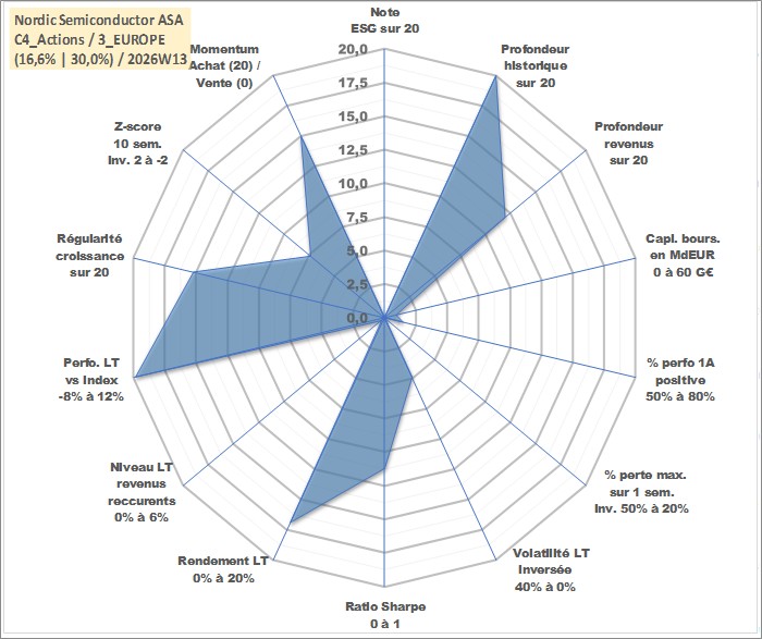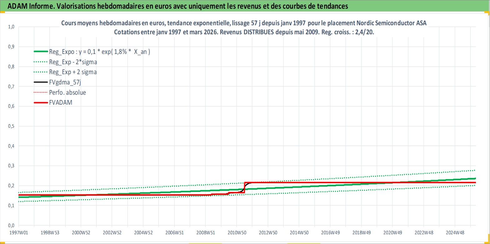 Site dédié aux investisseursPage dédiée sur site financeAnalyse des valorisations hebdomadaires de l'action Nordic Semiconductor ASA. Cet actif est cote en NOK. Les valorisations sont en contrevaleur EURO et couvrent les semaines 1997W01 a 2026W13. Les revenus de cet actif financier sont pris en compte depuis la semaine 2009W19. La note ESG de cet actif n'est pas connue.