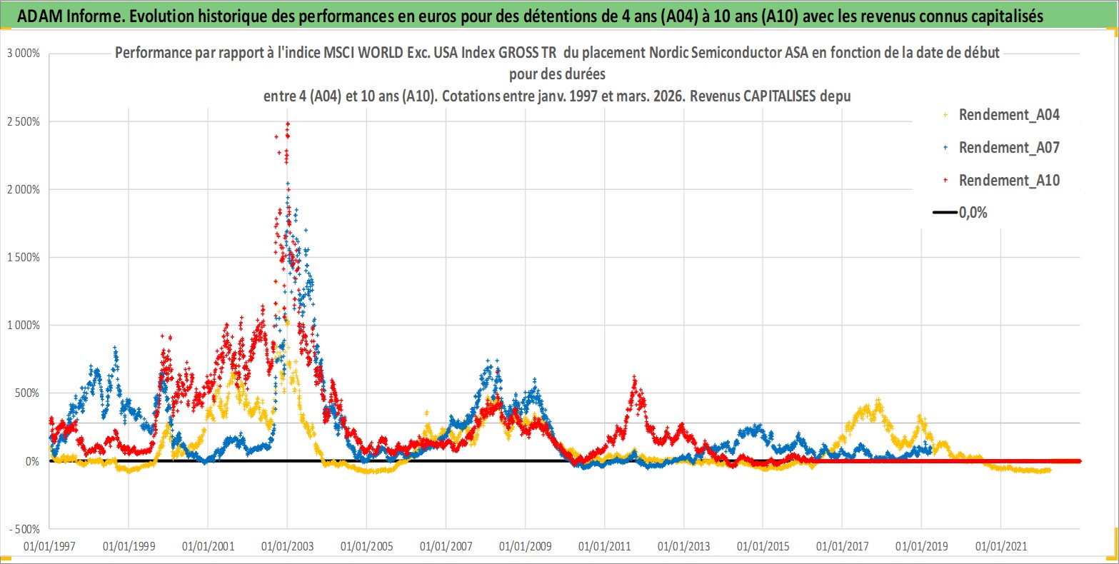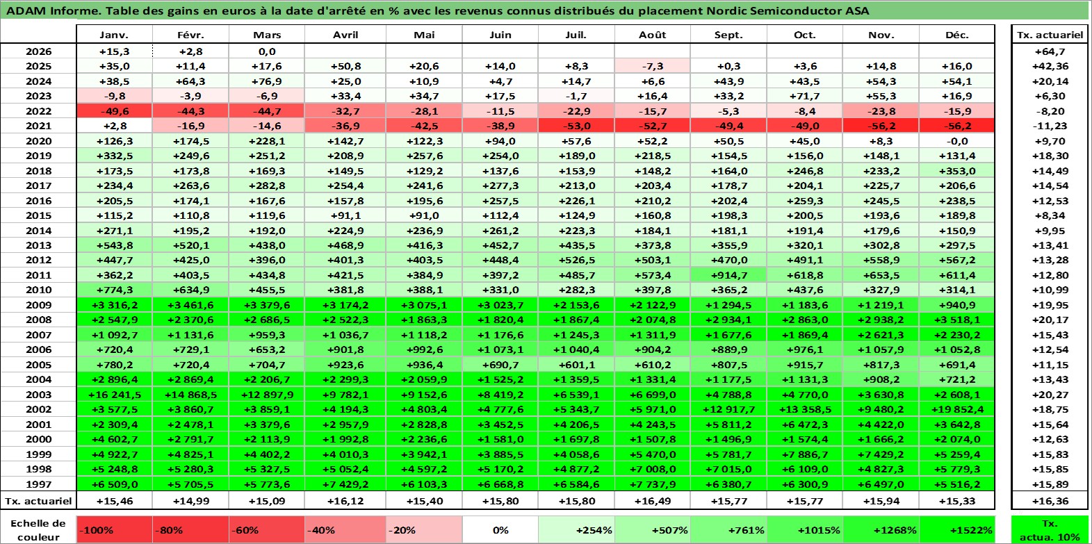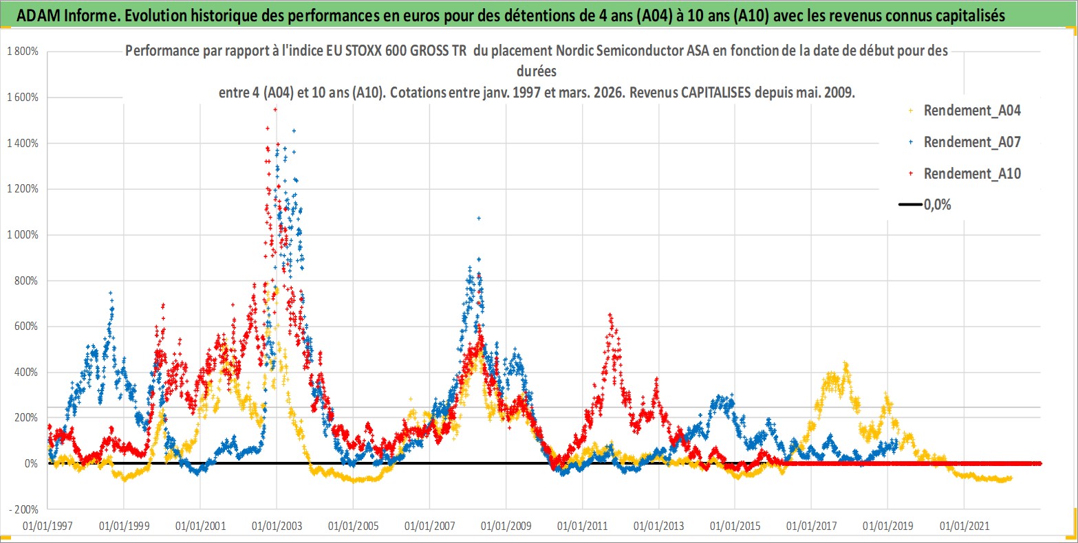 Site dédié aux investisseursPage dédiée sur site financeAnalyse des valorisations hebdomadaires de l'action Nordic Semiconductor ASA. Cet actif est cote en NOK. Les valorisations sont en contrevaleur EURO et couvrent les semaines 1997W01 a 2026W13. Les revenus de cet actif financier sont pris en compte depuis la semaine 2009W19. La note ESG de cet actif n'est pas connue.