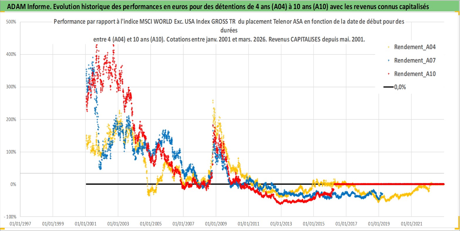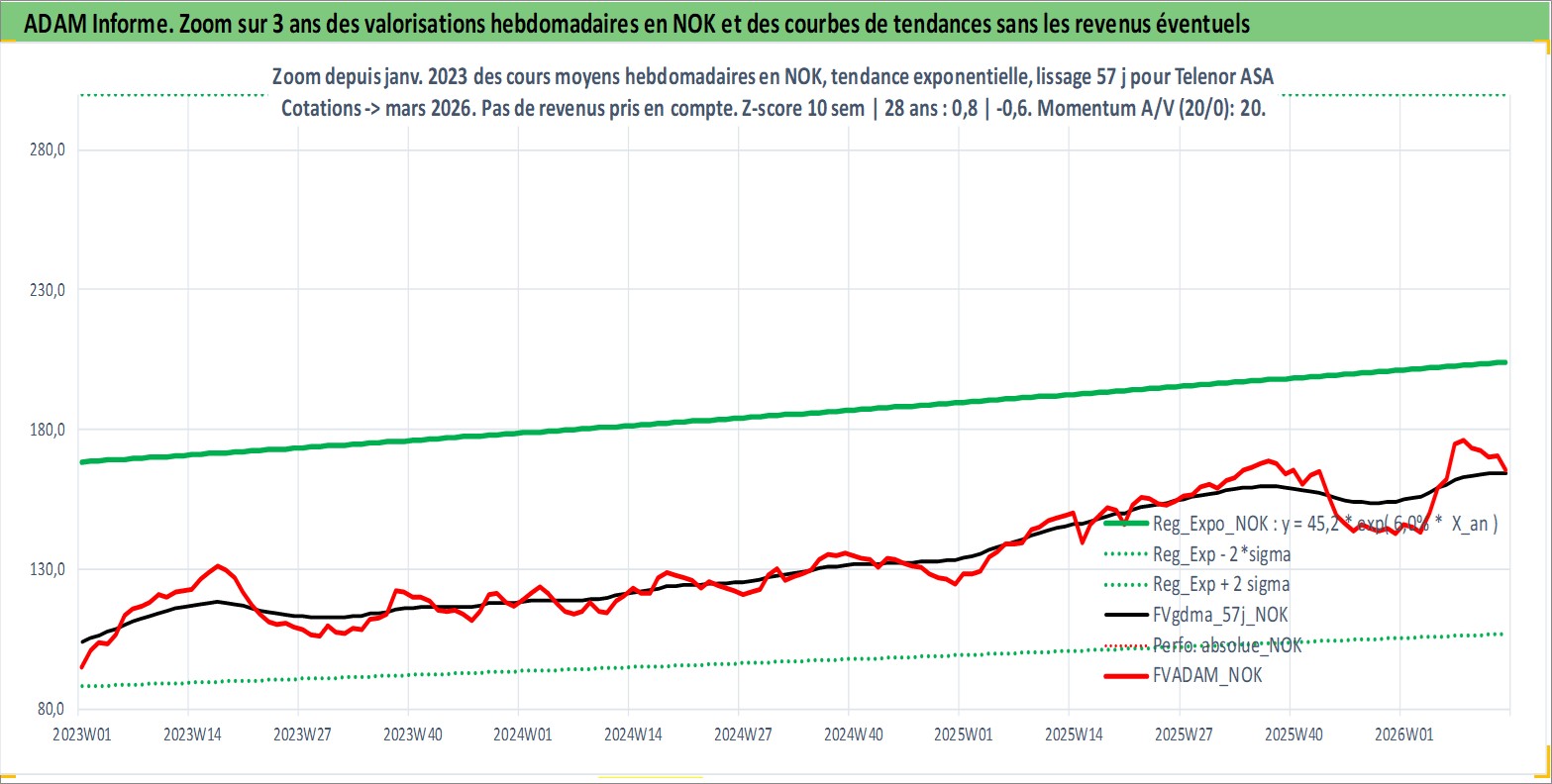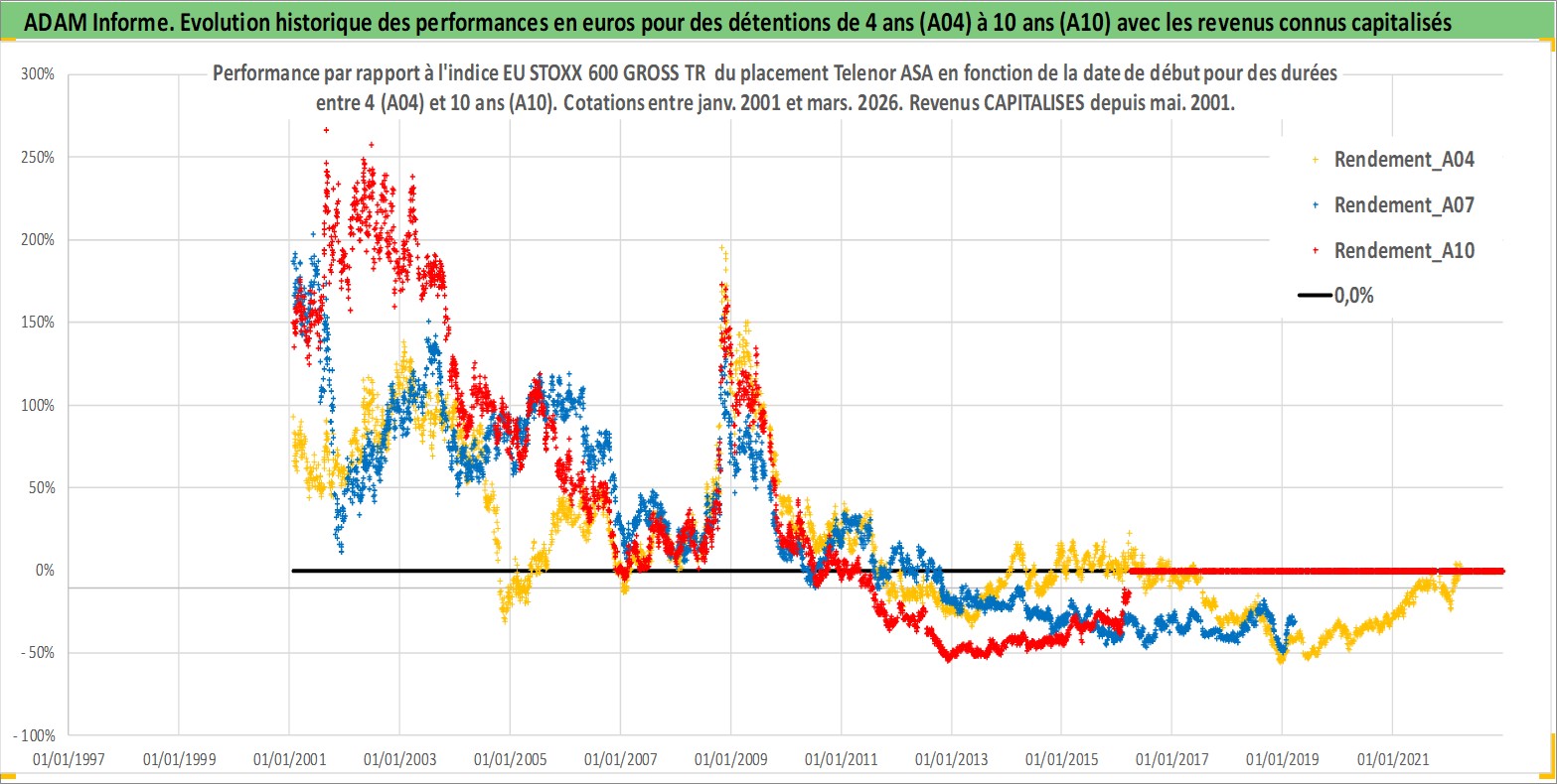 Site dédié aux investisseursPage dédiée sur site financeAnalyse des valorisations hebdomadaires de l'action Telenor ASA. Cet actif est cote en NOK. Les valorisations sont en contrevaleur EURO et couvrent les semaines 2001W02 a 2026W13. Les revenus de cet actif financier sont pris en compte depuis la semaine 2001W19. La note globale ESG de cet actif est estimee a 9.0 (apres rebasage entre 0 et 20).