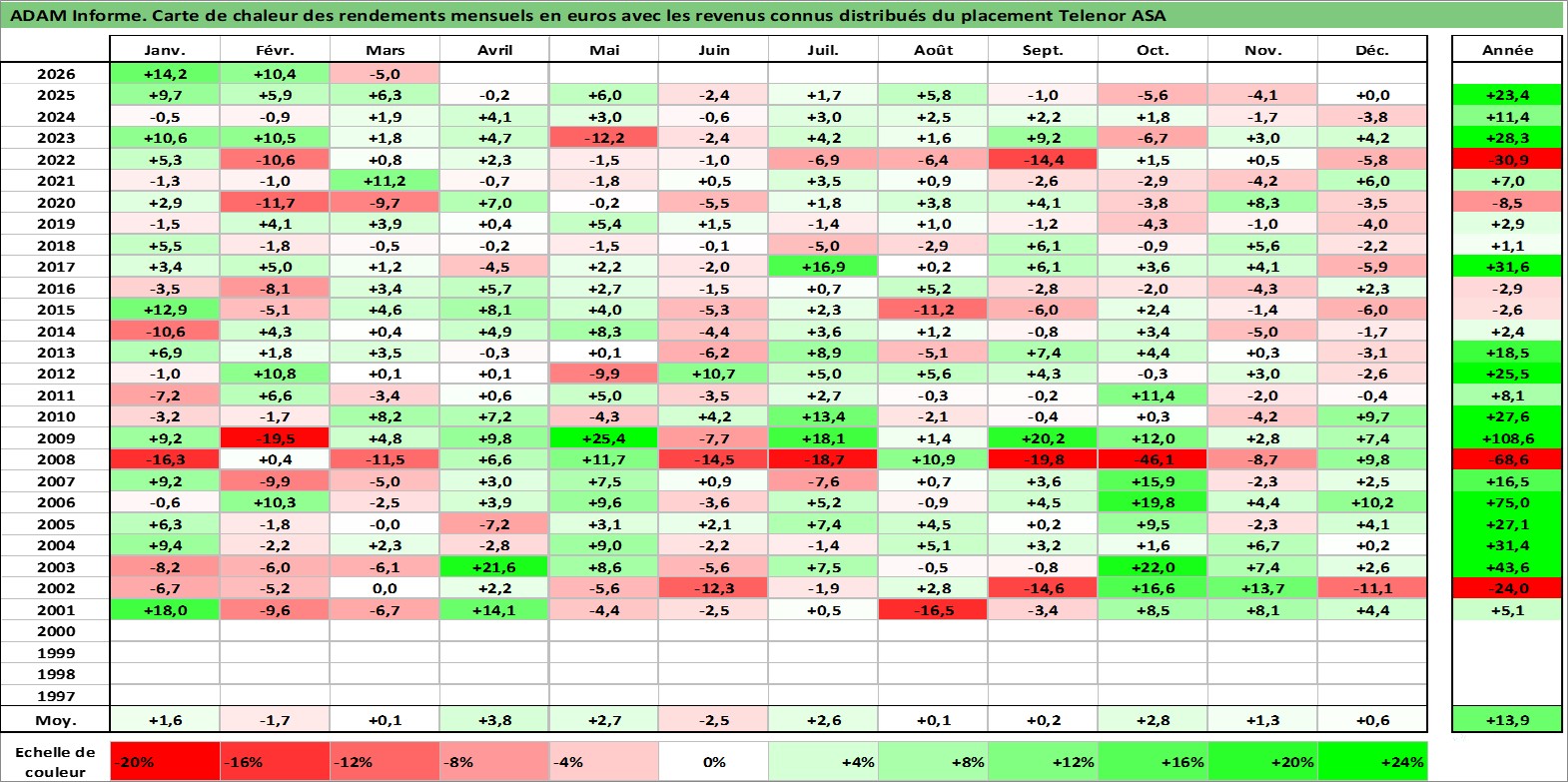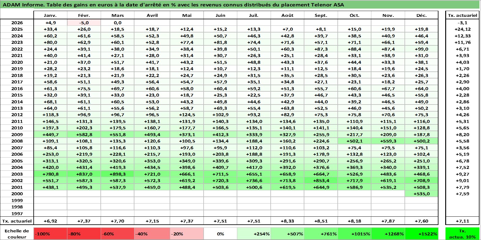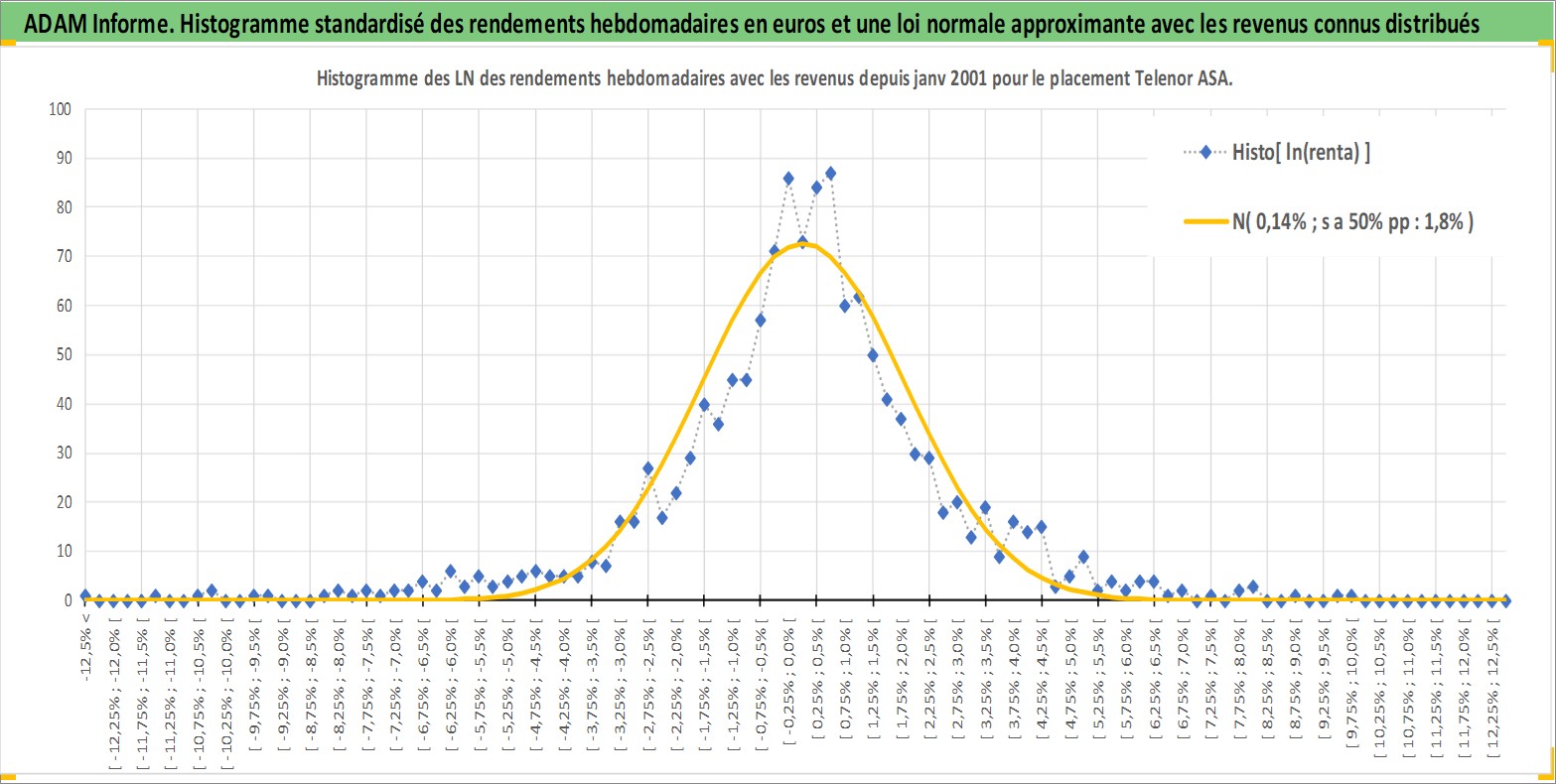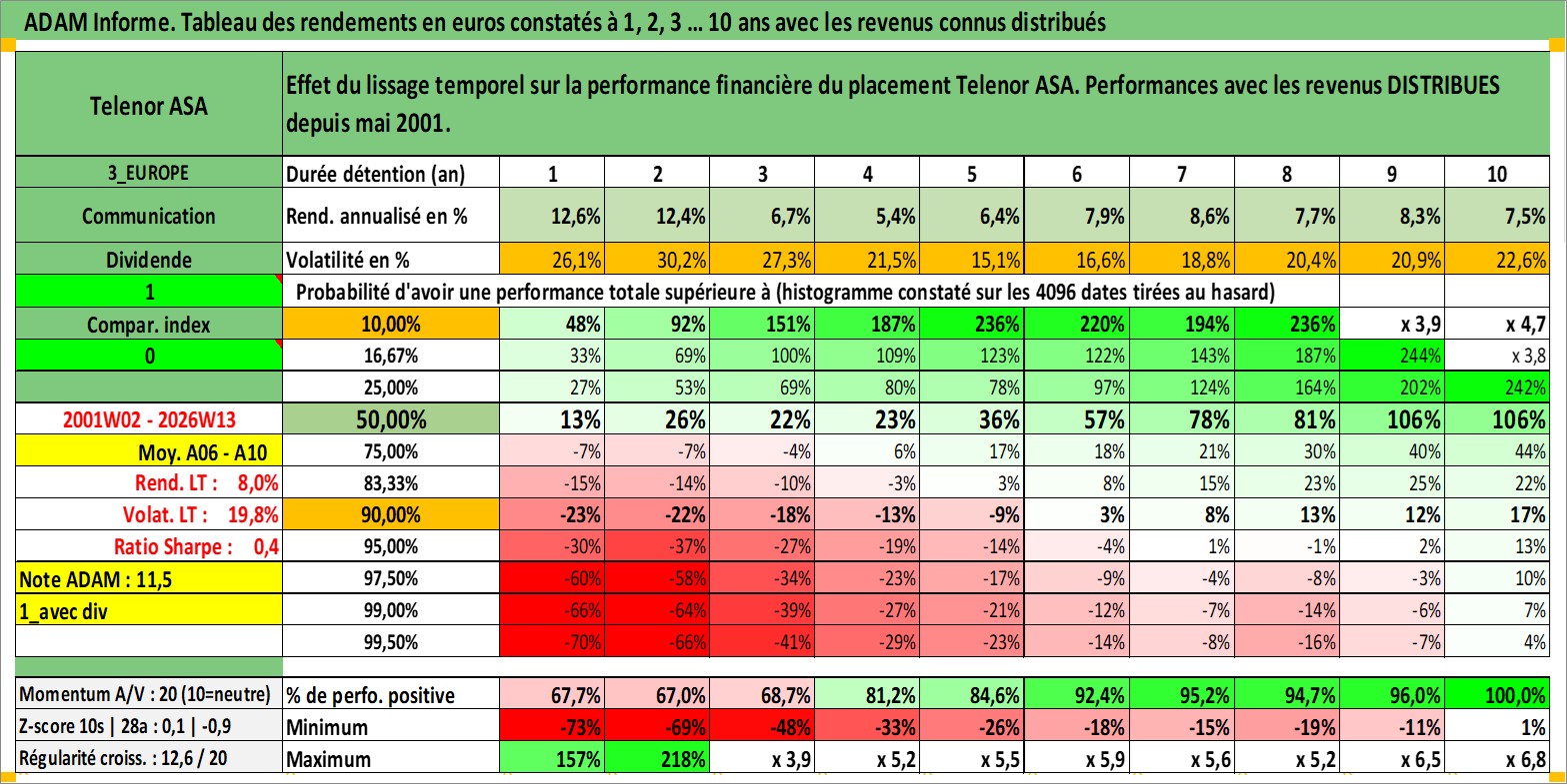 Site dédié aux investisseursPage dédiée sur site financeAnalyse des valorisations hebdomadaires de l'action Telenor ASA. Cet actif est cote en NOK. Les valorisations sont en contrevaleur EURO et couvrent les semaines 2001W02 a 2026W13. Les revenus de cet actif financier sont pris en compte depuis la semaine 2001W19. La note globale ESG de cet actif est estimee a 9.0 (apres rebasage entre 0 et 20).