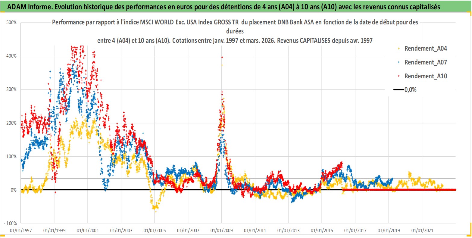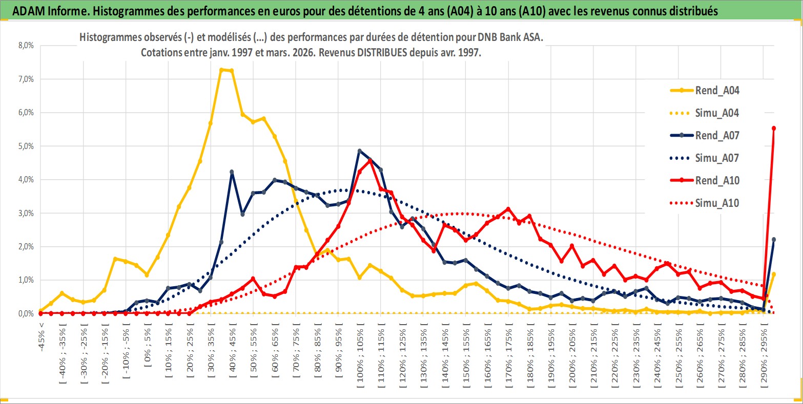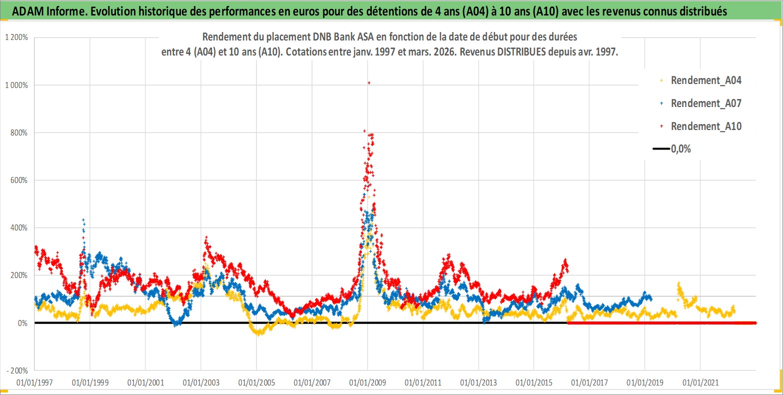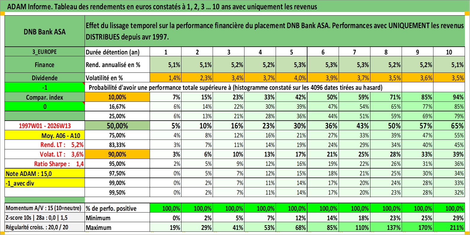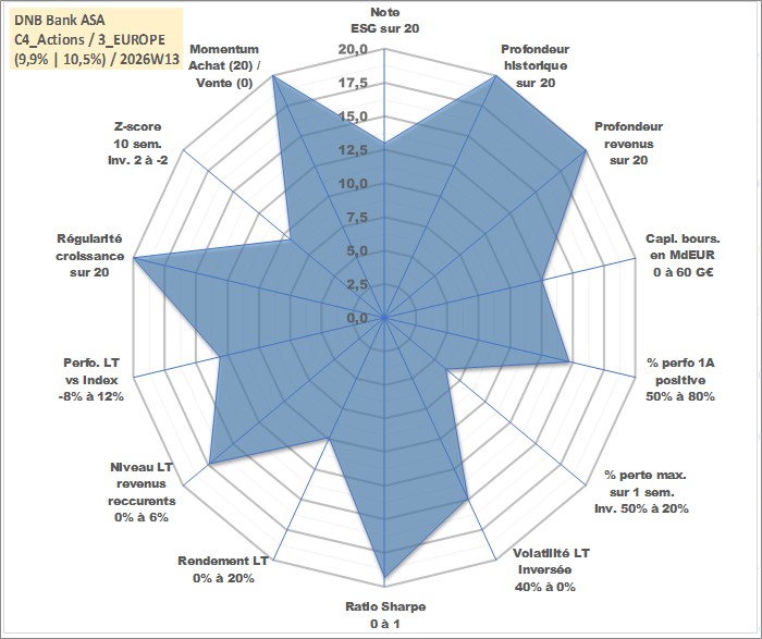 Site dédié aux investisseursPage dédiée sur site financeAnalyse des valorisations hebdomadaires de l'action DNB Bank ASA. Cet actif est cote en NOK. Les valorisations sont en contrevaleur EURO et couvrent les semaines 1997W01 a 2026W13. Les revenus de cet actif financier sont pris en compte depuis la semaine 1997W17. La note globale ESG de cet actif est estimee a 13.0 (apres rebasage entre 0 et 20).