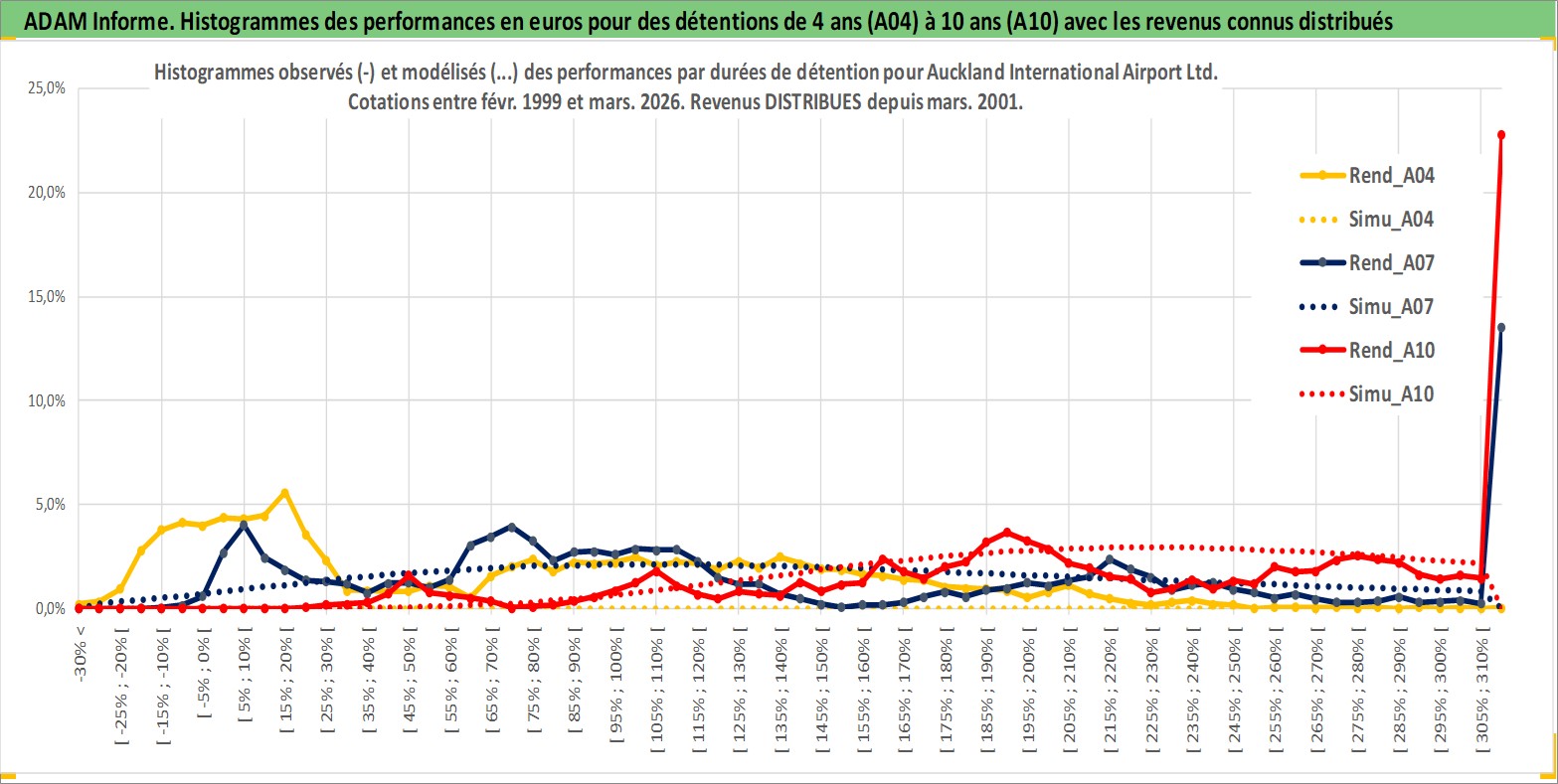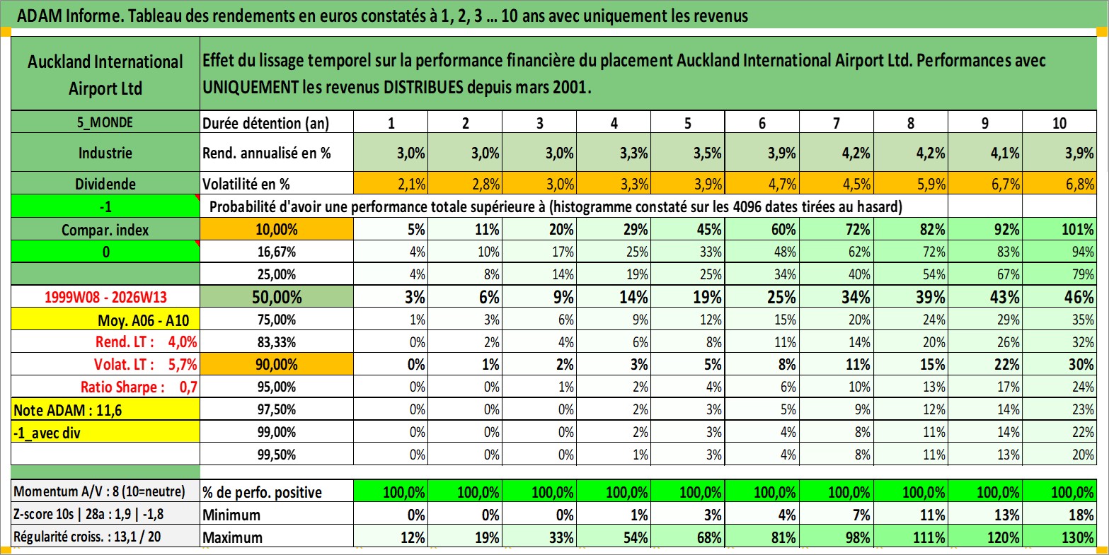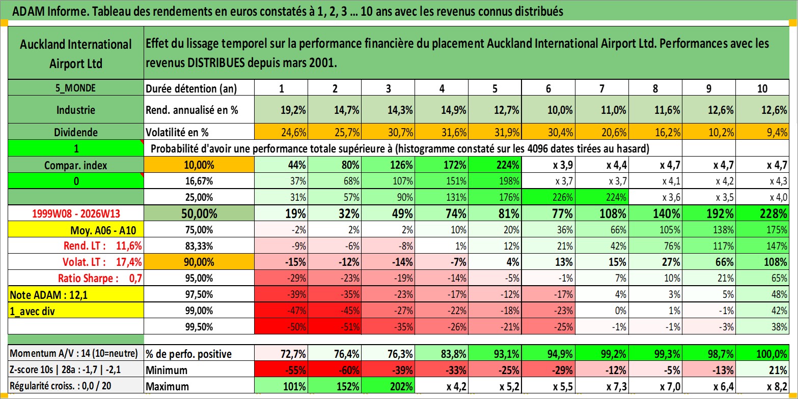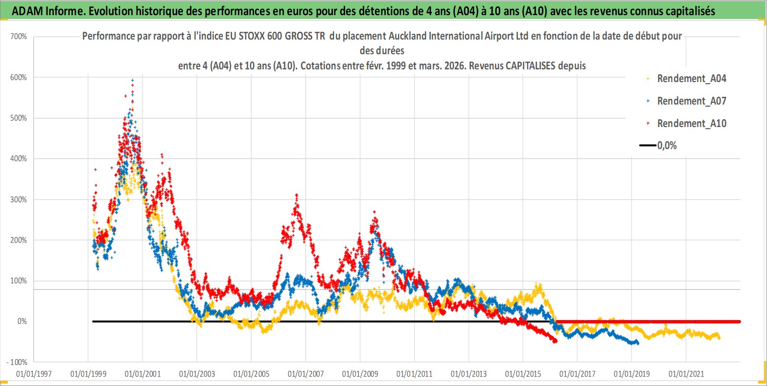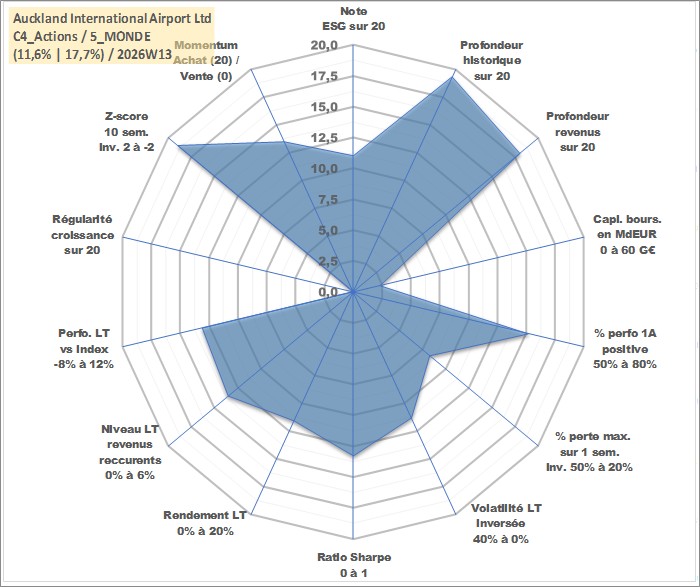 Site dédié aux investisseursPage dédiée sur site financeAnalyse des valorisations hebdomadaires de l'action Auckland International Airport Ltd. Cet actif est cote en AUD. Les valorisations sont en contrevaleur EURO et couvrent les semaines 1999W08 a 2026W13. Les revenus de cet actif financier sont pris en compte depuis la semaine 2001W11. La note globale ESG de cet actif est estimee a 11.0 (apres rebasage entre 0 et 20).