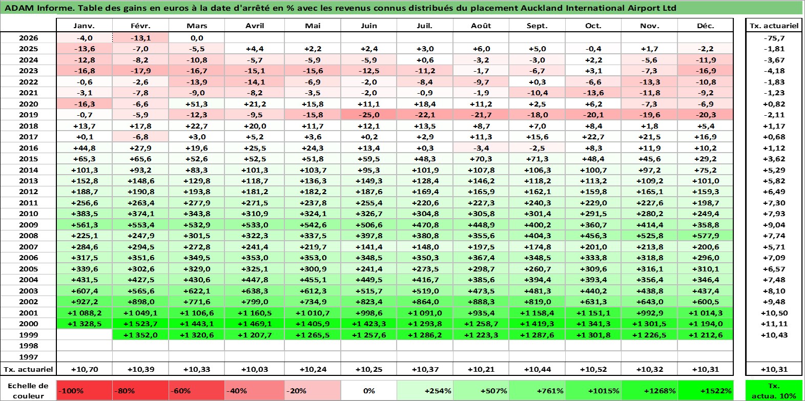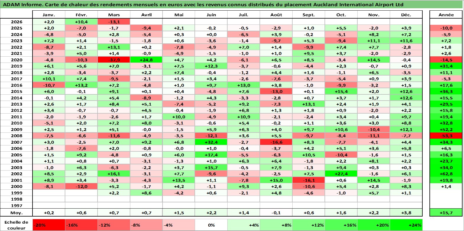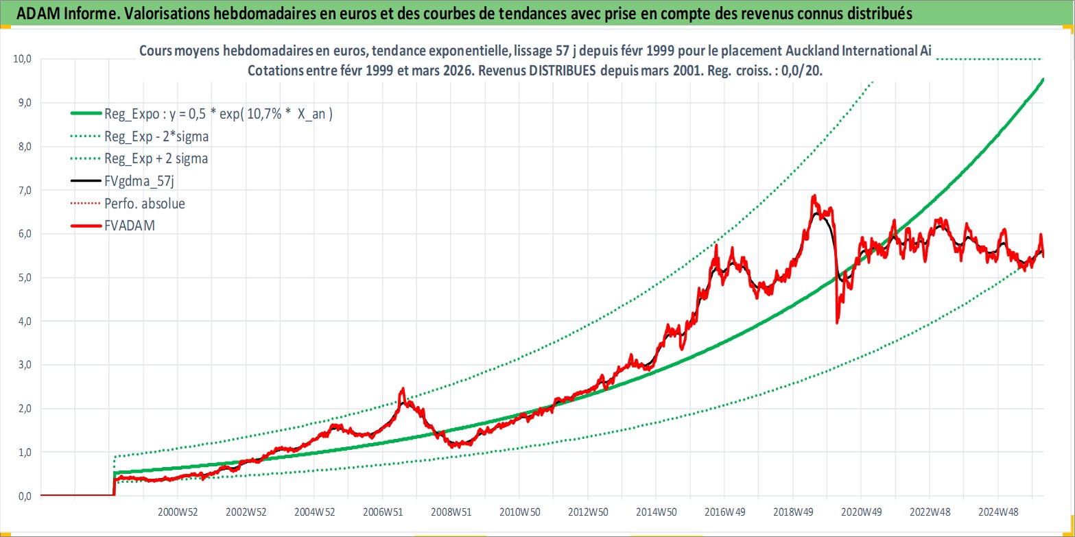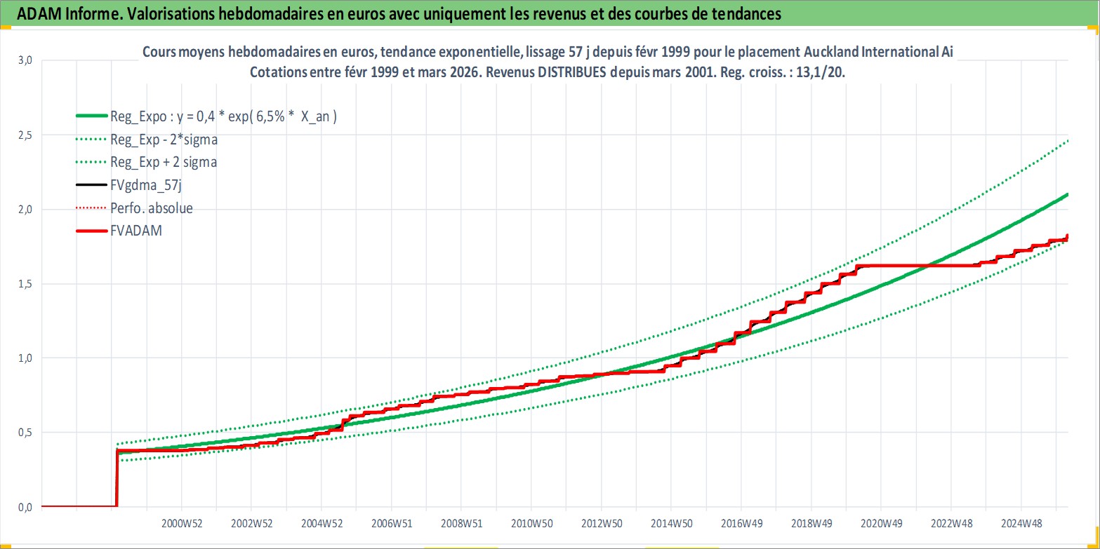 Site dédié aux investisseursPage dédiée sur site financeAnalyse des valorisations hebdomadaires de l'action Auckland International Airport Ltd. Cet actif est cote en AUD. Les valorisations sont en contrevaleur EURO et couvrent les semaines 1999W08 a 2026W13. Les revenus de cet actif financier sont pris en compte depuis la semaine 2001W11. La note globale ESG de cet actif est estimee a 11.0 (apres rebasage entre 0 et 20).