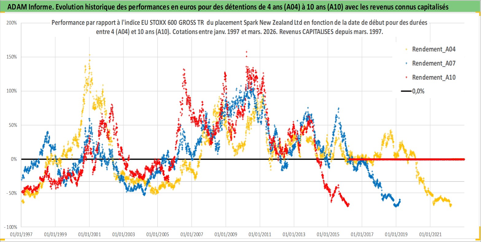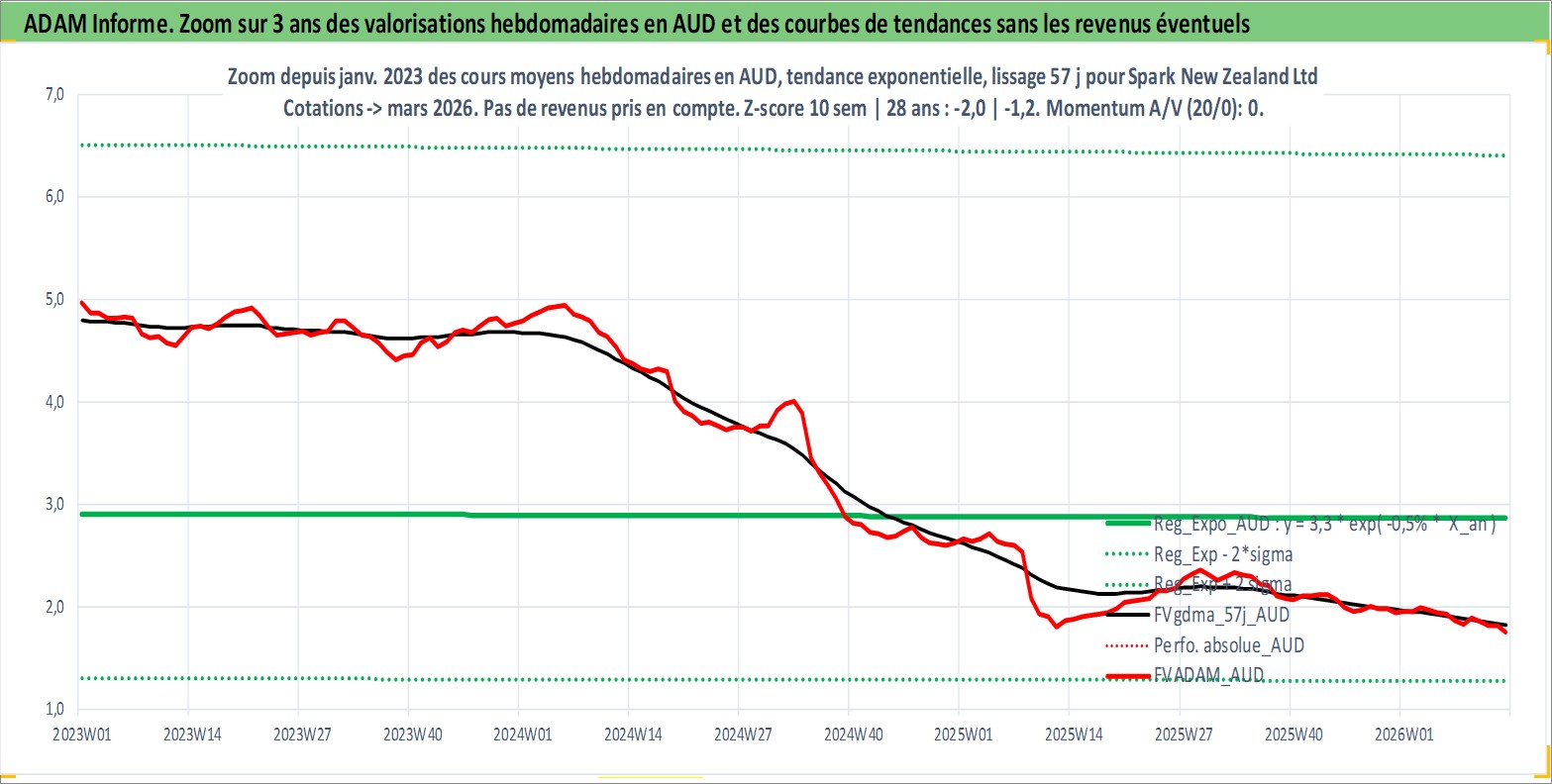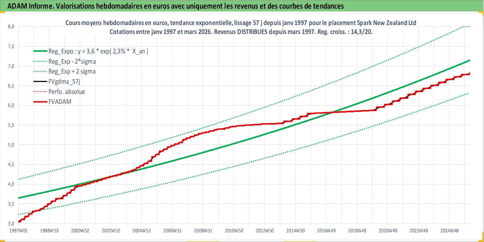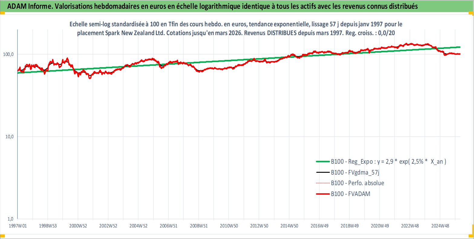 Site dédié aux investisseursPage dédiée sur site financeAnalyse des valorisations hebdomadaires de l'action Spark New Zealand Ltd. Cet actif est cote en AUD. Les valorisations sont en contrevaleur EURO et couvrent les semaines 1997W01 a 2026W13. Les revenus de cet actif financier sont pris en compte depuis la semaine 1997W09. La note ESG de cet actif n'est pas connue.