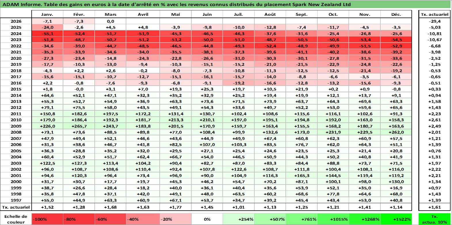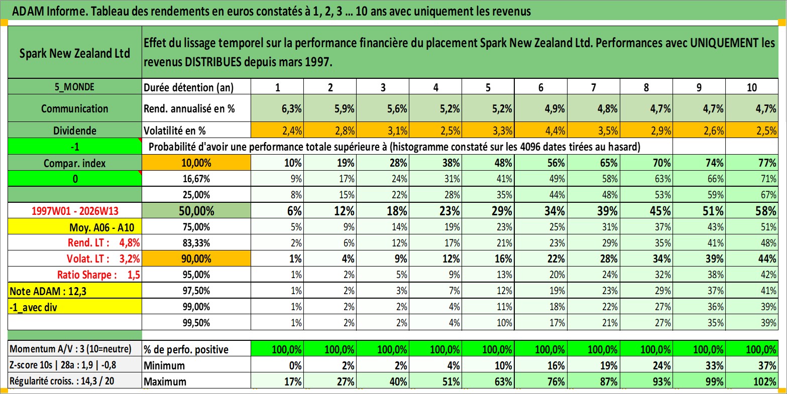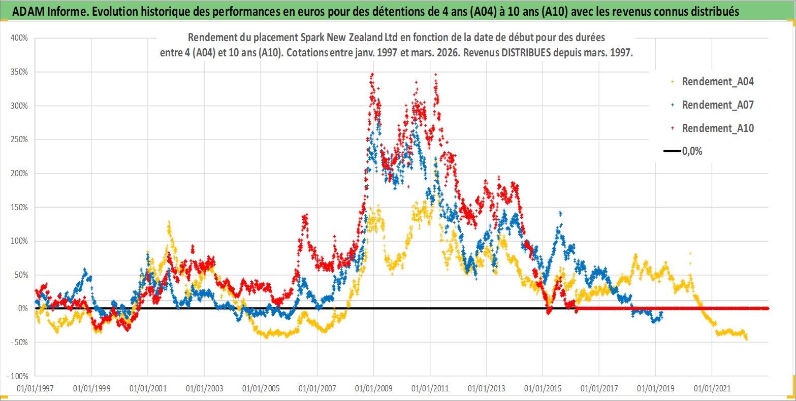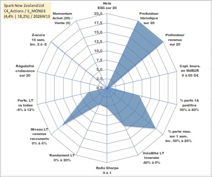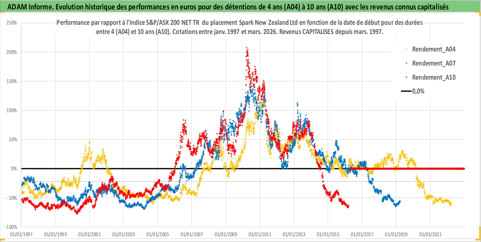 Site dédié aux investisseursPage dédiée sur site financeAnalyse des valorisations hebdomadaires de l'action Spark New Zealand Ltd. Cet actif est cote en AUD. Les valorisations sont en contrevaleur EURO et couvrent les semaines 1997W01 a 2026W13. Les revenus de cet actif financier sont pris en compte depuis la semaine 1997W09. La note ESG de cet actif n'est pas connue.