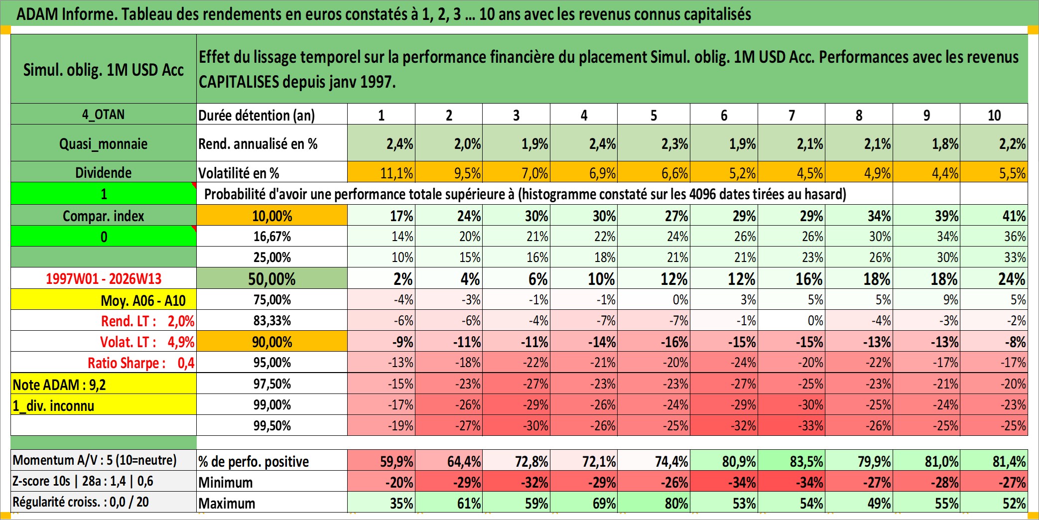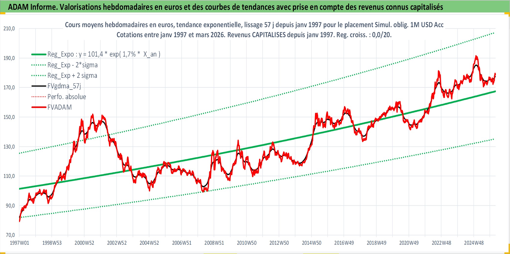 Site dédié aux investisseursPage dédiée sur site financeAnalyse des valorisations hebdomadaires de l'action Simul. oblig. 1M USD Acc. Cet actif est cote en USD. Les valorisations sont en contrevaleur EURO et couvrent les semaines 1997W01 a 2026W13. Les revenus de cet actif financier sont pris en compte depuis la semaine 1997W01. La note ESG de cet actif n'est pas connue.