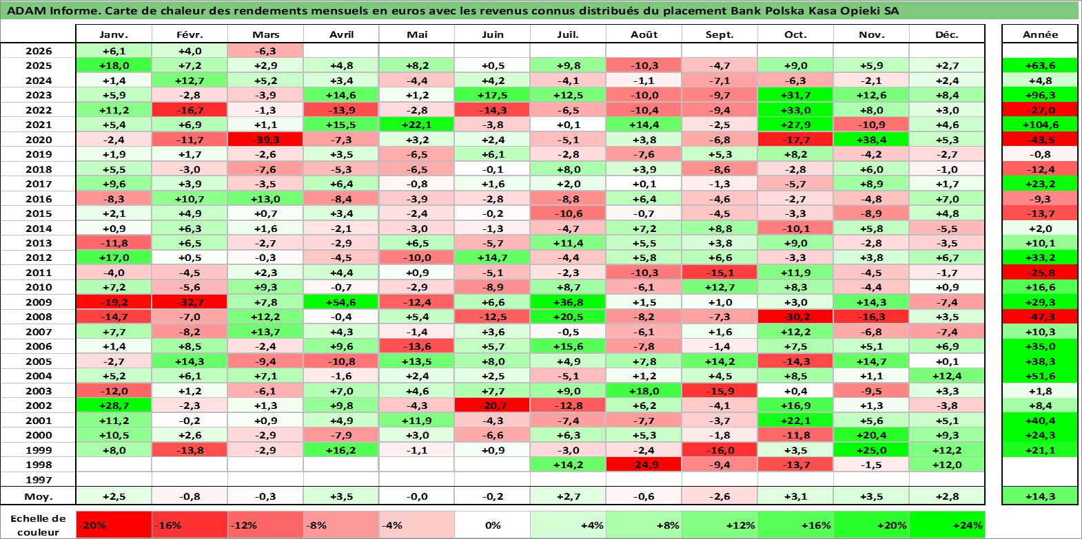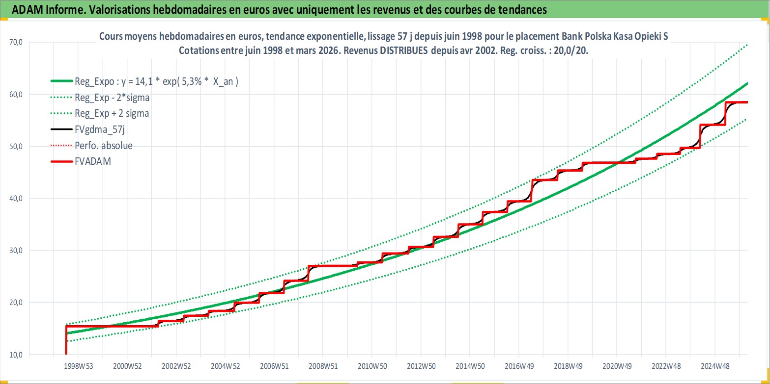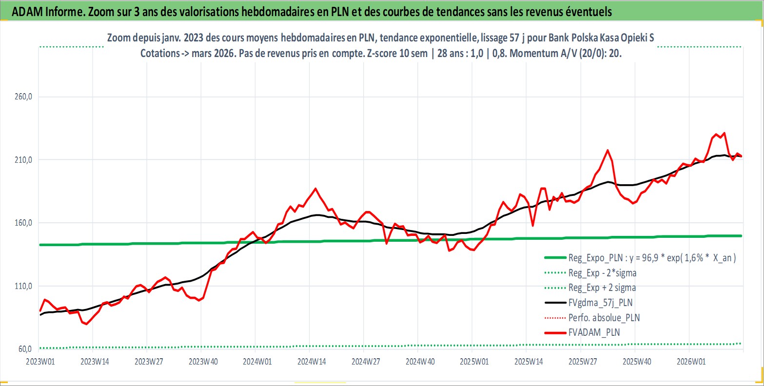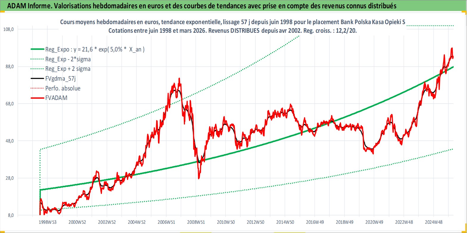 Site dédié aux investisseursPage dédiée sur site financeAnalyse des valorisations hebdomadaires de l'action Bank Polska Kasa Opieki SA. Cet actif est cote en PLN. Les valorisations sont en contrevaleur EURO et couvrent les semaines 1998W27 a 2026W13. Les revenus de cet actif financier sont pris en compte depuis la semaine 2002W15. La note globale ESG de cet actif est estimee a 7.0 (apres rebasage entre 0 et 20).