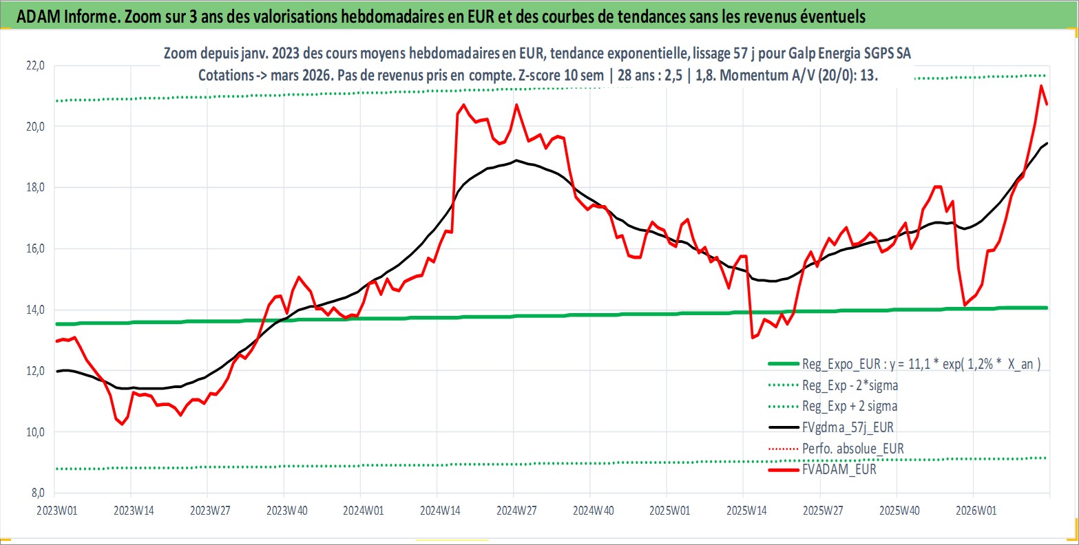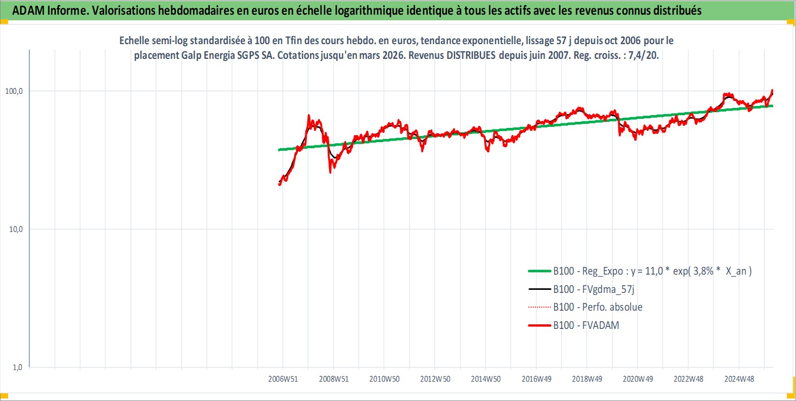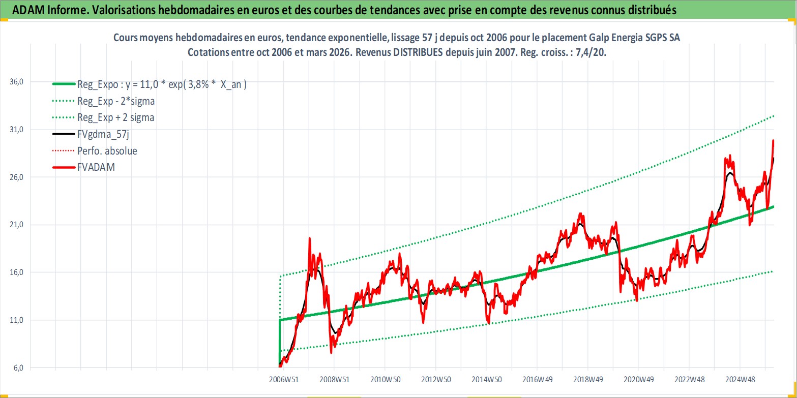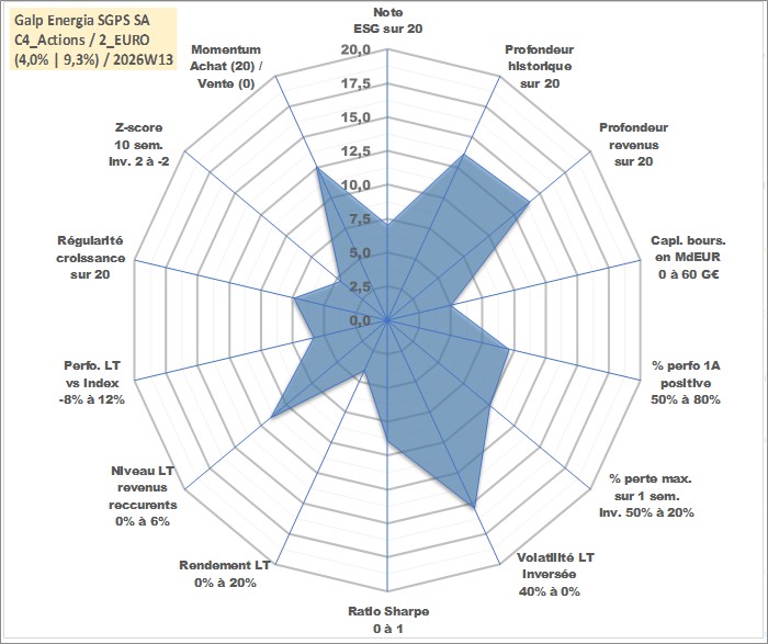 Site dédié aux investisseursPage dédiée sur site financeAnalyse des valorisations hebdomadaires de l'action Galp Energia SGPS SA. Cet actif est cote en EUR. Les valorisations couvrent les semaines 2006W43 a 2026W13. Les revenus de cet actif financier sont pris en compte depuis la semaine 2007W24. La note globale ESG de cet actif est estimee a 7.0 (apres rebasage entre 0 et 20).