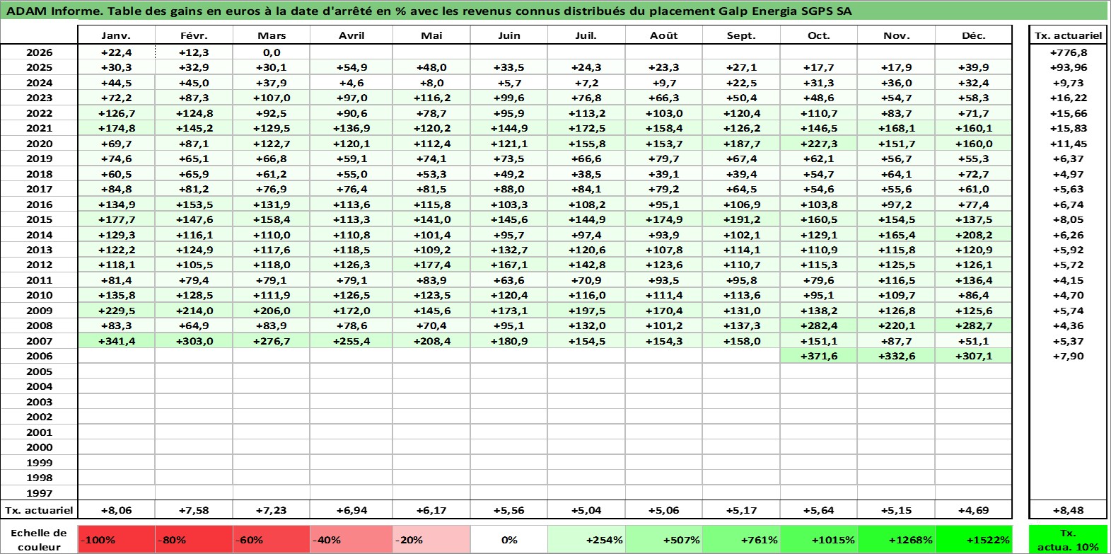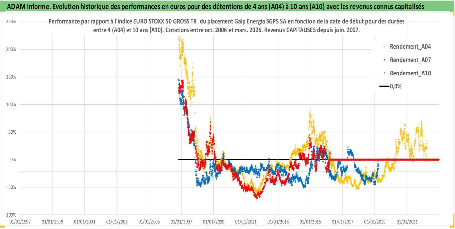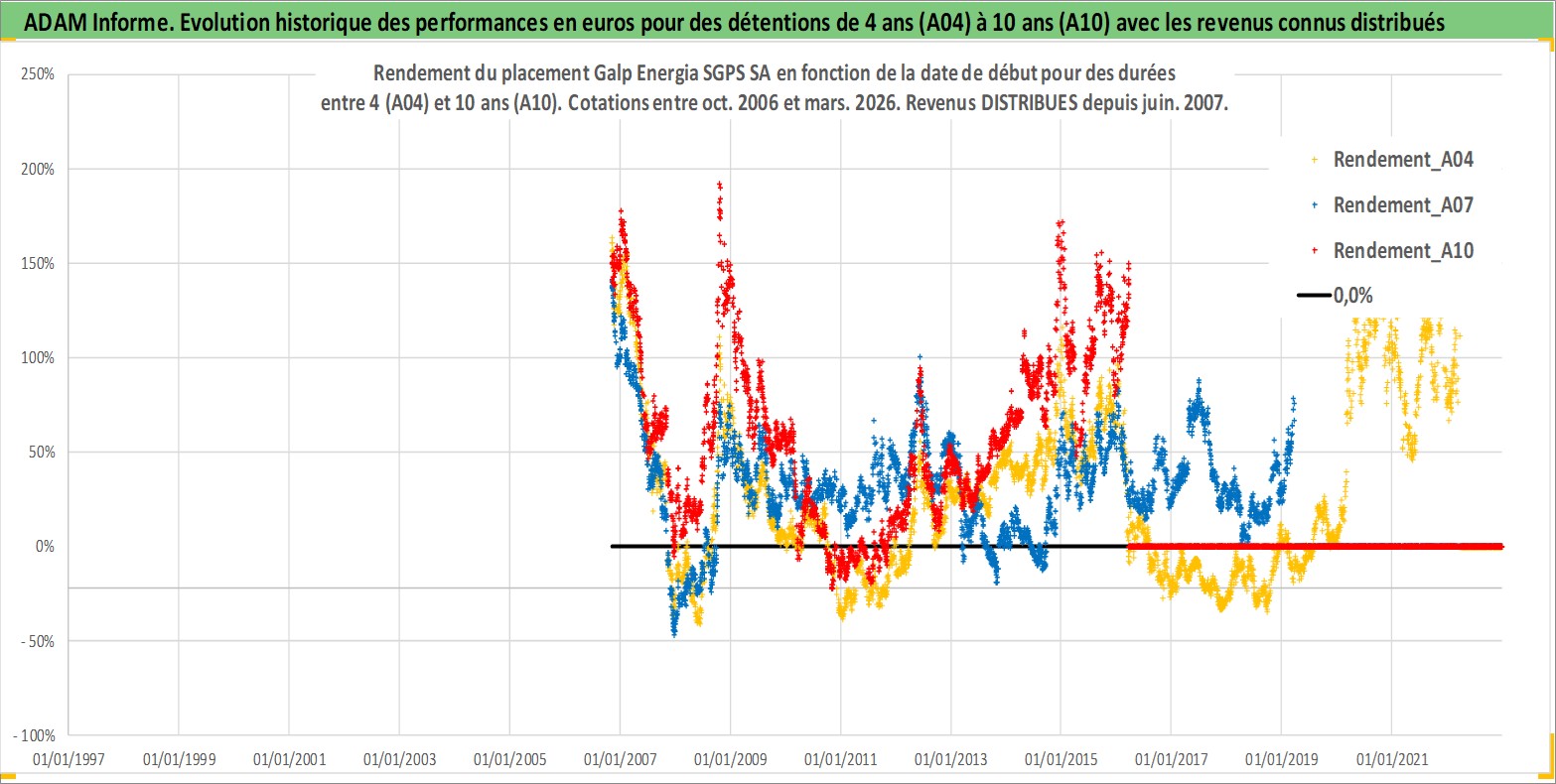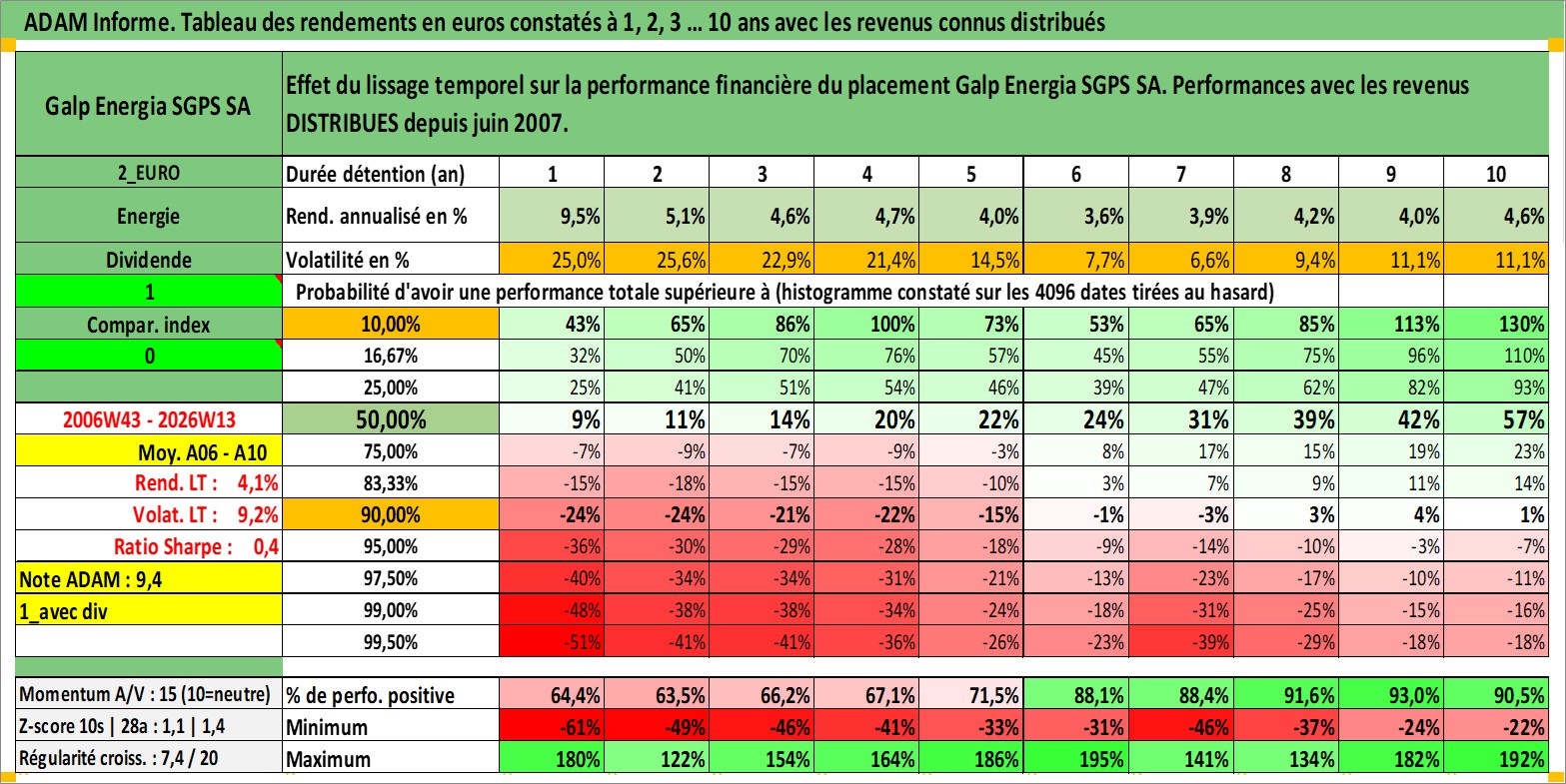 Site dédié aux investisseursPage dédiée sur site financeAnalyse des valorisations hebdomadaires de l'action Galp Energia SGPS SA. Cet actif est cote en EUR. Les valorisations couvrent les semaines 2006W43 a 2026W13. Les revenus de cet actif financier sont pris en compte depuis la semaine 2007W24. La note globale ESG de cet actif est estimee a 7.0 (apres rebasage entre 0 et 20).