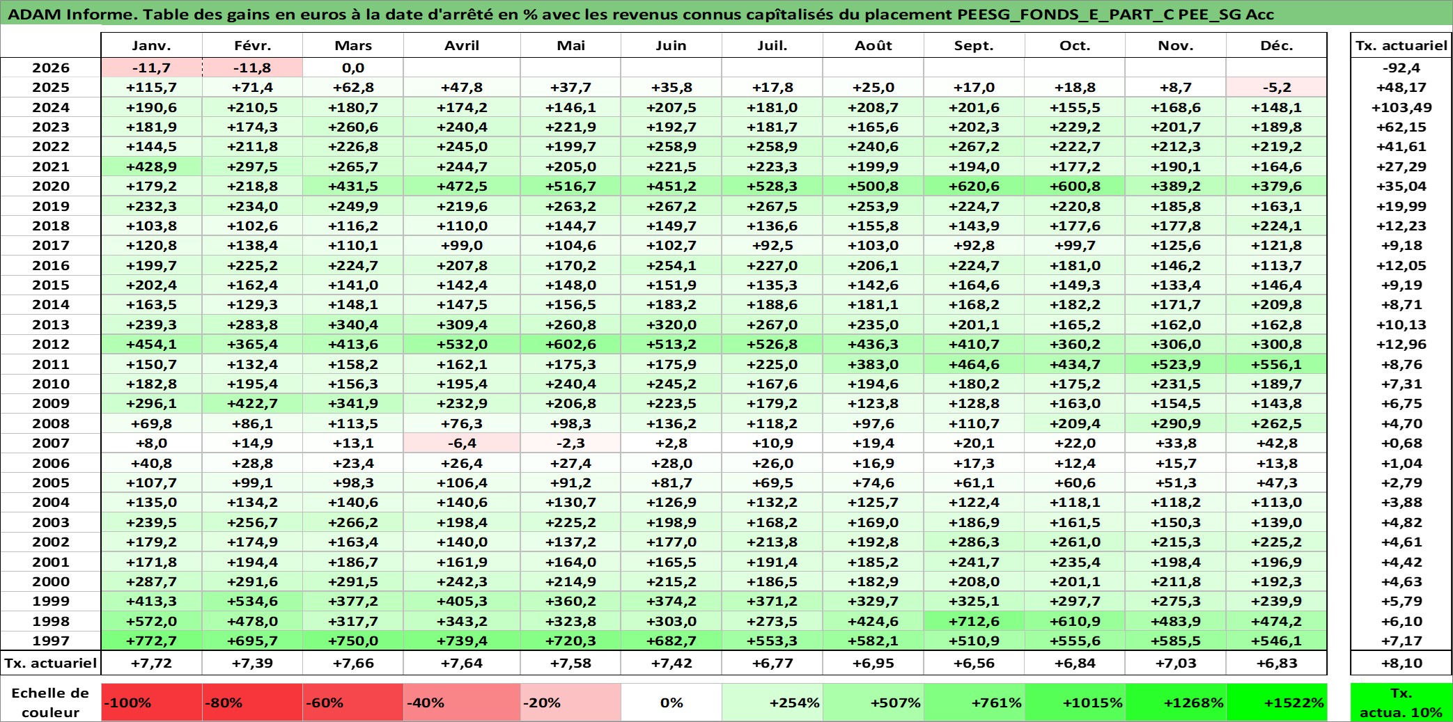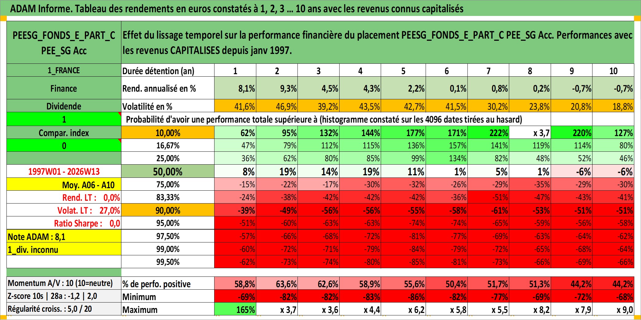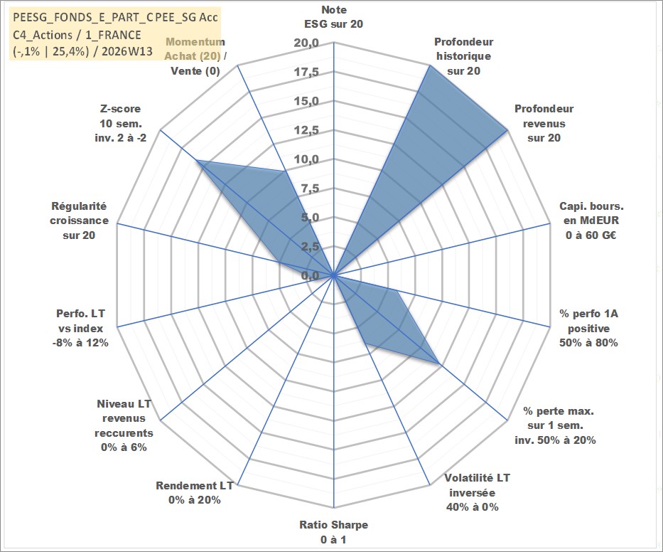 Site dédié aux investisseursPage dédiée sur site financeAnalyse des valorisations hebdomadaires du fonds PEESG_FONDS_E_PART_C PEE_SG Acc. Cet actif est cote en EUR. Les valorisations couvrent les semaines 1997W01 a 2026W13. Les revenus de cet actif financier sont pris en compte depuis la semaine 1997W01. La note ESG de cet actif n'est pas connue.