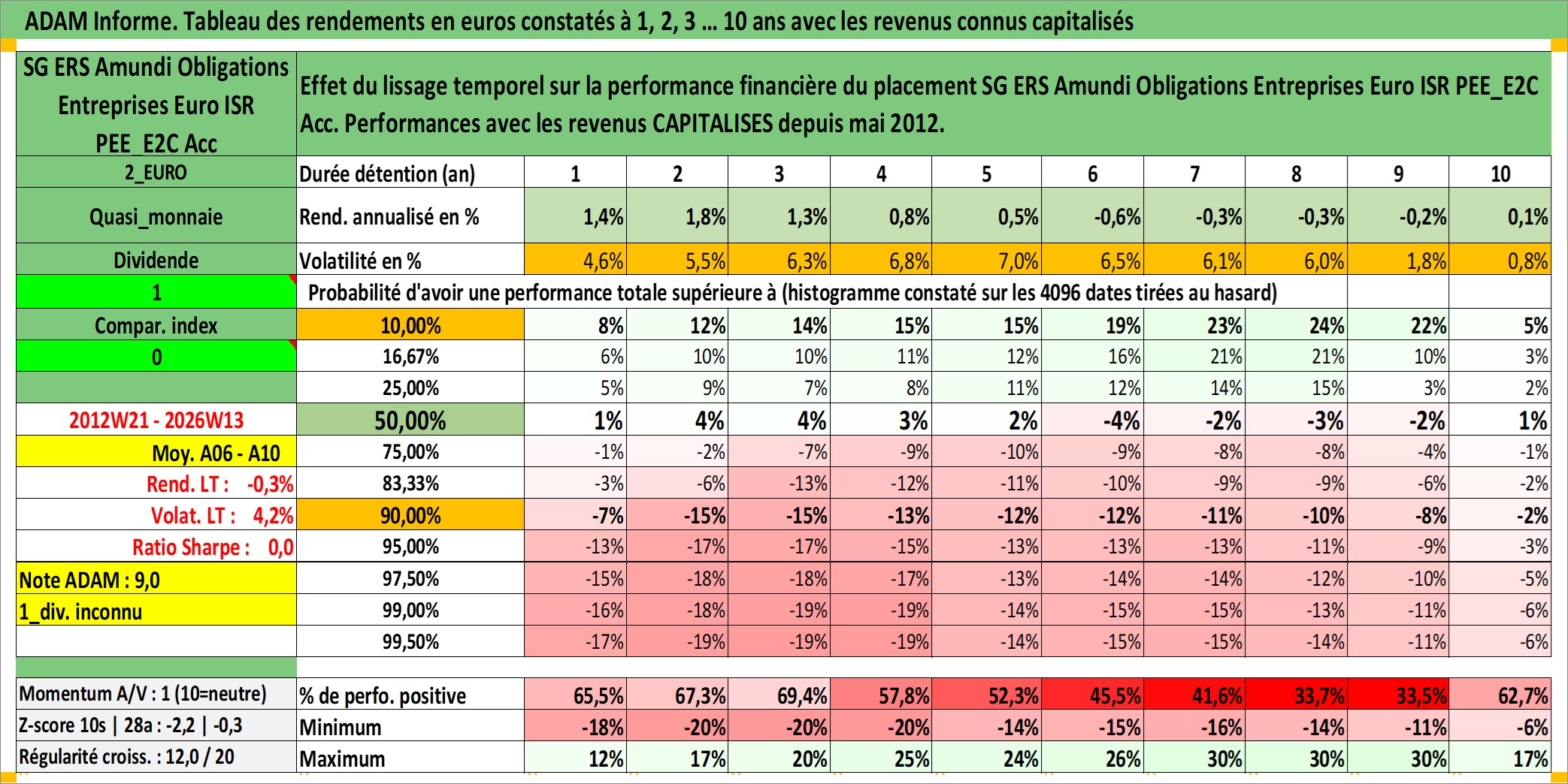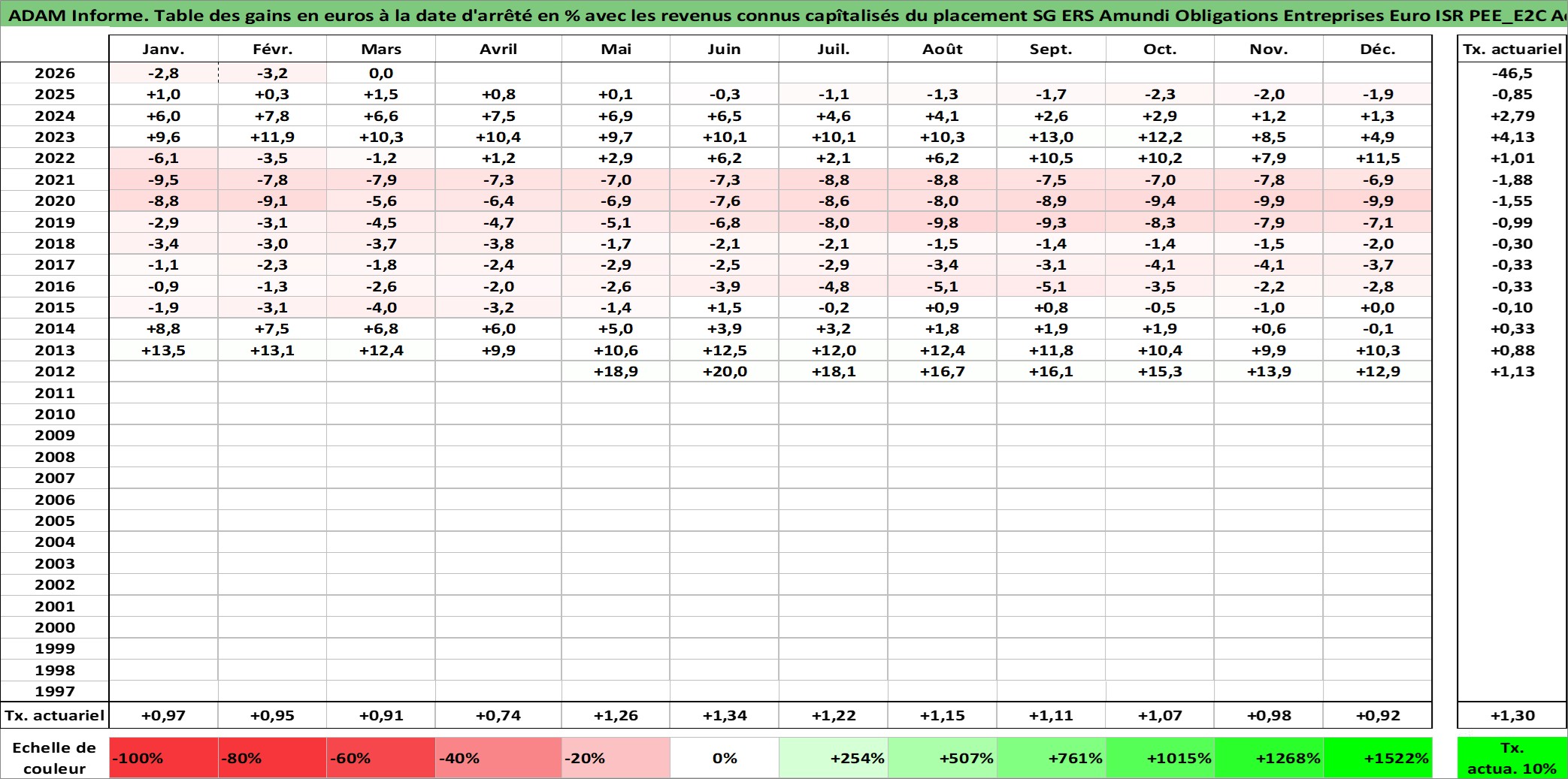 Site dédié aux investisseursPage dédiée sur site financeAnalyse des valorisations hebdomadaires du fonds SG ERS Amundi Obligations Entreprises Euro ISR PEE_E2C Acc. Cet actif est cote en EUR. Les valorisations couvrent les semaines 2012W21 a 2026W13. Les revenus de cet actif financier sont pris en compte depuis la semaine 2012W21. La note ESG de cet actif n'est pas connue.