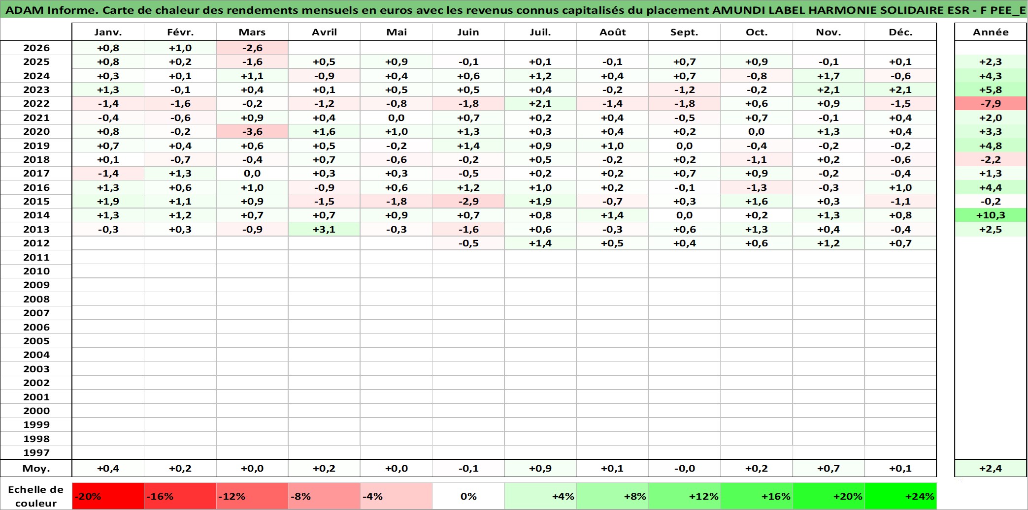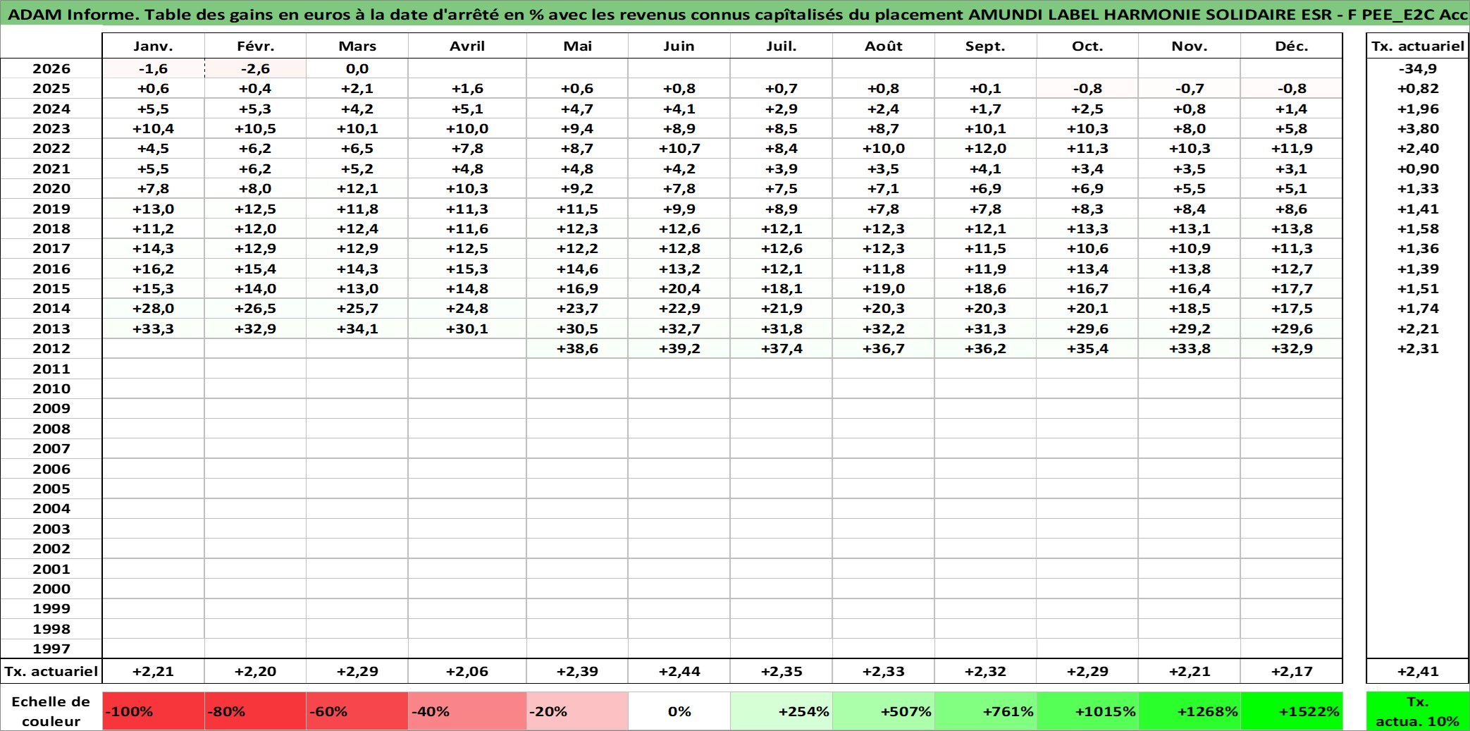 Site dédié aux investisseursPage dédiée sur site financeAnalyse des valorisations hebdomadaires du fonds AMUNDI LABEL HARMONIE SOLIDAIRE ESR - F PEE_E2C Acc. Cet actif est cote en EUR. Les valorisations couvrent les semaines 2012W21 a 2026W13. Les revenus de cet actif financier sont pris en compte depuis la semaine 2012W21. La note ESG de cet actif n'est pas connue.
