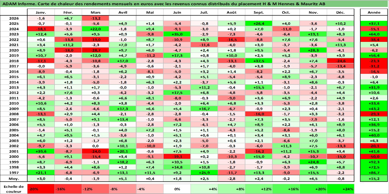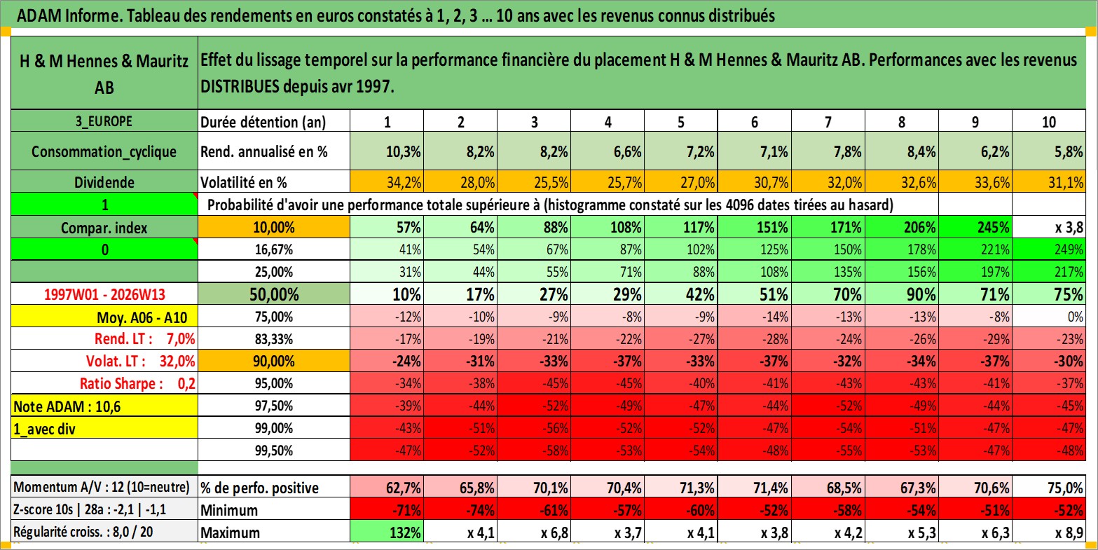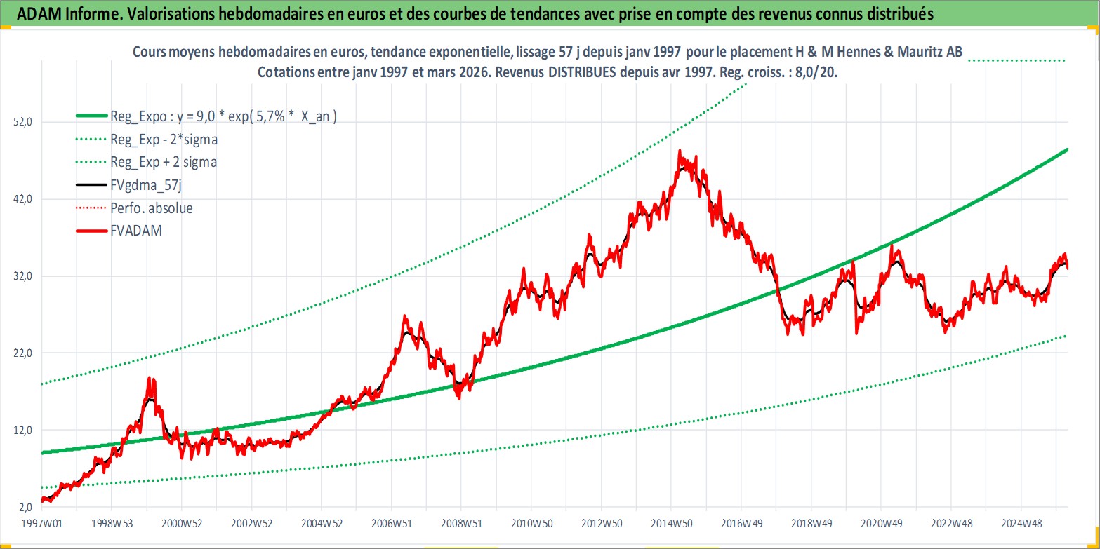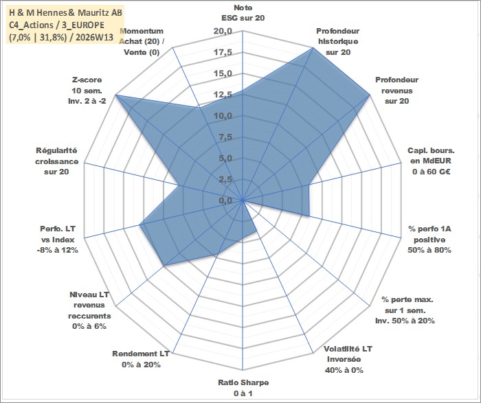 Site dédié aux investisseursPage dédiée sur site financeAnalyse des valorisations hebdomadaires de l'action H & M Hennes & Mauritz AB. Cet actif est cote en SEK. Les valorisations sont en contrevaleur EURO et couvrent les semaines 1997W01 a 2026W13. Les revenus de cet actif financier sont pris en compte depuis la semaine 1997W15. La note globale ESG de cet actif est estimee a 13.0 (apres rebasage entre 0 et 20).