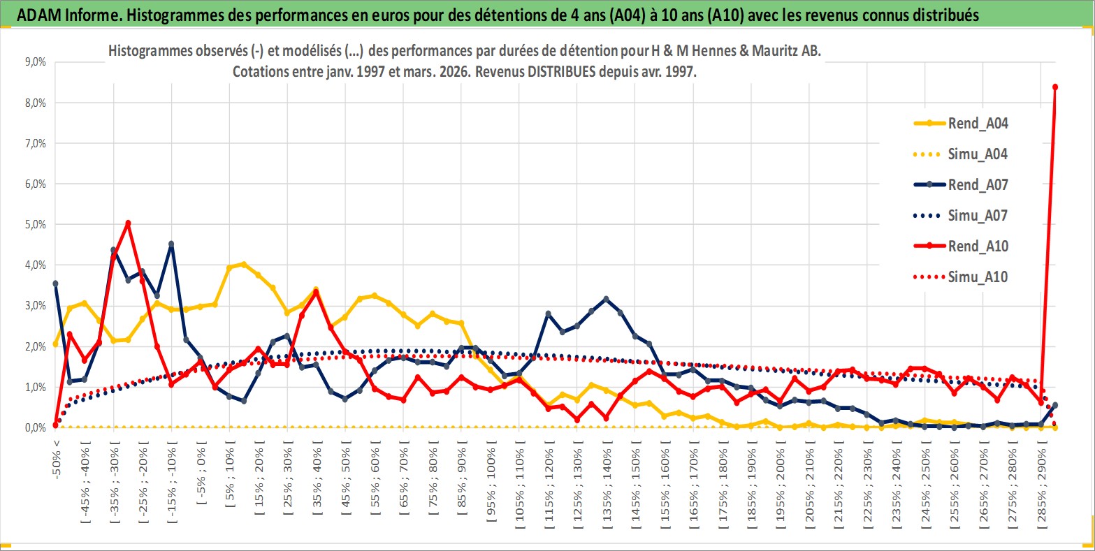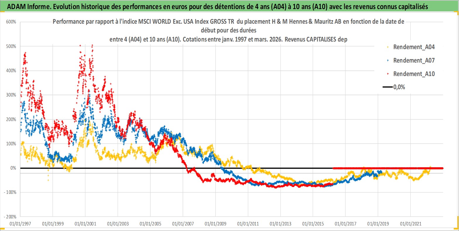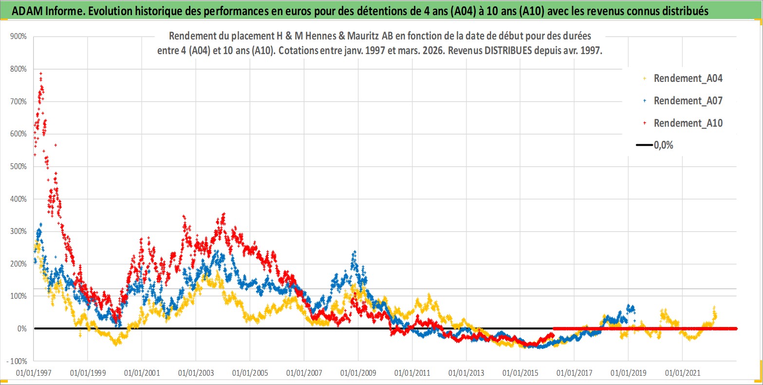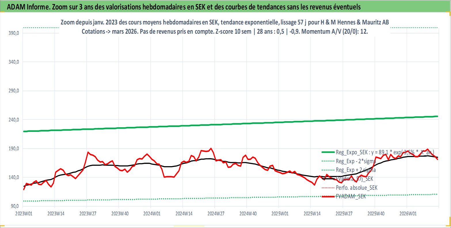 Site dédié aux investisseursPage dédiée sur site financeAnalyse des valorisations hebdomadaires de l'action H & M Hennes & Mauritz AB. Cet actif est cote en SEK. Les valorisations sont en contrevaleur EURO et couvrent les semaines 1997W01 a 2026W13. Les revenus de cet actif financier sont pris en compte depuis la semaine 1997W15. La note globale ESG de cet actif est estimee a 13.0 (apres rebasage entre 0 et 20).
