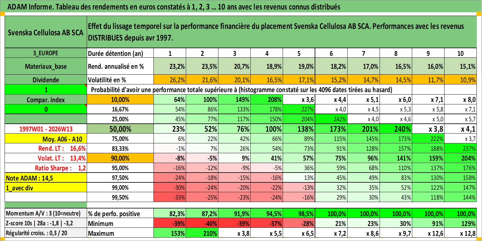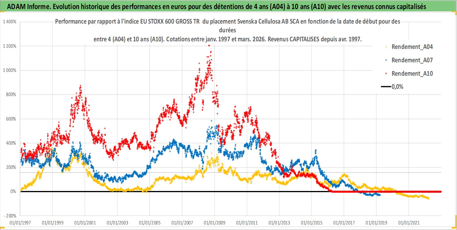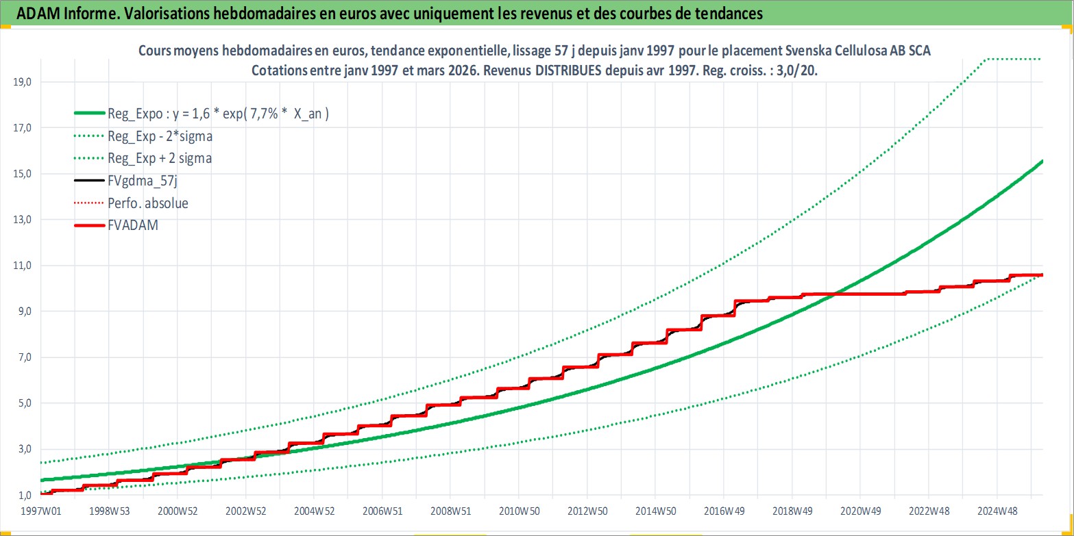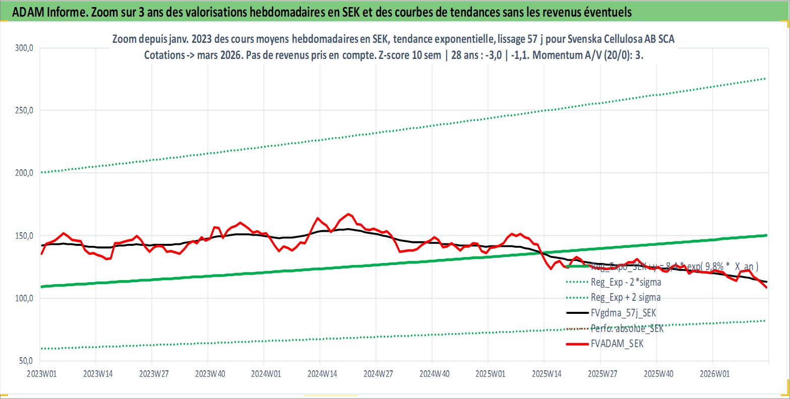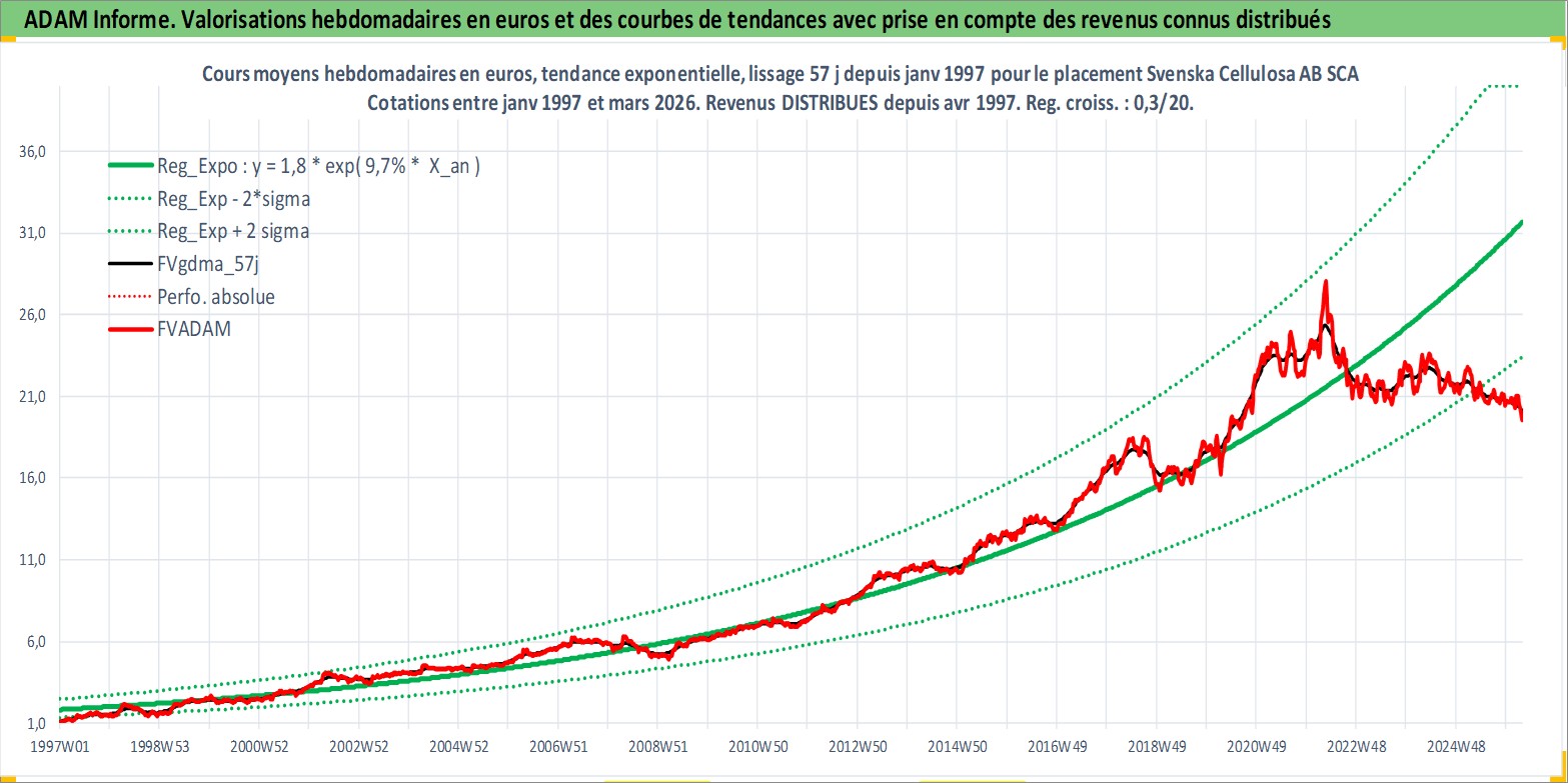 Site dédié aux investisseursPage dédiée sur site financeAnalyse des valorisations hebdomadaires de l'action Svenska Cellulosa AB SCA. Cet actif est cote en SEK. Les valorisations sont en contrevaleur EURO et couvrent les semaines 1997W01 a 2026W13. Les revenus de cet actif financier sont pris en compte depuis la semaine 1997W18. La note globale ESG de cet actif est estimee a 11.0 (apres rebasage entre 0 et 20).