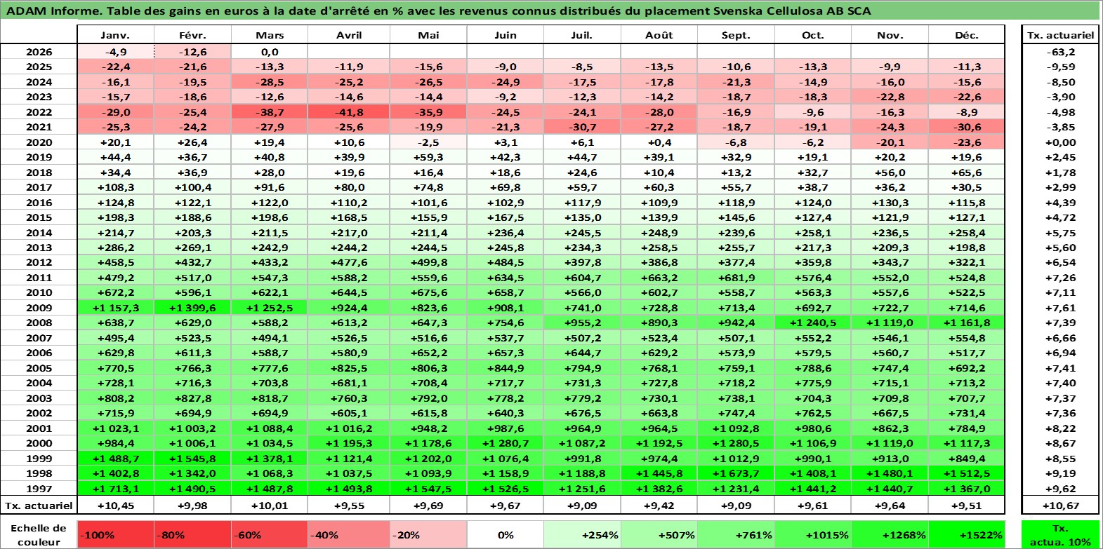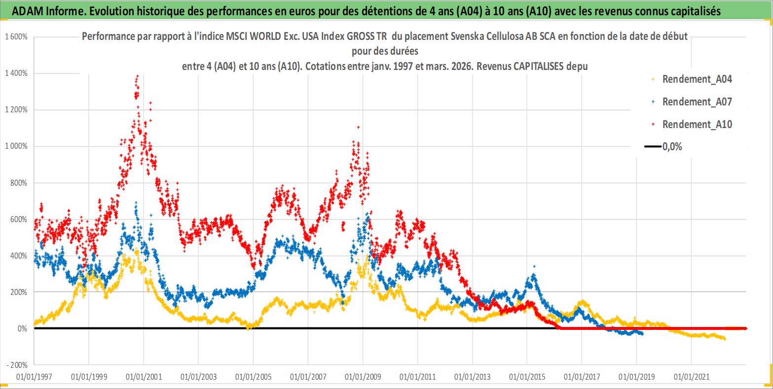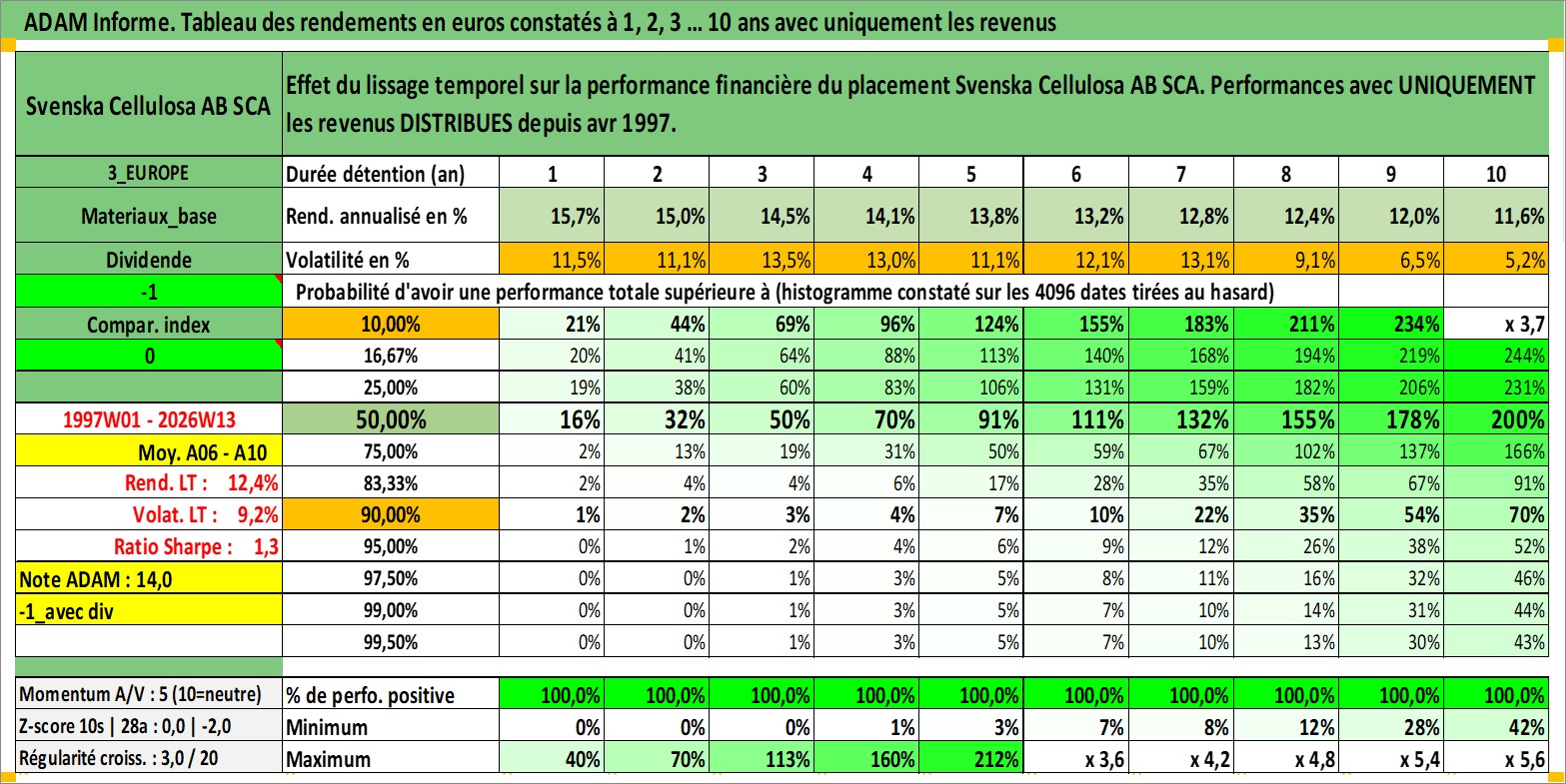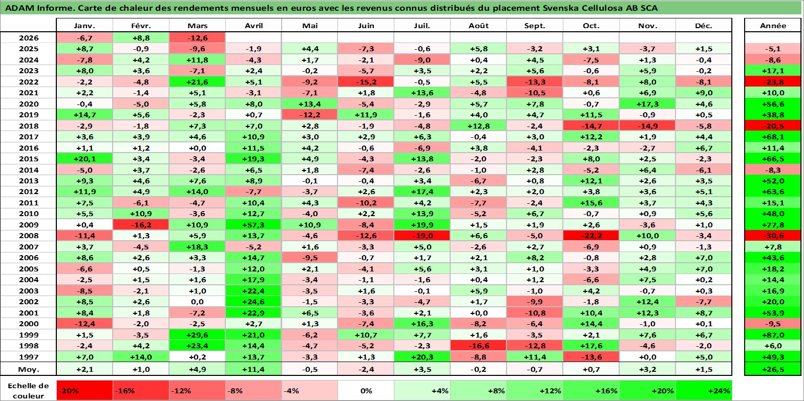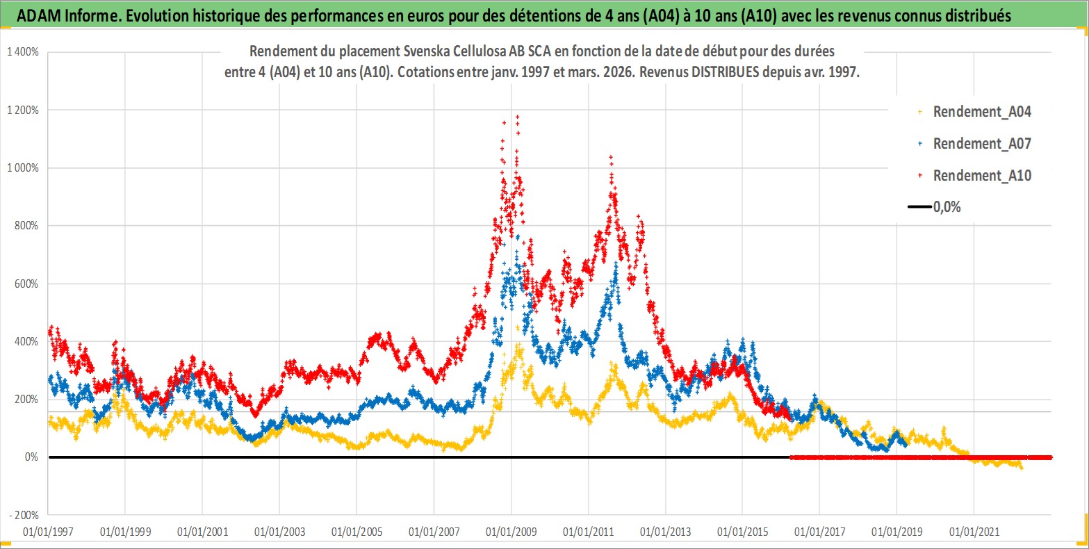 Site dédié aux investisseursPage dédiée sur site financeAnalyse des valorisations hebdomadaires de l'action Svenska Cellulosa AB SCA. Cet actif est cote en SEK. Les valorisations sont en contrevaleur EURO et couvrent les semaines 1997W01 a 2026W13. Les revenus de cet actif financier sont pris en compte depuis la semaine 1997W18. La note globale ESG de cet actif est estimee a 11.0 (apres rebasage entre 0 et 20).