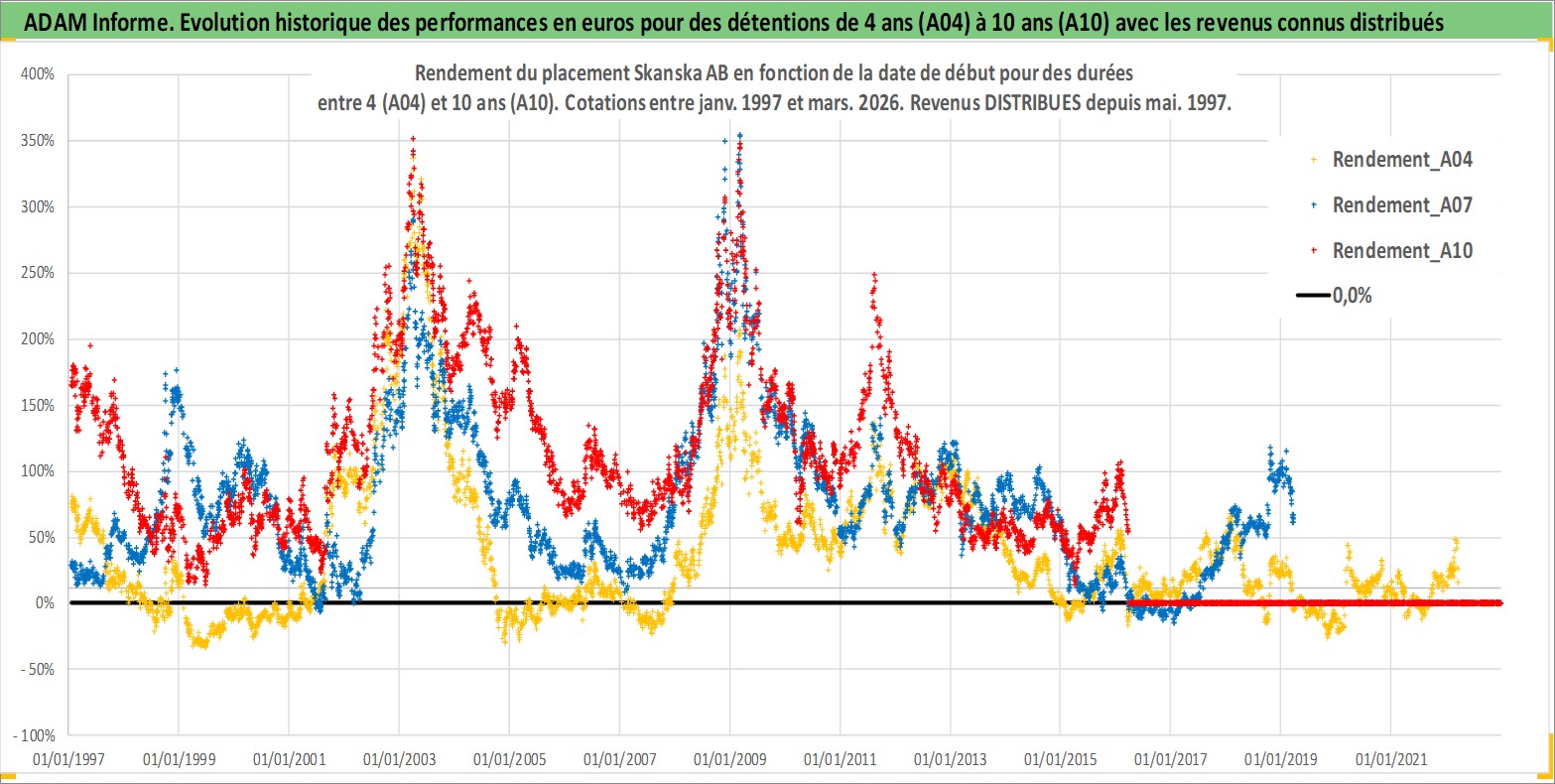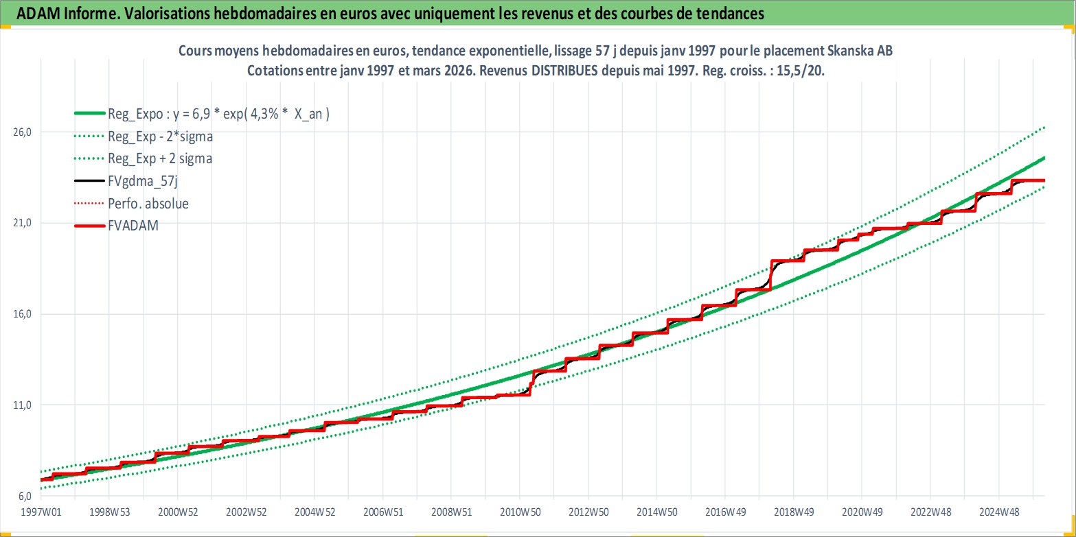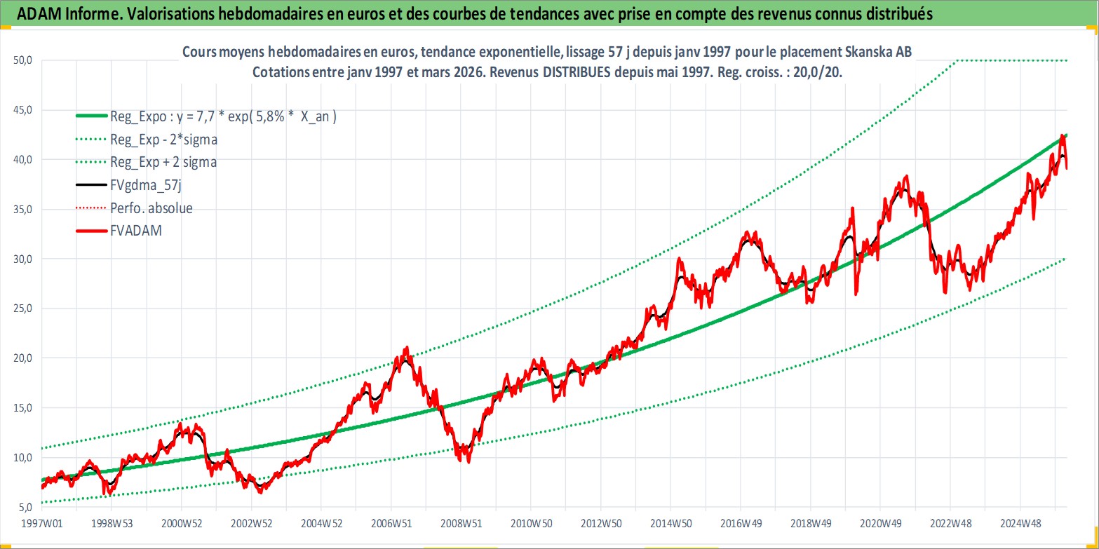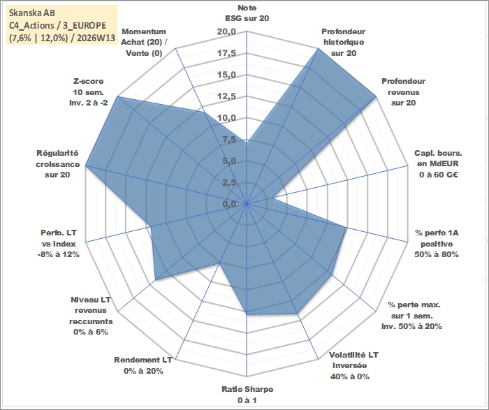 Site dédié aux investisseursPage dédiée sur site financeAnalyse des valorisations hebdomadaires de l'action Skanska AB. Cet actif est cote en SEK. Les valorisations sont en contrevaleur EURO et couvrent les semaines 1997W01 a 2026W13. Les revenus de cet actif financier sont pris en compte depuis la semaine 1997W19. La note globale ESG de cet actif est estimee a 7.0 (apres rebasage entre 0 et 20).