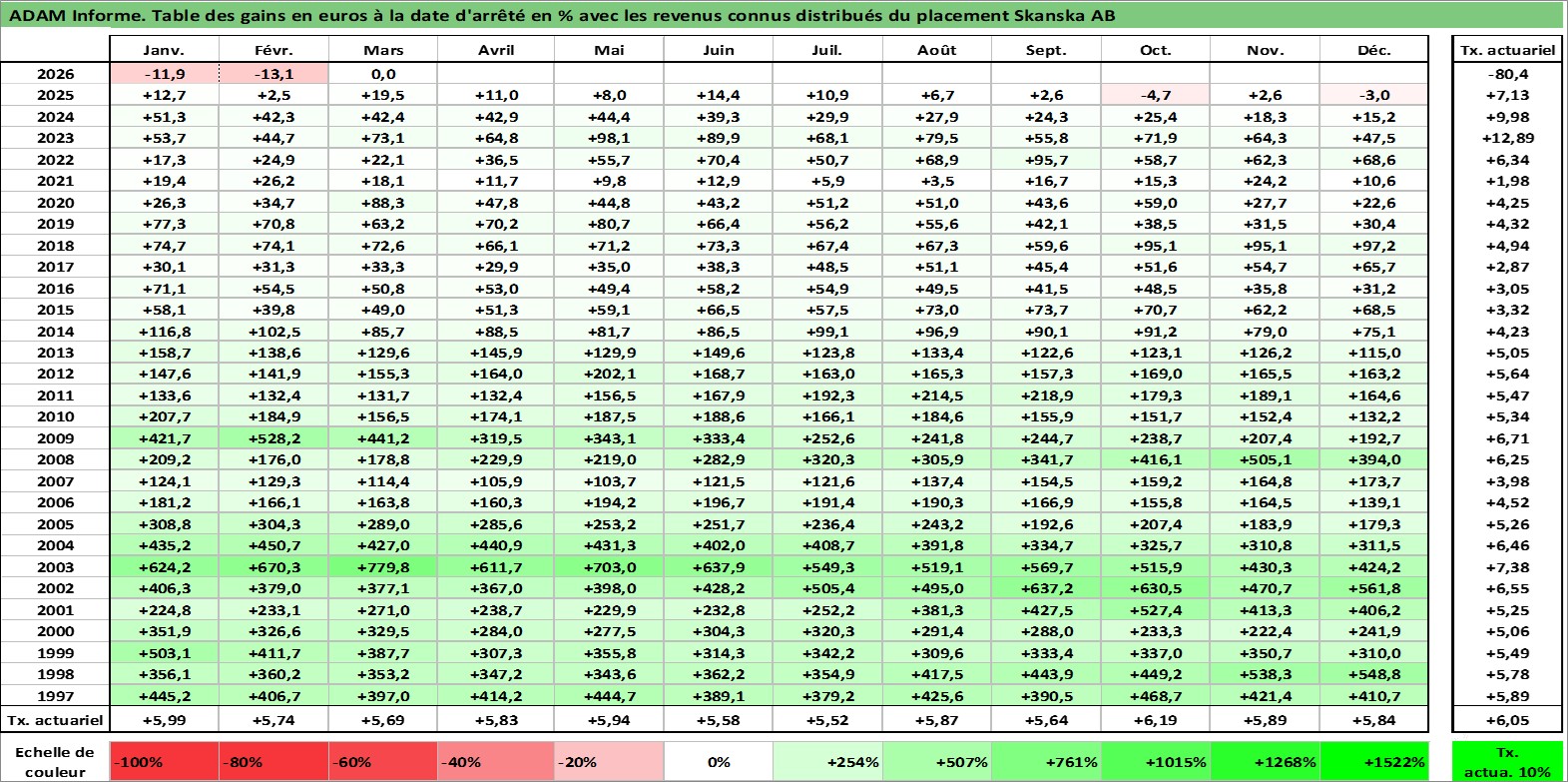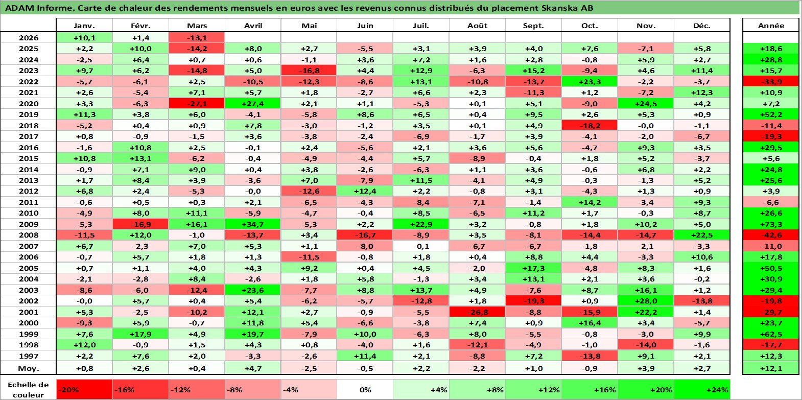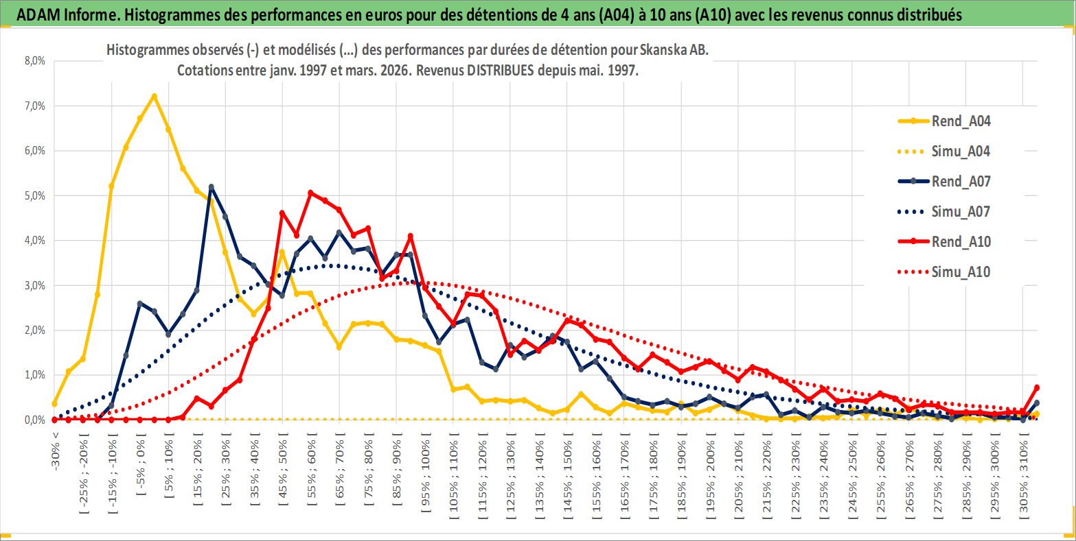 Site dédié aux investisseursPage dédiée sur site financeAnalyse des valorisations hebdomadaires de l'action Skanska AB. Cet actif est cote en SEK. Les valorisations sont en contrevaleur EURO et couvrent les semaines 1997W01 a 2026W13. Les revenus de cet actif financier sont pris en compte depuis la semaine 1997W19. La note globale ESG de cet actif est estimee a 7.0 (apres rebasage entre 0 et 20).