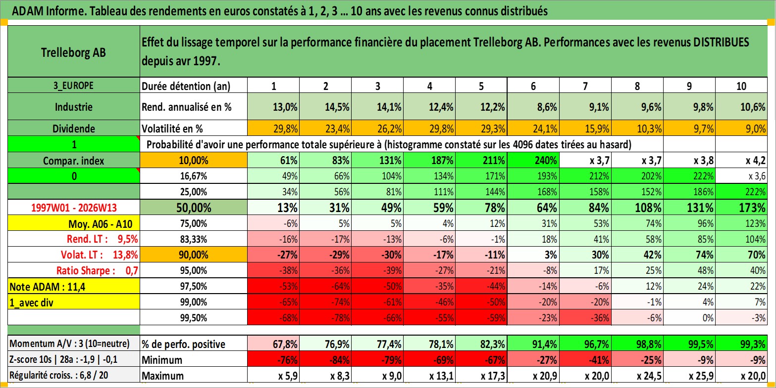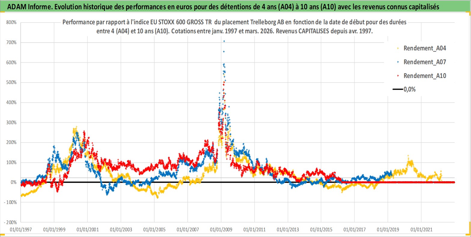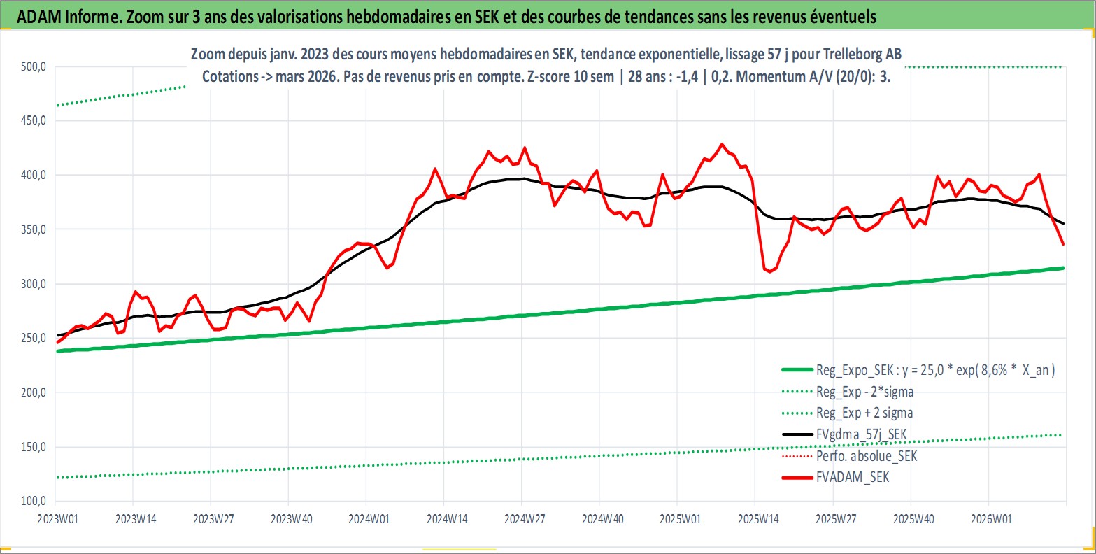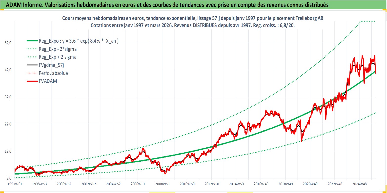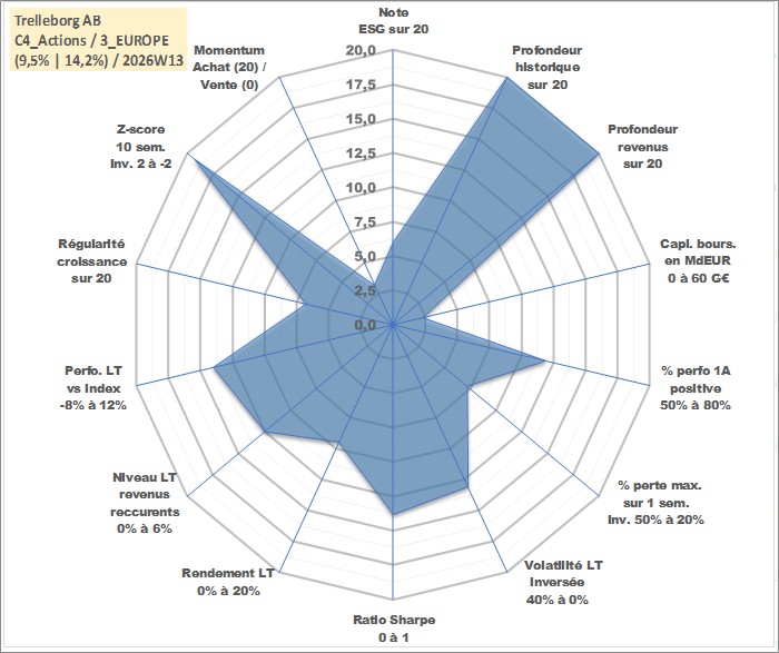 Site dédié aux investisseursPage dédiée sur site financeAnalyse des valorisations hebdomadaires de l'action Trelleborg AB. Cet actif est cote en SEK. Les valorisations sont en contrevaleur EURO et couvrent les semaines 1997W01 a 2026W13. Les revenus de cet actif financier sont pris en compte depuis la semaine 1997W18. La note globale ESG de cet actif est estimee a 6.0 (apres rebasage entre 0 et 20).
