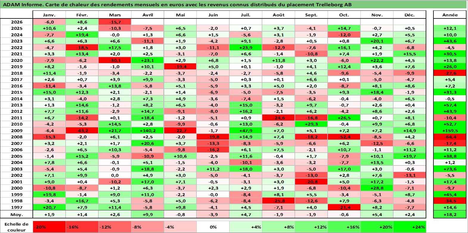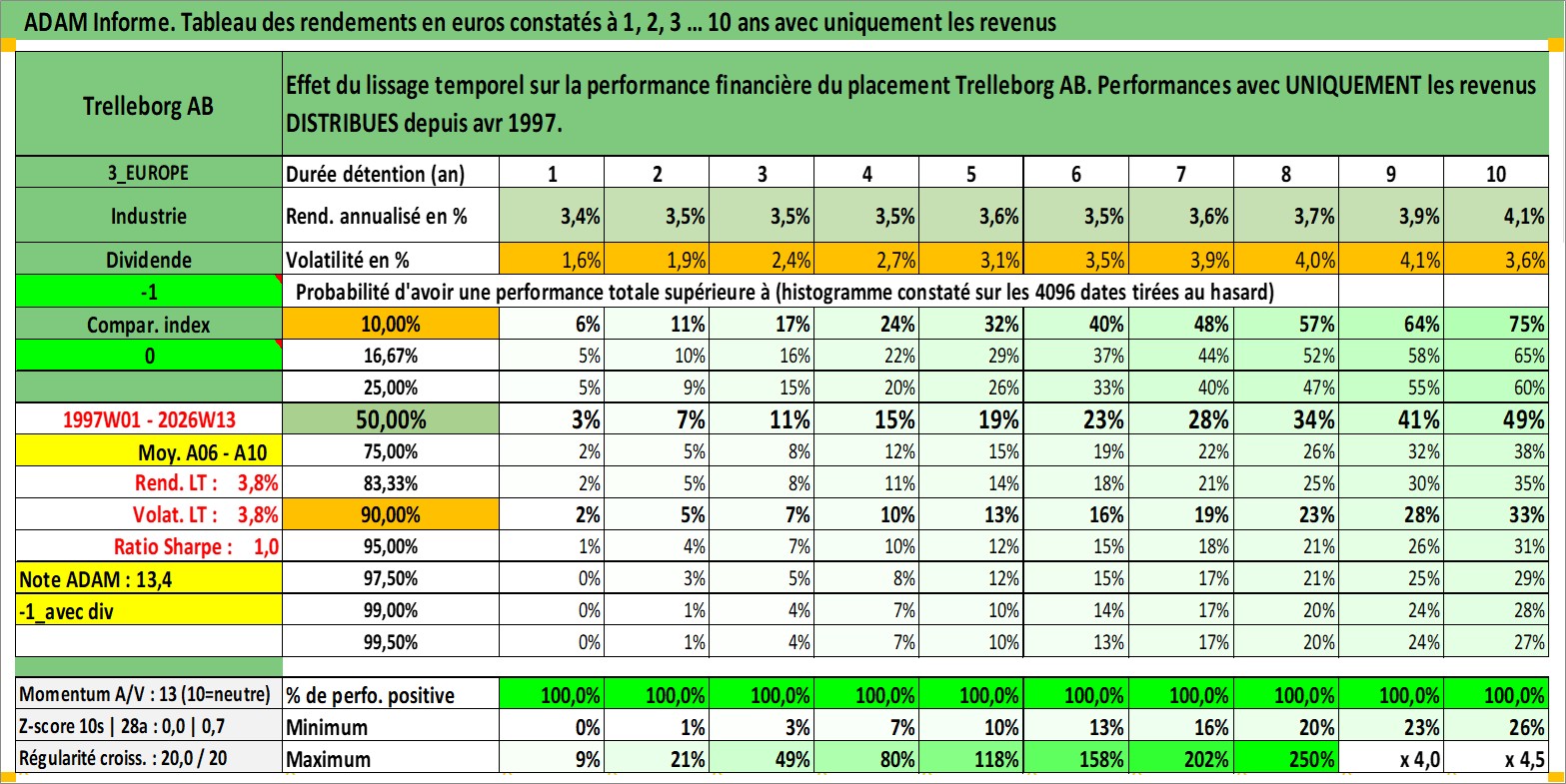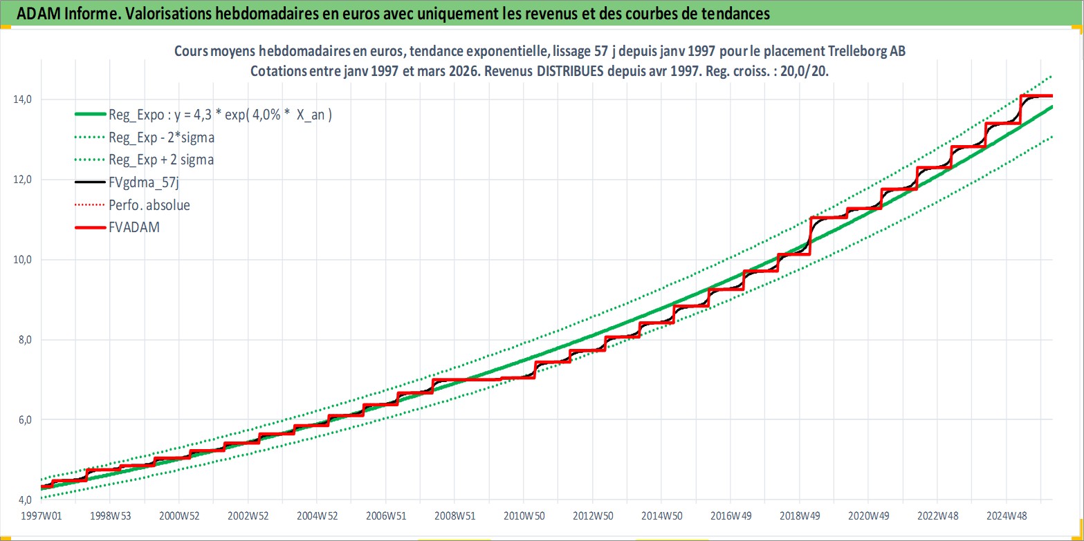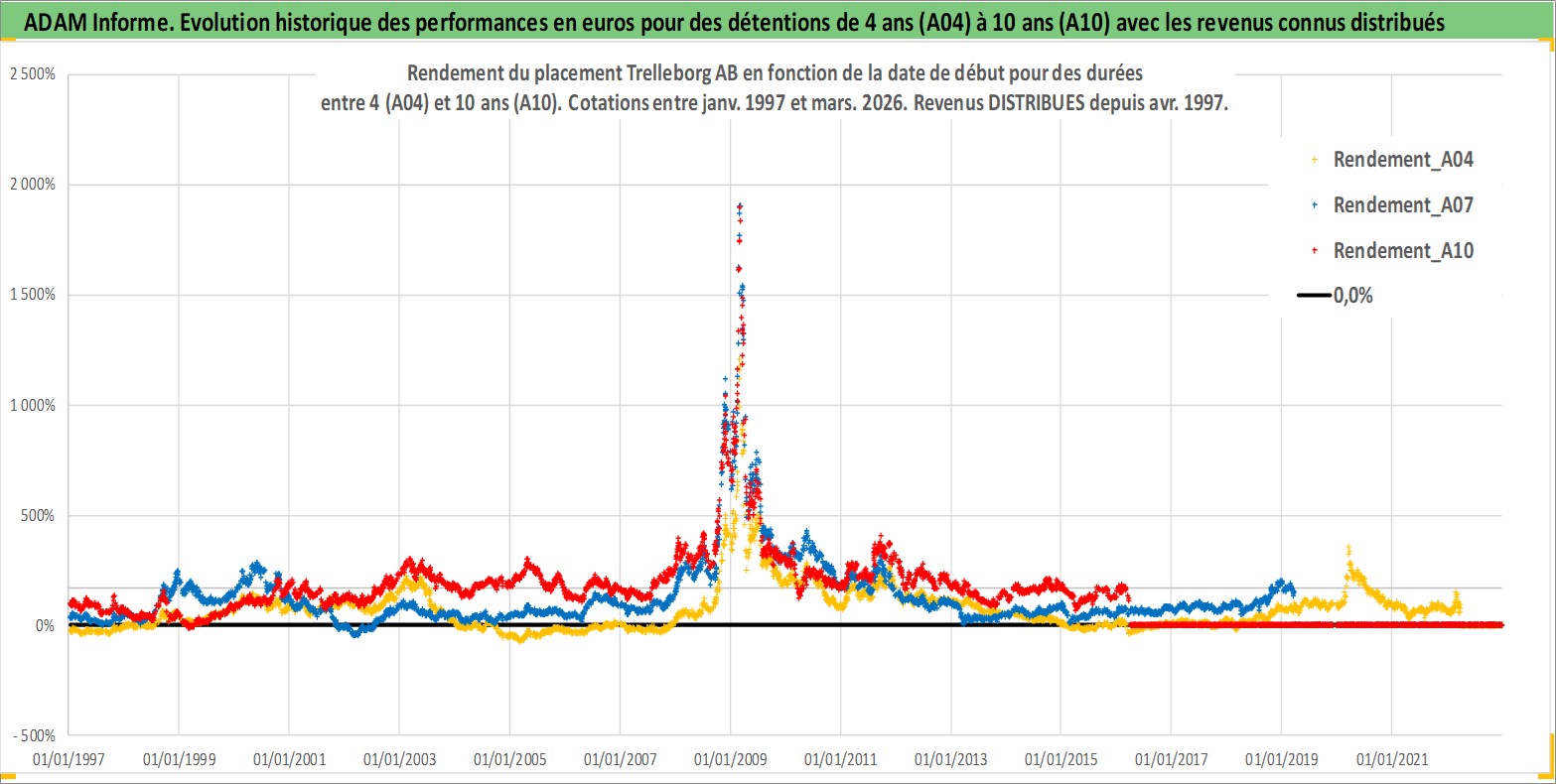Site dédié aux investisseursPage dédiée sur site financeAnalyse des valorisations hebdomadaires de l'action Trelleborg AB. Cet actif est cote en SEK. Les valorisations sont en contrevaleur EURO et couvrent les semaines 1997W01 a 2026W13. Les revenus de cet actif financier sont pris en compte depuis la semaine 1997W18. La note globale ESG de cet actif est estimee a 6.0 (apres rebasage entre 0 et 20).