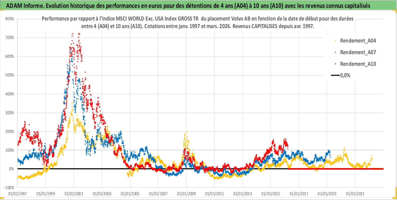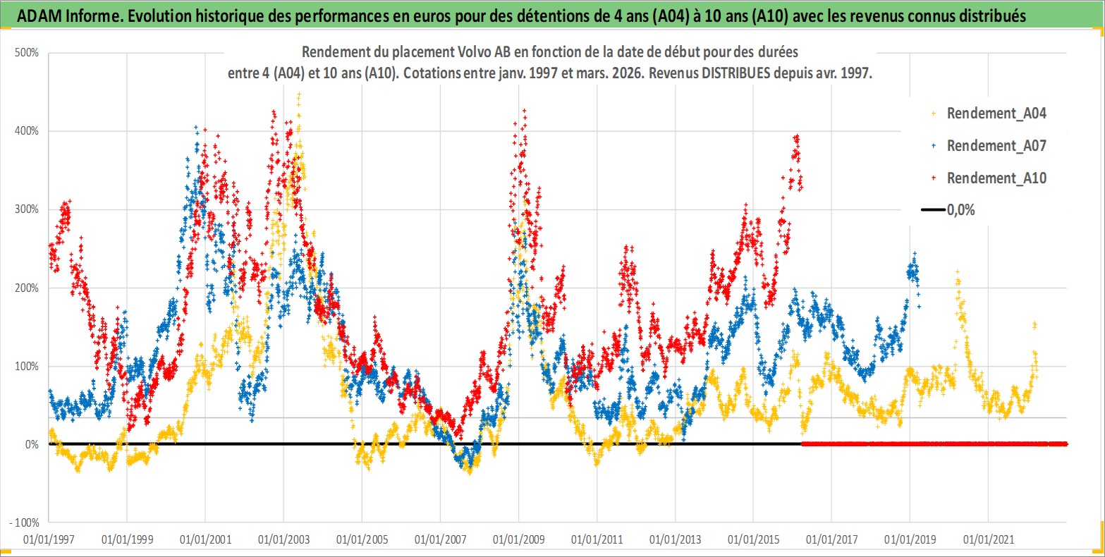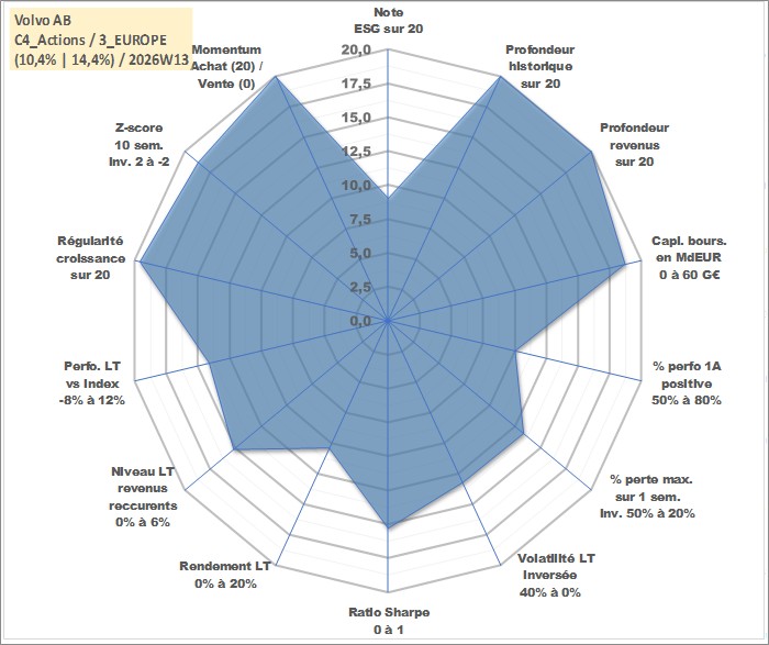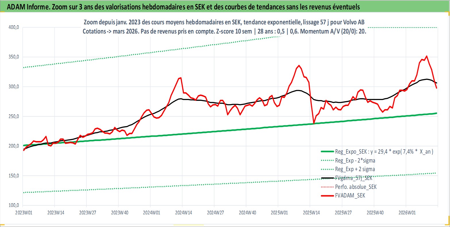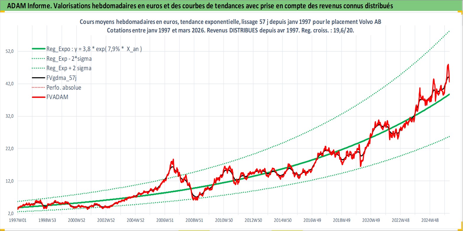 Site dédié aux investisseursPage dédiée sur site financeAnalyse des valorisations hebdomadaires de l'action Volvo AB. Cet actif est cote en SEK. Les valorisations sont en contrevaleur EURO et couvrent les semaines 1997W01 a 2026W13. Les revenus de cet actif financier sont pris en compte depuis la semaine 1997W17. La note globale ESG de cet actif est estimee a 9.0 (apres rebasage entre 0 et 20).