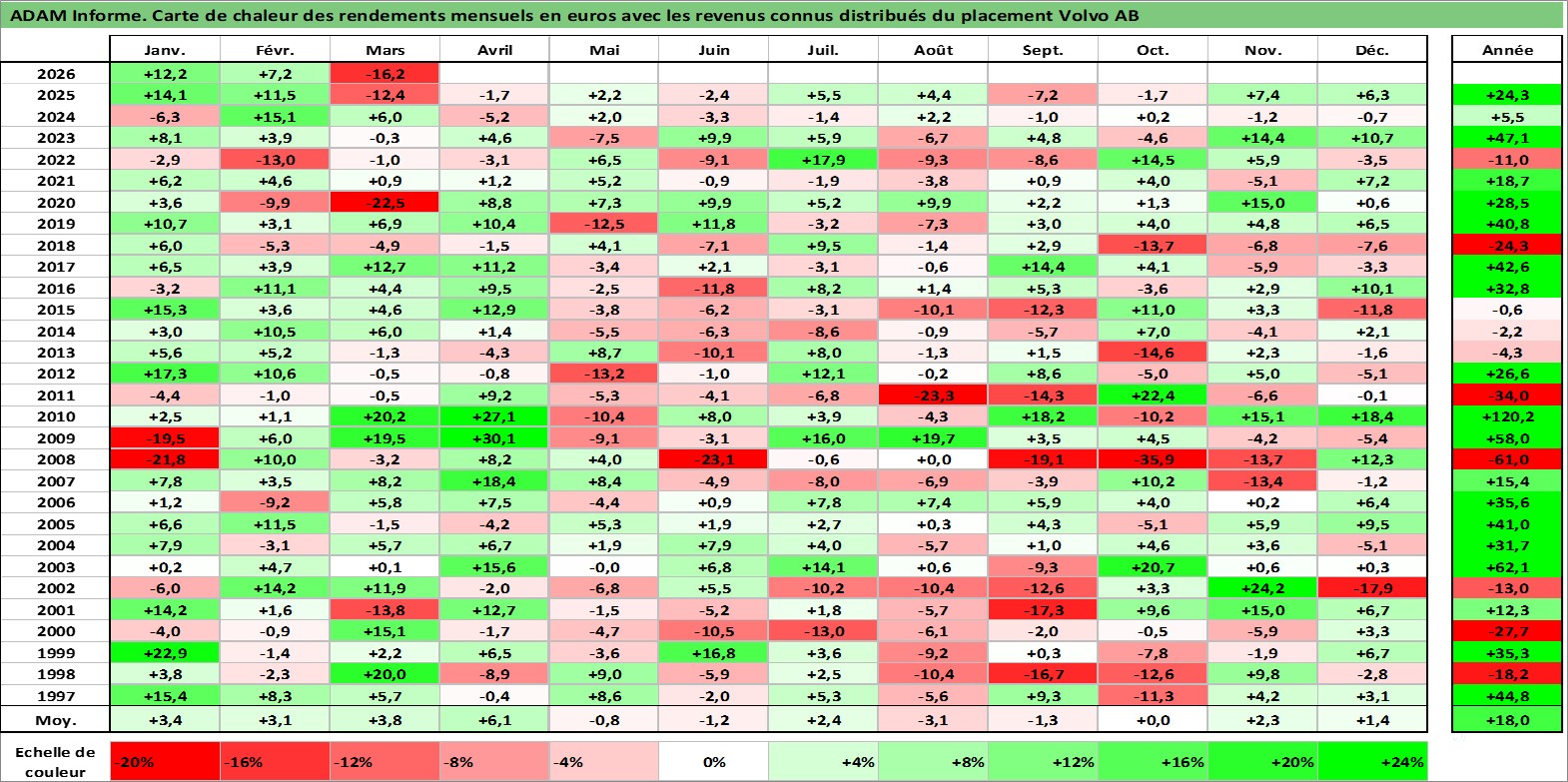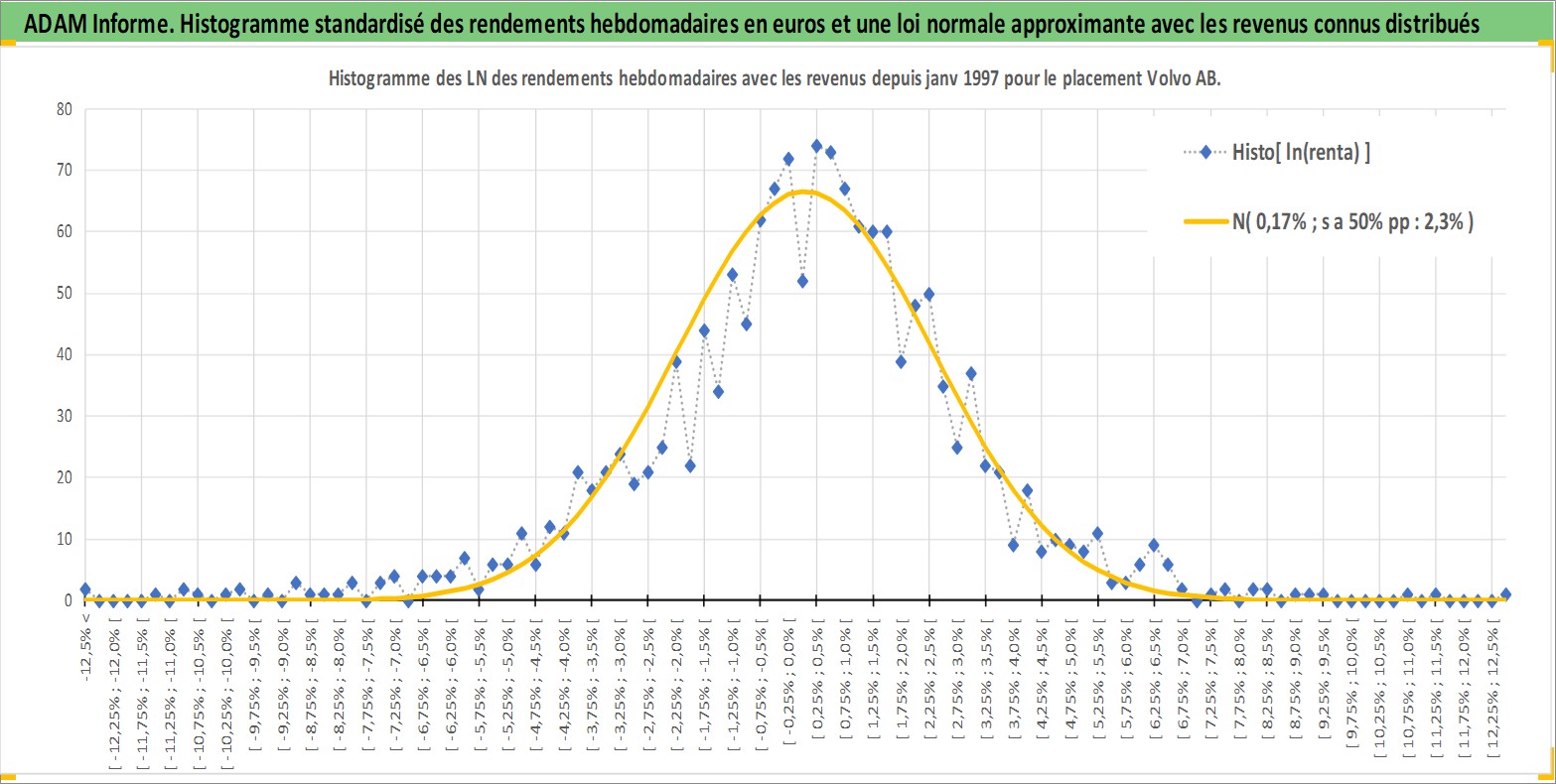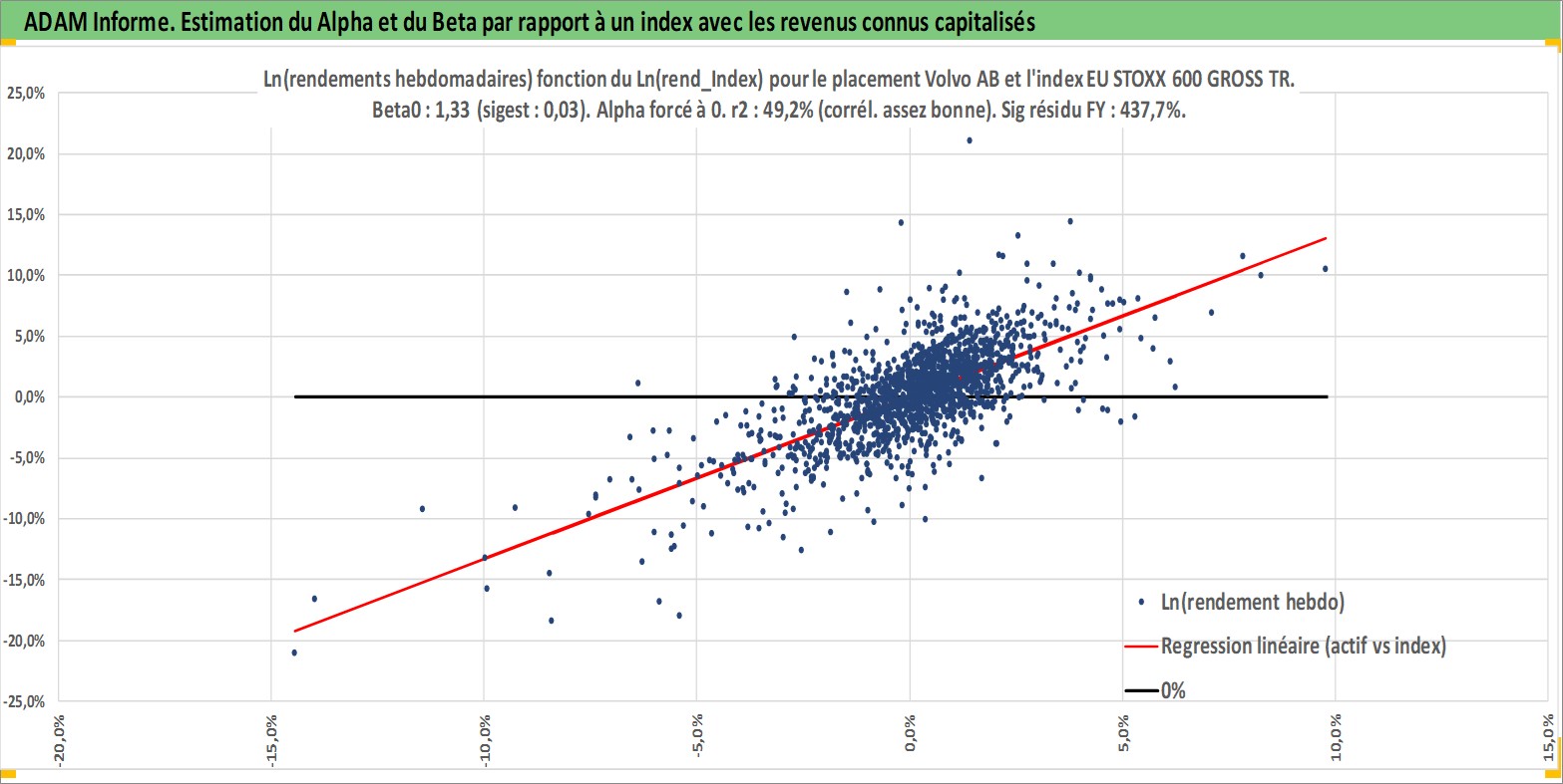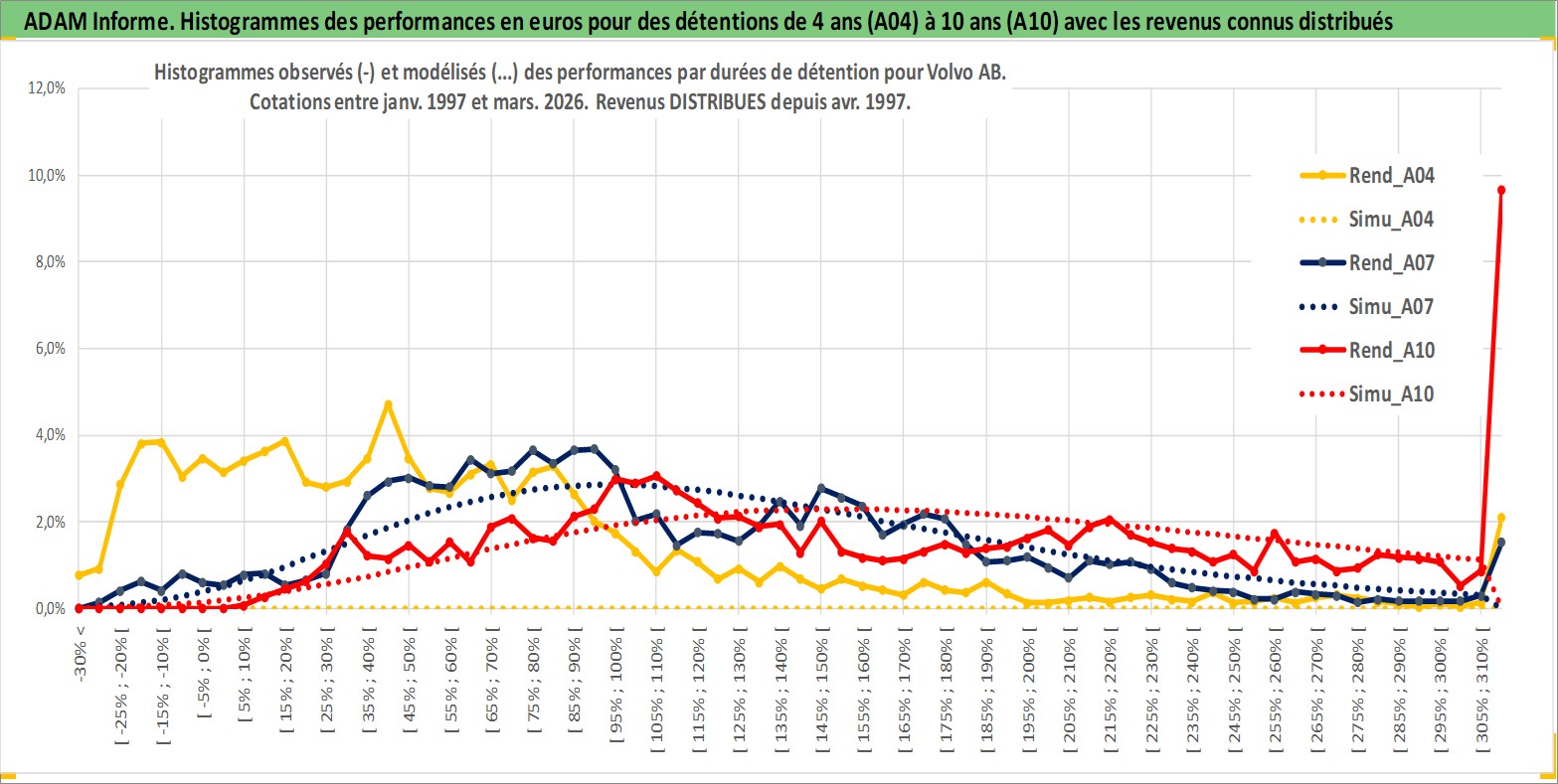 Site dédié aux investisseursPage dédiée sur site financeAnalyse des valorisations hebdomadaires de l'action Volvo AB. Cet actif est cote en SEK. Les valorisations sont en contrevaleur EURO et couvrent les semaines 1997W01 a 2026W13. Les revenus de cet actif financier sont pris en compte depuis la semaine 1997W17. La note globale ESG de cet actif est estimee a 9.0 (apres rebasage entre 0 et 20).