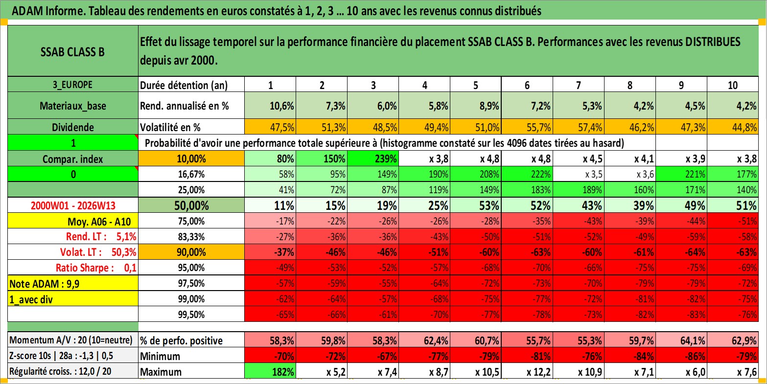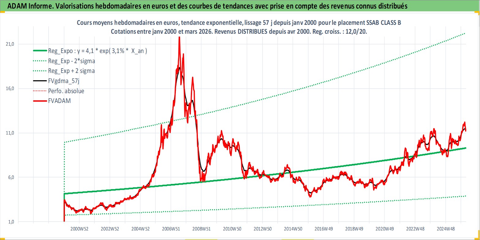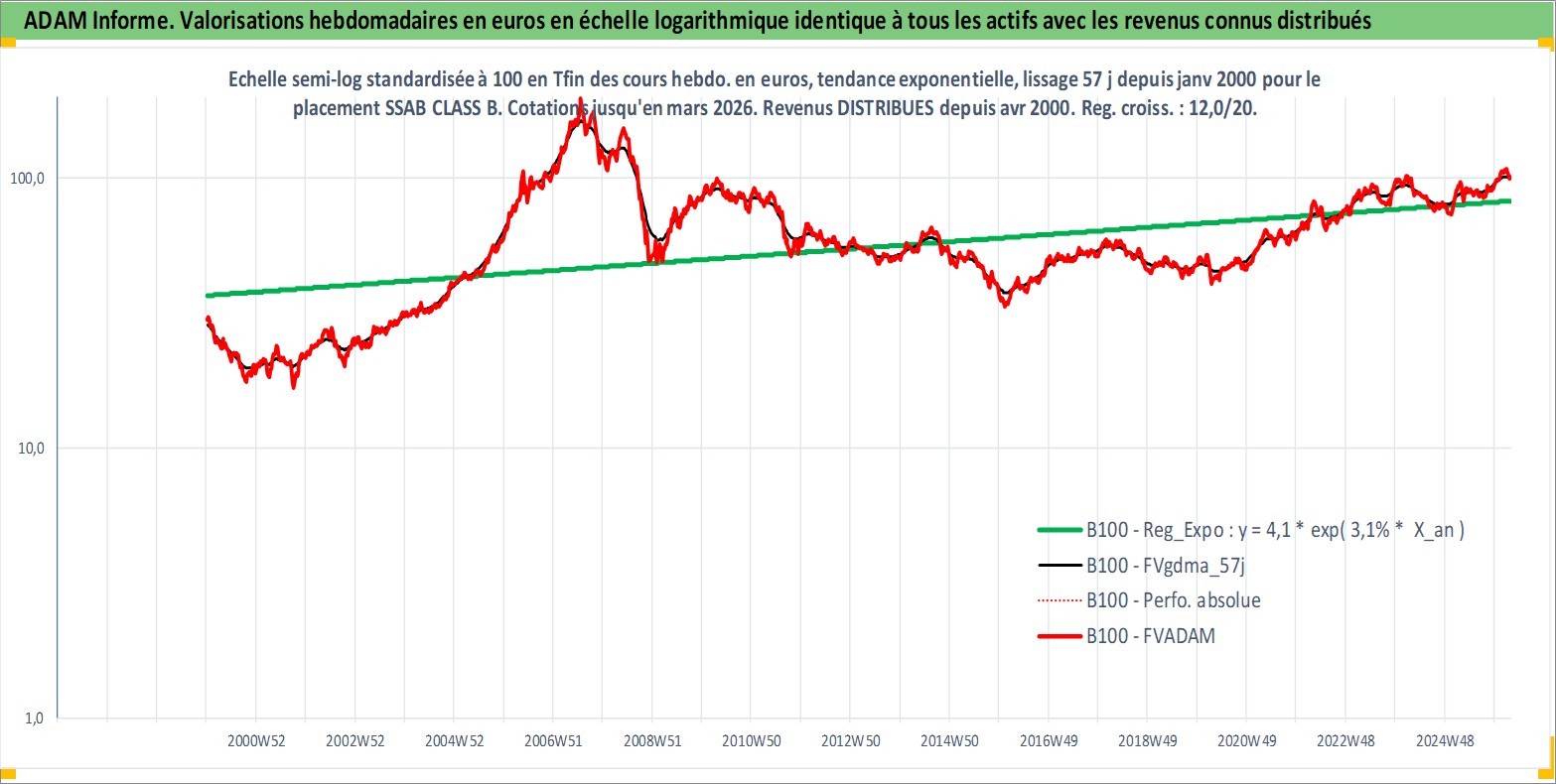 Site dédié aux investisseursPage dédiée sur site financeAnalyse des valorisations hebdomadaires de l'action SSAB CLASS B. Cet actif est cote en SEK. Les valorisations sont en contrevaleur EURO et couvrent les semaines 2000W01 a 2026W13. Les revenus de cet actif financier sont pris en compte depuis la semaine 2000W17. La note ESG de cet actif n'est pas connue.