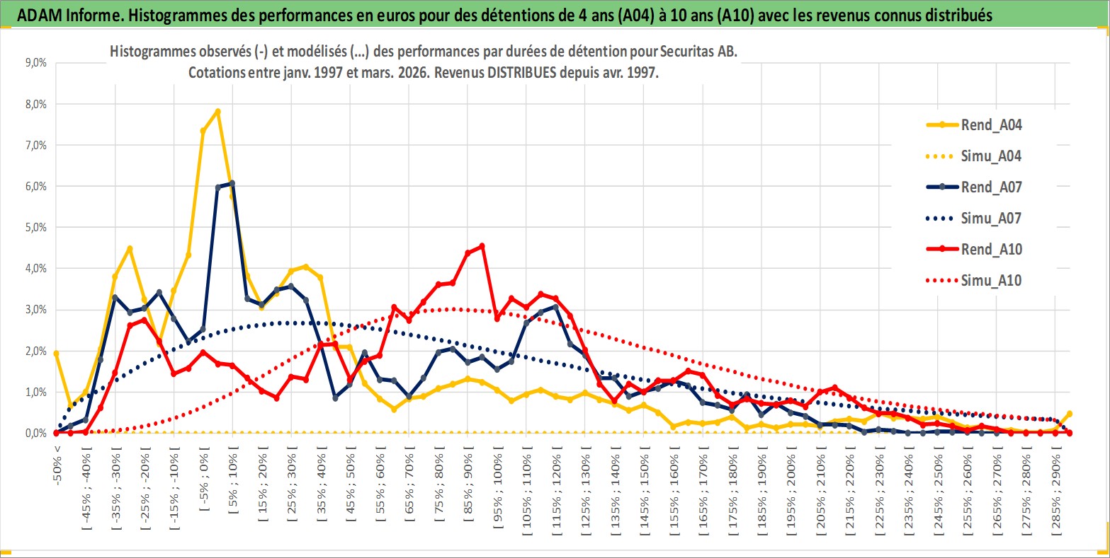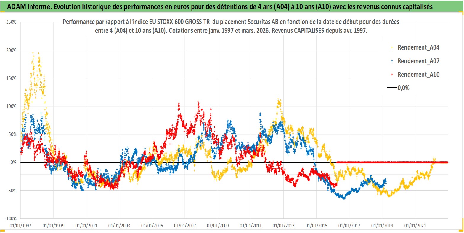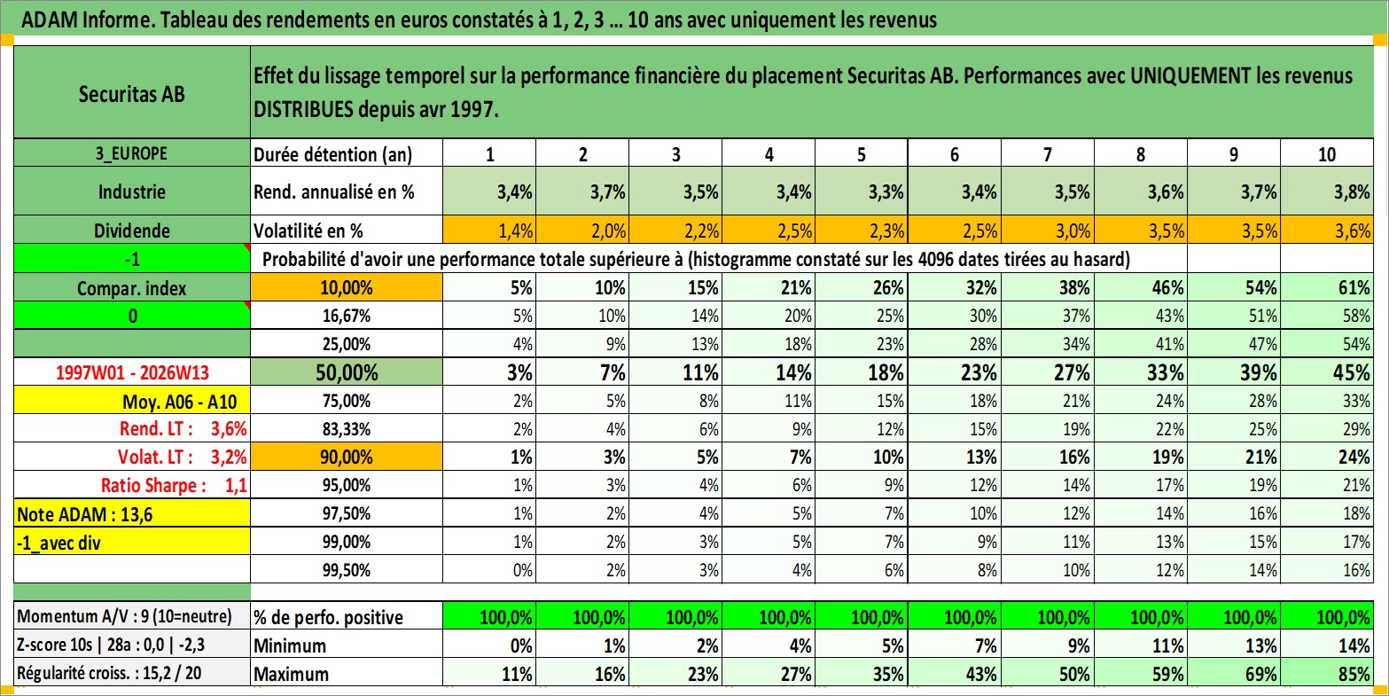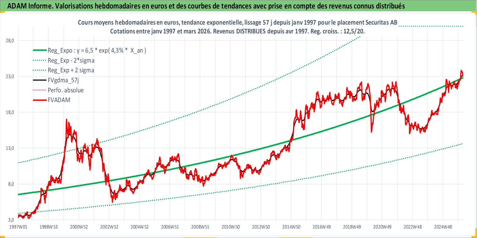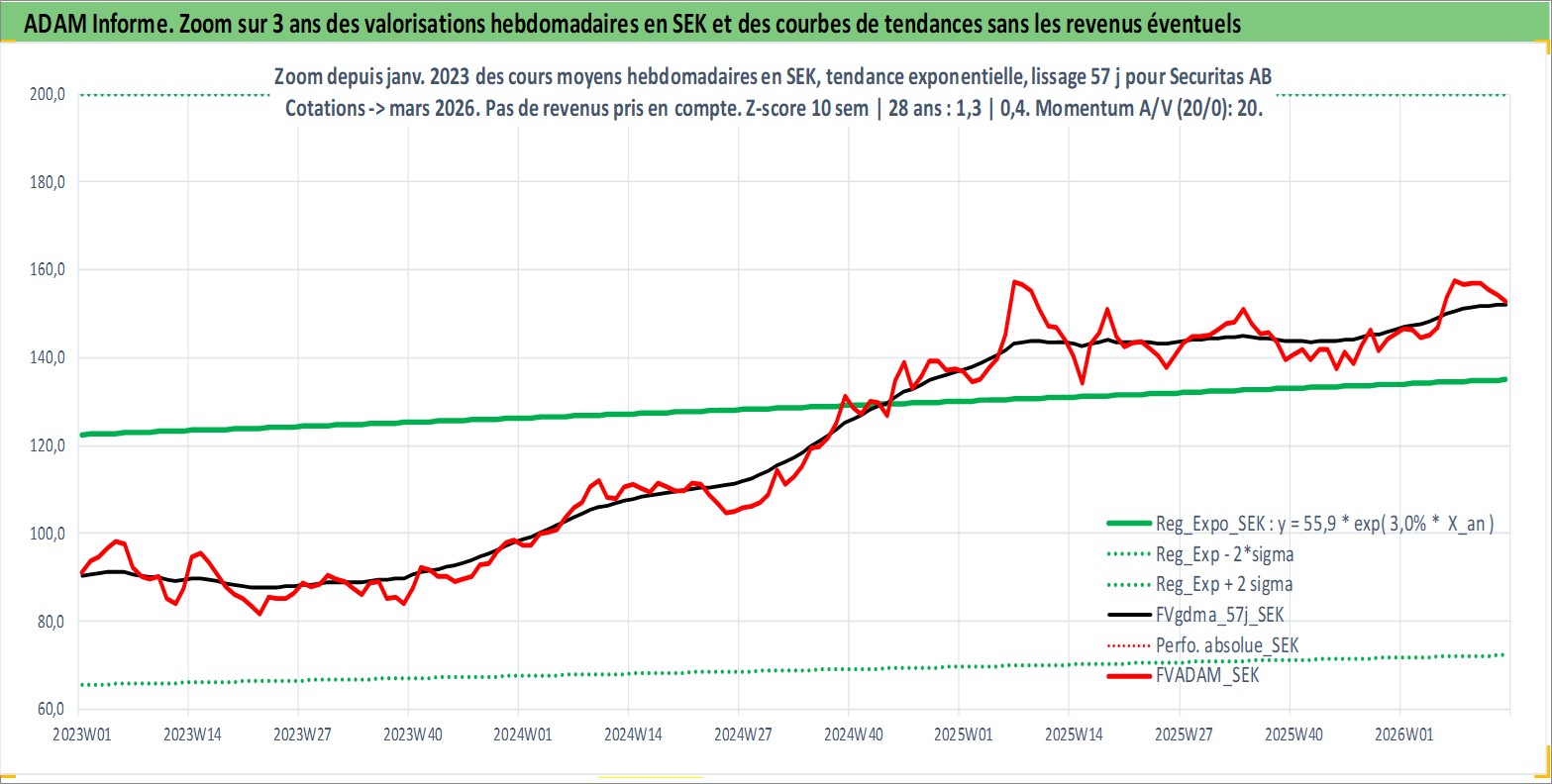 Site dédié aux investisseursPage dédiée sur site financeAnalyse des valorisations hebdomadaires de l'action Securitas AB. Cet actif est cote en SEK. Les valorisations sont en contrevaleur EURO et couvrent les semaines 1997W01 a 2026W13. Les revenus de cet actif financier sont pris en compte depuis la semaine 1997W18. La note globale ESG de cet actif est estimee a 15.0 (apres rebasage entre 0 et 20).